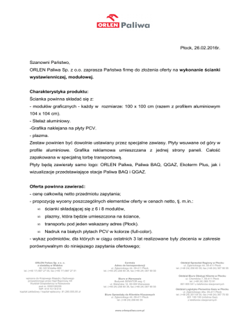 Płock, 26.02.2016r. COPCO Polska Sp. z o.o. Szanowni Państwo, ORLEN Paliwa Sp. z o.o. zaprasza Państwa firmę do złożenia oferty na wykonanie ścianki wystawienniczej, modułowej. Charakterystyka produktu: Ścianka powinna składać się z: - modułów graficznych - każdy w rozmiarze: 100 x 100 cm (razem z profilem aluminiowym 104 x 104 cm). - Stelaż aluminiowy. -Grafika naklejana na płyty PCV. - plazma. Zestaw powinien być dowolnie ustawiany przez specjalne zawiasy. Płyty wsuwane od góry w profile aluminiowe. Grafika reklamowa umieszczana z jednej strony paneli. Całość zapakowana w specjalną torbę transportową. Płyty będą zawierały samo logo: ORLEN Paliwa, Paliwa BAQ, QGAZ, Ekoterm Plus, jak i wizualizacje przedstawiające stacje Paliwa BAQ i QGAZ. Oferta powinna zawierać: - cenę całkowitą netto przedmiotu zapytania; - propozycję wyceny poszczególnych elementów oferty w cenach netto, tj. m.in.: • ścianki składającej się z 6 i 8 modułów, • plazmy, która będzie umieszczona na ściance, • transportu pod jeden wskazany adres (Płock). • Nadruk na białych płytach PCV w kolorze (full-color). - wykaz podmiotów, dla których w ciągu ostatnich 3 lat realizowane były zlecenia w zakresie porównywalnym do niniejszego zapytania ofertowego; ORLEN Paliwa Sp. z o. o. z siedzibą w Widełce 36-145 Widełka 869 tel. (+48 17) 867 27 00, fax (+48 17) 867 27 01 Centrala Adres do korespondencji ul. Zglenickiego 44, 09-411 Płock tel. (+48 24) 256 60 39, fax (+48 24) 367 90 55 wpisana do Krajowego Rejestru Sądowego prowadzonego przez Sąd Rejonowy XII Wydział Gospodarczy w Rzeszowie pod nr: 0000126258 NIP: 814-10-19-514 kapitał zakładowy / kapitał wpłacony: 81.280.000,00 zł Biuro w Warszawie Budynek SENATOR seg. C ul. Bielańska 12, 00-085 Warszawa tel. (+48 24) 256 60 39, fax (+48 24) 367 90 55 Biuro Sprzedaży do Klientów Kluczowych ul. Zglenickiego 44, 09-411 Płock tel. (+48 24) 256 60 39 www.orlenpaliwa.com.pl Oddział Sprzedaż Regiony w Płocku ul. Zglenickiego 44, 09-411 Płock tel. (+48 24) 256 60 39, fax (+48 24) 367 90 55 Oddział Biuro Obsługi Klienta w Płocku ul. Chemików 7, 09-411 Płock tel. (+48 24) 365 72 91 801 805 541 z telefonów stacjonarnych Oddział Logistyka Pierwotna Gazu w Płocku ul. Zglenickiego 46a, 09-411 Płock tel. (+48 24) 201 04 00, fax (+48 24) 367 70 50 801 100 100 (infolinia Gaz) z telefonów stacjonarnych - wizualizację przedmiotu zapytania i potwierdzenie zgodności proponowanego rozwiązania ze specyfikacją; - aktualny dokument dotyczący reprezentacji Spółki – KRS lub CEIDG; - podpisane oświadczenie oferenta dot. zachowania tajemnicy (dokument na CONNECT); - akceptacja OWZ –Ogólnych warunków Zamówienia (dokument na CONNECT). Termin realizacji: 14.03.2016r. Termin ważności składanej oferty 60 dni. Termin płatności 30 dni od daty otrzymania faktury Więcej informacji uzyskacie Państwo logując się na platformie zakupowej CONNECT. Wszelkie pytania proszę kierować przez zakładkę pytania/ odpowiedzi. Termin składania ofert: 02.03.2016r. godz. 11:00 UWAGA! Oferty można składać jedynie za pośrednictwem Platformy Zakupowej CONNECT, logując się do systemu na https://connect.orlen.pl/ Z poważaniem, Natalia Bartosiewicz-Burdanowska 603 394 696 Oferent ponosi wszystkie koszty związane z przygotowaniem i złożeniem oferty i nie przysługuje mu prawo roszczenia o zwrot tych kosztów. „ORLEN Paliwa Sp. z o.o. zastrzega sobie prawo do dowolnego wyboru podmiotu/podmiotów, z którymi będą prowadzone negocjacje w odniesieniu do części lub całości zakresu złożonych odpowiedzi oraz do zawarcia umowy z więcej niż jednym Dostawcą wyłonionym w drodze negocjacji, przy czym zakres umowy może obejmować całość lub część zakresu złożonej oferty/odpowiedzi na zapytanie. ORLEN Paliwa Sp. z o.o. zastrzega sobie prawo do odwołania lub zamknięcia procesu wyboru Dostawcy i odstąpienia od negocjacji bez podania przyczyn. Z tego tytułu podmiotowi do którego skierowano zapytanie nie przysługują żadne roszczenia wobec ORLEN Paliwa Sp. z o.o. Niniejsze zapytanie stanowi zaproszenie do negocjacji w rozumieniu art. 72 k.c., a tym samym nie mają zastosowania przepisy dotyczące oferty w rozumieniu art. 66 i n. k.c.” ORLEN Paliwa Sp. z o. o. z siedzibą w Widełce 36-145 Widełka 869 tel. (+48 17) 867 27 00, fax (+48 17) 867 27 01 Centrala Adres do korespondencji ul. Zglenickiego 44, 09-411 Płock tel. (+48 24) 256 60 39, fax (+48 24) 367 90 55 wpisana do Krajowego Rejestru Sądowego prowadzonego przez Sąd Rejonowy XII Wydział Gospodarczy w Rzeszowie pod nr: 0000126258 NIP: 814-10-19-514 kapitał zakładowy / kapitał wpłacony: 81.280.000,00 zł Biuro w Warszawie Budynek SENATOR seg. C ul. Bielańska 12, 00-085 Warszawa tel. (+48 24) 256 60 39, fax (+48 24) 367 90 55 Biuro Sprzedaży do Klientów Kluczowych ul. Zglenickiego 44, 09-411 Płock tel. (+48 24) 256 60 39 www.orlenpaliwa.com.pl Oddział Sprzedaż Regiony w Płocku ul. Zglenickiego 44, 09-411 Płock tel. (+48 24) 256 60 39, fax (+48 24) 367 90 55 Oddział Biuro Obsługi Klienta w Płocku ul. Chemików 7, 09-411 Płock tel. (+48 24) 365 72 91 801 805 541 z telefonów stacjonarnych Oddział Logistyka Pierwotna Gazu w Płocku ul. Zglenickiego 46a, 09-411 Płock tel. (+48 24) 201 04 00, fax (+48 24) 367 70 50 801 100 100 (infolinia Gaz) z telefonów stacjonarnych