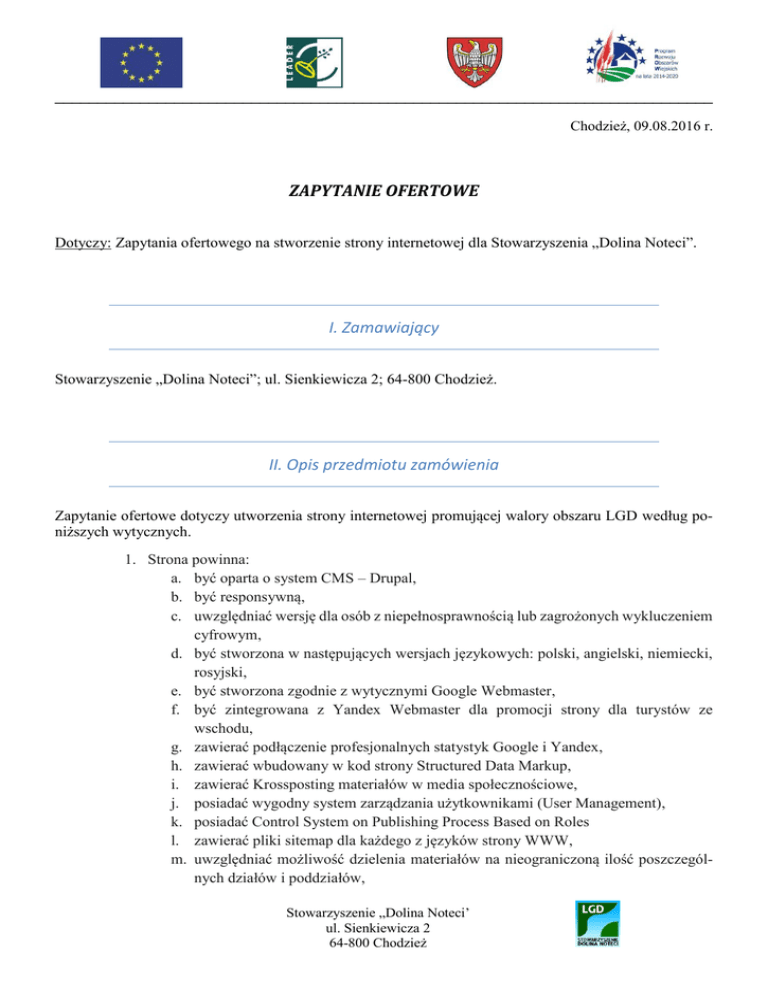 ¯¯¯¯¯¯¯¯¯¯¯¯¯¯¯¯¯¯¯¯¯¯¯¯¯¯¯¯¯¯¯¯¯¯¯¯¯¯¯¯¯¯¯¯¯¯¯¯¯¯¯¯¯¯¯¯¯¯¯¯¯¯¯¯¯¯¯¯¯¯¯¯¯¯¯¯¯ Chodzież, 09.08.2016 r. ZAPYTANIE OFERTOWE Dotyczy: Zapytania ofertowego na stworzenie strony internetowej dla Stowarzyszenia „Dolina Noteci”. I. Zamawiający Stowarzyszenie „Dolina Noteci”; ul. Sienkiewicza 2; 64-800 Chodzież. II. Opis przedmiotu zamówienia Zapytanie ofertowe dotyczy utworzenia strony internetowej promującej walory obszaru LGD według poniższych wytycznych. 1. Strona powinna: a. być oparta o system CMS – Drupal, b. być responsywną, c. uwzględniać wersję dla osób z niepełnosprawnością lub zagrożonych wykluczeniem cyfrowym, d. być stworzona w następujących wersjach językowych: polski, angielski, niemiecki, rosyjski, e. być stworzona zgodnie z wytycznymi Google Webmaster, f. być zintegrowana z Yandex Webmaster dla promocji strony dla turystów ze wschodu, g. zawierać podłączenie profesjonalnych statystyk Google i Yandex, h. zawierać wbudowany w kod strony Structured Data Markup, i. zawierać Krossposting materiałów w media społecznościowe, j. posiadać wygodny system zarządzania użytkownikami (User Management), k. posiadać Control System on Publishing Process Based on Roles l. zawierać pliki sitemap dla każdego z języków strony WWW, m. uwzględniać możliwość dzielenia materiałów na nieograniczoną ilość poszczególnych działów i poddziałów, Stowarzyszenie „Dolina Noteci’ ul. Sienkiewicza 2 64-800 Chodzież ¯¯¯¯¯¯¯¯¯¯¯¯¯¯¯¯¯¯¯¯¯¯¯¯¯¯¯¯¯¯¯¯¯¯¯¯¯¯¯¯¯¯¯¯¯¯¯¯¯¯¯¯¯¯¯¯¯¯¯¯¯¯¯¯¯¯¯¯¯¯¯¯¯¯¯¯¯ n. dostarczać użytkownikowi możliwie pełną informację o turystycznych atrakcjach obszaru, o. zawierać informacje na temat dziedzictwa kulturowego, takie jak legendy chodzieskie, historie miasta i jego mieszkańców w dziejach kraju związanych z obszarem i rolą miasta w ich życiu, p. zawierać kalendarz wydarzeń - informację o ciekawych sportowych i rozrywkowych wydarzeniach, które będą miały miejsce w najbliższym czasie z wyszczególnieniem czasu planowanej imprezy i kosztach udziału w niej – aktualizowany na bieżąco, q. zawierać informacje o wydarzeniach które już się odbyły, r. zawierać dokładny opis szlaków turystycznych z informacjami na temat złożoności trasy, czasu na jej pokonanie, długości oraz grupy docelowej. Szlaki winny być podzielone na kategorie, na przykład: piesze, rowerowe, kajakowe itp. Przy trasach powinna być informacja na temat obiektów lub legend z nią związanych, s. zawierać unikatowe zdjęcia bardzo wysokiej jakości za równo pod względem rozdzielczości jak również treści, t. docierać do szerokiego grona odbiorców, u. zawierać informacje podane w sposób łatwy, ciekawy i przystępny, v. funkcjonować na wszystkich urządzeniach przeznaczonych do obsługi stron www, w. dawać możliwość łatwego zarządzania stroną. 2. Twórca strony powinien zapewnić: a. regularne szkolenie dla pracowników Stowarzyszenia w biurze Stowarzyszenia z tytułu funkcjonowania strony WWW (w cenie projektu), b. wsparcie techniczne strony WWW w okresie co najmniej 2 lat (w cenie projektu), c. wykonanie oryginalnych zdjęć fotograficznych w ilości 100 zdjęć w celu umieszczenia ich jako elementy graficzne strony (w cenie projektu wraz z przekazaniem praw autorskich), d. wsparcie merytoryczne 4 wersji językowych strony (polski, angielski, niemiecki, rosyjski), e. „białą” optymalizację strony dla wyszukiwarek w okresie co najmniej 2 lat, f. napisanie w celu optymalizacji (pozycjonowania) oryginalnych artykułów o Chodzieży i okolicach dla napełnienia strony WWW (z przekazaniem praw autorskich), g. monitoring znaczących wydarzeń turystycznych, sportowych i kulturalnych w Chodzieży w celu pozycjonowania (optymalizacji dla wyszukiwarek) strony WWW (z przekazaniem praw autorskich). III. Miejsce oraz termin składania ofert Ofertę należy złożyć osobiście w terminie do 16.08.2016 r. do godz. 14:00 w biurze Stowarzyszenia „Dolina Noteci”, ul. Sienkiewicza 2, 64-800 Chodzież, lub za pośrednictwem poczty w ww terminie (liczy się data dostarczenia oferty). Oferty złożone po terminie nie będę rozpatrzone. Oferent może przed upływem Stowarzyszenie „Dolina Noteci’ ul. Sienkiewicza 2 64-800 Chodzież ¯¯¯¯¯¯¯¯¯¯¯¯¯¯¯¯¯¯¯¯¯¯¯¯¯¯¯¯¯¯¯¯¯¯¯¯¯¯¯¯¯¯¯¯¯¯¯¯¯¯¯¯¯¯¯¯¯¯¯¯¯¯¯¯¯¯¯¯¯¯¯¯¯¯¯¯¯ terminu składania ofert zmienić lub wycofać swoją ofertę. W toku badania oceny ofert Zamawiający może żądać od oferenta wyjaśnień dotyczących treści złożonej oferty. IV. Kryterium oceny ofert w tym opis sposobu obliczania oferty Waga: cena 80% doświadczenie Zleceniobiorcy 20% V. Sposób przygotowania oferty Ofertę należy przygotować zgodnie ze wzorem załącznika 1 niniejszego zapytania w terminie określonym w p. III. Wraz z ofertą należy złożyć wymagane załączniki, wymienione we wzorze oferty. Oferta powinna być czytelna. Cena powinna obejmować wszystkie koszty przedstawione wyłącznie w złotych polskich w zaokrągleniu do dwóch miejsc po przecinku. VI. Informacje dotyczące wyboru najkorzystniejszej oferty O wyborze najkorzystniejszej oferty Zamawiający zawiadomi niezwłocznie wybrany podmiot, który przesłał prawidłowo sporządzoną ofertę w wyznaczonym przez Zamawiającego terminie zgodnie z pkt. III niniejszego zapytania. Wybrany oferent zostanie zaproszony do podpisania umowy. Jeżeli oferent, którego oferta została wybrana, będzie uchylał się od zawarcia umowy, Zamawiający może wybrać ofertę najkorzystniejszą spośród pozostałych ofert. Stowarzyszenie „Dolina Noteci’ ul. Sienkiewicza 2 64-800 Chodzież ¯¯¯¯¯¯¯¯¯¯¯¯¯¯¯¯¯¯¯¯¯¯¯¯¯¯¯¯¯¯¯¯¯¯¯¯¯¯¯¯¯¯¯¯¯¯¯¯¯¯¯¯¯¯¯¯¯¯¯¯