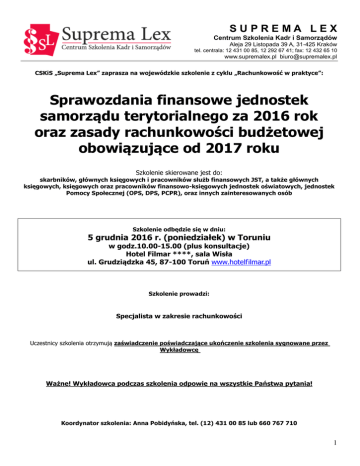 SUPREMA LEX Centrum Szkolenia Kadr i Samorządów Aleja 29 Listopada 39 A, 31-425 Kraków tel. centrala: 12 431 00 85, 12 292 67 41; fax: 12 432 65 10 www.supremalex.pl [email protected] CSKiS „Suprema Lex” zaprasza na wojewódzkie szkolenie z cyklu „Rachunkowość w praktyce”: Sprawozdania finansowe jednostek samorządu terytorialnego za 2016 rok oraz zasady rachunkowości budżetowej obowiązujące od 2017 roku Szkolenie skierowane jest do: skarbników, głównych księgowych i pracowników służb finansowych JST, a także głównych księgowych, księgowych oraz pracowników finansowo-księgowych jednostek oświatowych, jednostek Pomocy Społecznej (OPS, DPS, PCPR), oraz innych zainteresowanych osób Szkolenie odbędzie się w dniu: 5 grudnia 2016 r. (poniedziałek) w Toruniu w godz.10.00-15.00 (plus konsultacje) Hotel Filmar ****, sala Wisła ul. Grudziądzka 45, 87-100 Toruń www.hotelfilmar.pl Szkolenie prowadzi: Specjalista w zakresie rachunkowości Uczestnicy szkolenia otrzymują zaświadczenie poświadczające ukończenie szkolenia sygnowane przez Wykładowcę Ważne! Wykładowca podczas szkolenia odpowie na wszystkie Państwa pytania! Koordynator szkolenia: Anna Pobidyńska, tel. (12) 431 00 85 lub 660 767 710 1 SUPREMA LEX Centrum Szkolenia Kadr i Samorządów Aleja 29 Listopada 39 A, 31-425 Kraków tel. centrala: 12 431 00 85, 12 292 67 41; fax: 12 432 65 10 www.supremalex.pl [email protected] PROGRAM SZKOLENIA: "Sprawozdania finansowe jednostek samorządu terytorialnego za 2016 rok oraz zasady rachunkowości budżetowej obowiązujące od 2017 roku" 05.12.2016 r. godz.10.00-15.00, Hotel Filmar w Toruniu 10.00 Powitanie, omówienie harmonogramu, rozpoczęcie szkolenia (ok. 13.00 lunch) (od godz. 15.00 konsultacje indywidualne) 1. Czynności poprzedzające zamknięcie ksiąg rachunkowych. 2. Wybrane problemy ewidencyjne, w tym zasady ewidencji dochodów i wydatków, należności i zobowiązań oraz przychodów i kosztów. 3. Bilansowa wycena aktywów i pasywów, w tym: przychody przyszłych okresów, rezerwy na zobowiązania i rozliczenia międzyokresowe kosztów. 4. Zasady sporządzania i kontroli prawidłowości sprawozdań finansowych za rok 2016. 5. Zapowiadane zmiany przepisów dotyczących rachunkowości budżetów, jednostek budżetowych oraz samorządowych zakładów budżetowych. 6. Dylematy rachunkowości związane z centralizacją podatku VAT: 1) zakres wytycznych organu wykonawczego jednostki samorządu terytorialnego 2) możliwe rozwiązania ewidencyjne. 7. Nieprawidłowości stwierdzane w trakcie kontroli dotyczące rachunkowości. 15.00 Podsumowanie szkolenia, wręczenie zaświadczeń, zakończenie szkolenia CAŁOŚCIOWY KOSZT SZKOLENIA WYNOSI: 340,00 zł OD OSOBY. CENA OBEJMUJE: - materiały szkoleniowe i ćwiczeniowe, lunch, serwis kawowy - certyfikat poświadczający ukończenie szkolenia sygnowany przez Wykładowcę Dojazd we własnym zakresie Należność za udział w szkoleniu należy przesłać po szkoleniu, po otrzymaniu faktury VAT Koordynator szkolenia: Anna Pobidyńska, tel. (12) 431 00 85 lub 660 767 710 2 SUPREMA LEX Centrum Szkolenia Kadr i Samorządów Aleja 29 Listopada 39 A, 31-425 Kraków tel. centrala: 12 431 00 85, 12 292 67 41; fax: 12 432 65 10 www.supremalex.pl [email protected] ...................................... dnia KARTA ZGŁOSZENIA UCZESTNICTWA W SZKOLENIU NAZWA FORMY DOSKONALENIA: "Sprawozdania finansowe jednostek samorządu terytorialnego za 2016 rok oraz zasady rachunkowości budżetowej obowiązujące od 2017 roku" TERMIN I MIEJSCE: 05.12.2016 r. Hotel Filmar**** sala Wisła, godz. 10:00-15:00 ul. Grudziądzka 45, 87-100 Toruń www.hotelfilmar.pl L.p. Imię i nazwisko Funkcja (dane prosimy wpisywać drukowanymi literami) ADRES E-MAIL:……………………………...............................TELEFON KONTAKTOWY …………………….........................…. FAKTURĘ VAT PROSZĘ WYSTAWIĆ NA:…………....................................……………………………......................……..……… ADRES:……………………………………………..............................…… NIP:............…..….…...….................................………. Wyrażam zgodę na przetwarzanie moich danych osobowych przez Studio Profilaktyki Społecznej oraz Suprema Lex CSKiS, dla potrzeb zgłoszonego szkolenia, zgodnie z ustawą z dnia 29 sierpnia 1997 r. o ochronie danych osobowych (Dz. U. z 1997 r. Nr 133, poz. .883). Wyrażam zgodę na otrzymywanie informacji o szkoleniach i usługach firmy Studio Profilaktyki Społecznej oraz Suprema Lex CSKiS w rozumieniu ust. z dnia 18 lipca 2002r. o świadczeniu usług drogą elektroniczną na adres e-mail. Dane nie będą przekazywane podmiotom trzecim. AP ………………………..................…………………….. Pieczęć i podpis zgłaszającego oraz Instytucji zgłaszającej Oświadczam, iż środki wydatkowane na w/w szkolenie pochodzą w co najmniej 70% ze środków publicznych w rozumieniu ustawy o finansach publicznych. ………………………..................…………………….. Pieczęć i podpis zgłaszającego oraz Instytucji zgłaszającej CAŁOŚCIOWY KOSZT SZKOLENIA WYNOSI: 340,00zł OD OSOBY. CENA OBEJMUJE: - materiały szkoleniowe i ćwiczeniowe, lunch, serwis kawowy - certyfikat poświadczający ukończenie szkolenia sygnowany przez Wykładowcę Dojazd we własnym zakresie Należność za udział w szkoleniu należy przesłać po szkoleniu, po otrzymaniu faktury VAT Kartę zgłoszenia prosimy przesłać faksem: tel./fax: (12) 431-00-85 lub fax.: (12) 432-65-10 do dnia 25.11.2016 r. Wysłanie formularza zgłoszeniowego jest jednoznaczne z potwierdzeniem udziału w szkoleniu. Uwaga! Dysponujemy ograniczoną liczbą miejsc. O zakwalifikowaniu decyduje kolejność zgłoszeń Należność za udział w szkoleniu należy przesłać po otrzymaniu faktury VAT w terminie 7 dni na konto: „Suprema Lex” Centrum Szkole