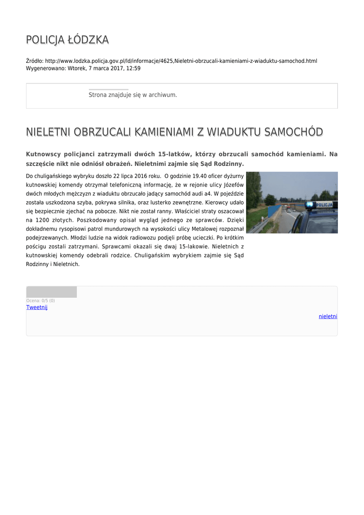 POLICJA ŁÓDZKA Źródło: http://www.lodzka.policja.gov.pl/ld/informacje/4625,Nieletni-obrzucali-kamieniami-z-wiaduktu-samochod.html Wygenerowano: Wtorek, 7 marca 2017, 12:59 Strona znajduje się w archiwum. NIELETNI OBRZUCALI KAMIENIAMI Z WIADUKTU SAMOCHÓD Kutnowscy policjanci zatrzymali dwóch 15-latków, którzy obrzucali samochód kamieniami. Na szczęście nikt nie odniósł obrażeń. Nieletnimi zajmie się Sąd Rodzinny. Do chuligańskiego wybryku doszło 22 lipca 2016 roku. O godzinie 19.40 oficer dyżurny kutnowskiej komendy otrzymał telefoniczną informację, że w rejonie ulicy Józefów dwóch młodych mężczyzn z wiaduktu obrzucało jadący samochód audi a4. W pojeździe została uszkodzona szyba, pokrywa silnika, oraz lusterko zewnętrzne. Kierowcy udało się bezpiecznie zjechać na pobocze. Nikt nie został ranny. Właściciel straty oszacował na 1200 złotych. Poszkodowany opisał wygląd jednego ze sprawców. Dzięki dokładnemu rysopisowi patrol mundurowych na wysokości ulicy Metalowej rozpoznał podejrzewanych. Młodzi ludzie na widok radiowozu podjęli próbę ucieczki. Po krótkim pościgu zostali zatrzymani. Sprawcami okazali się dwaj 15-lakowie. Nieletnich z kutnowskiej komendy odebrali rodzice. Chuligańskim wybrykiem zajmie się Sąd Rodzinny i Nieletnich. Ocena: 0/5 (0) Tweetnij nieletni