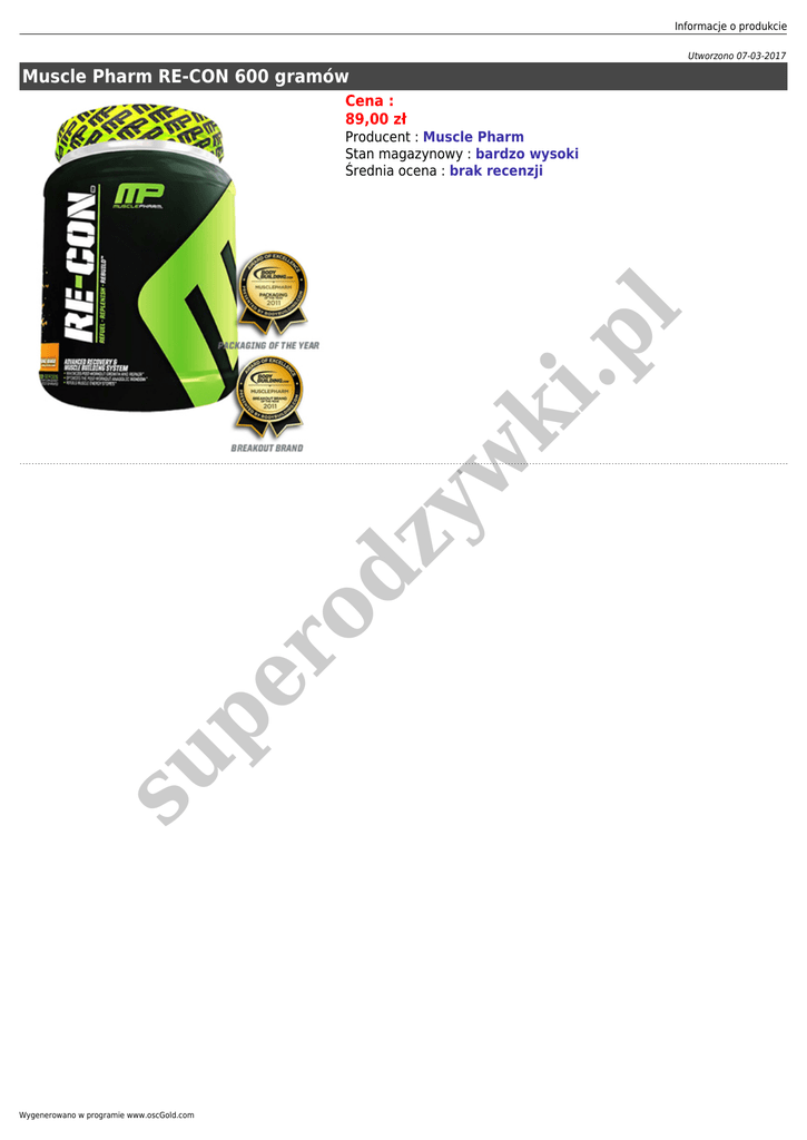 Informacje o produkcie Utworzono 07-03-2017 Muscle Pharm RE-CON 600 gramów Cena : 89,00 zł w ki .p l Producent : Muscle Pharm Stan magazynowy : bardzo wysoki Średnia ocena : brak recenzji ro dz y MUSCLE PHARM - RE-CON - 1200g - UNIKALNA FORMUŁA BCAA 3:1:2 - GLUTAMINA, EAA, ARGININA - MATRIX SUBSTANCJI REDUKUJĄCYCH STRES - MIESZANKA USUWAJĄCA SUBSTANCJE TOKSYCZNE pe ODBUDOWA, REGENERACJA ? POTRZEBUJESZ RECON-a su CZYM JEST RECON ? RECON jest unikalną formułą powysiłkową najwyższej jakości. RECON został zaprojektowany dla maksymalizacji najważniejszej fazy treningu każdego sportowca. Fazy po wysiłkowej . RECON został zaprojektowany aby dostarczyć ciężko trenującym sportowcom wszystkiego co niezbędne aby wzmagać regenerację oraz wzrost w każdy możliwy sposób. Każdy aspekt rekonstrukcji jest odpowiednio zoptymalizowany. Nie ma nic lepszego niż Muscle Pharm RECON. Brutalną prawdą jest to ze im ciężej trenujemy tym osiągamy lepsze wyniki. Jednak aby móc ciężko trenować nasze ciało musi się odpowiednio szybko regenerować. Dlatego czas odpoczynku i regeneracji jest równie ważny jak sam trening. RECON gwarantuje Ci optymalizacje regeneracji na najwyższym poziomie. RECON pozwala ciężko trenującym sportowcom trenować jeszcze ciężej i jeszcze szybciej się regenerować. RECON MAKSYMALIZUJE NAPRAWĘ I POWYSIŁKOWY WZROST POPRZEZ: - Doładowywanie magazynów energii mięśni. - Uzupełnienie składników odżywczych utraconych podczas ciężkiego treningu. - Odbudowę i regenerację mięśni. JAK DZIAŁA RECON ? RECON zawiera kombinację 7 naturalnych matryc specjalnie skomponowanych do odżywiania ciała w celu optymalizacji regeneracji i naprawy mięśni. CO ZNAJDUJE SIĘ W RECON-ie? - Matrix regeneracyjny. - Matrix odbudowujący - Formuła wspomagająca budowę mięśni - Matrix odżywiający mięśnie Wygenerowano w programie www.oscGold.com Opatentowana formuła BCAA 3:1:2- to zespół aminokwasów, który w przeciwieństwie do skoncentrowanych form dostępnych na rynku nie uderza cię zmasowaną dawką od samego początku pozostawiając potem jak „zbitego kundla”. Dzięki zastosowaniu BCAA w formule 3:1:2 aminokwasy są dostarczane równomiernie od początku do samego końca treningu. Ta specjalna formuła dostarcza więcej leucyny i waliny niż izoleucyny. Takie zestawienie BCAA zapewnia silniejszy proces regeneracji i szybszy wzrost czystej masy mięśniowej. SKŁAD: W porcji 20g 20g Carb Max® 3 stage delivery system (Maltodekstryna, glukoza, Inulina) 67,5g 13,5g Anabloic Prmier Matrix (L-leucyna, L-izoleucyna, L-walina) 15g 3g Recovery Accelerator (L-glutamin, Tauryna, L-arginina) 10g 2g 5g ki 1g ro dz y Muscle Extend Matrix (alaina, cytrulina) w Anti-Stress & Adaptogen Matrix (Lecytyna, L-cysteina) .p l W 100g 100g Recon Muscle Rebuilding Blend: W tym: Muscle Detoxifler (wyciąg z czarnych jagód, wyciąg z pokrzywa zwyczajnej (Urtica dioica L.), bromelia, zeaxantyna) 1,5g 0,3g 1g 0,2g 275kcal/785kJ 67,5g 0g 0g 55kcal/157kJ 13,5g 0g 0g 1250mg 12,5mg 600mg 600 μg 250mg(312%)* 2,5mg(178%)* 120mg(15%)* 120 μg(218%)* su Wartość odżywcza Wartość energetyczna Węglowodany Białko Tłuszcze pe Pozostałe składniki: aromaty, cytrynian potasu, kwasek cytrynowy -regulatory kwasowości, sukraloza, acesulfan potasu -substancje słodzące. Witamina C(kwas L-askorbinowy) Witamina B6(chlorowodorek pirydoksyny) Wapń(węglan wapnia) Selen(L-selenometionina) DAWKOWANIE: Jedną porcję na 2 godziny przed treningiem i drugą porcję po treningu.