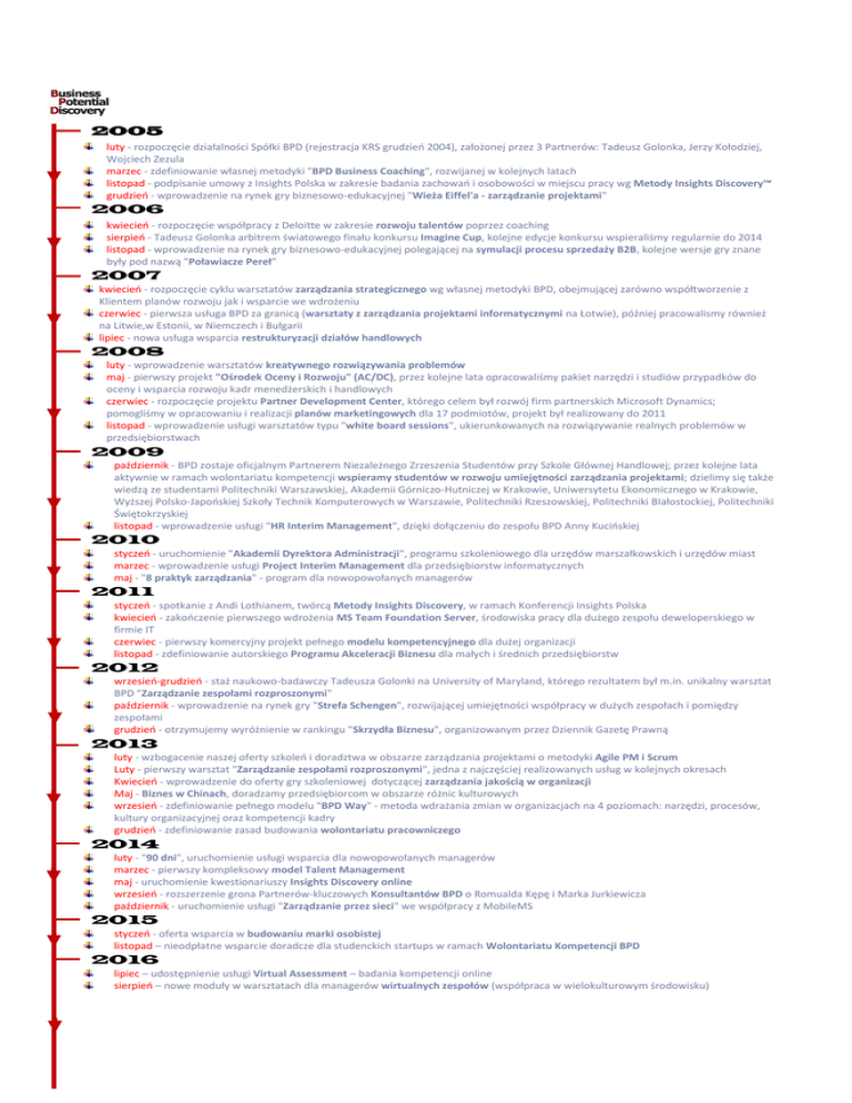 2005 luty - rozpoczęcie działalności Spółki BPD (rejestracja KRS grudzień 2004), założonej przez 3 Partnerów: Tadeusz Golonka, Jerzy Kołodziej, Wojciech Zezula marzec - zdefiniowanie własnej metodyki "BPD Business Coaching", rozwijanej w kolejnych latach listopad - podpisanie umowy z Insights Polska w zakresie badania zachowań i osobowości w miejscu pracy wg Metody Insights Discovery™ grudzień - wprowadzenie na rynek gry biznesowo-edukacyjnej "Wieża Eiffel'a - zarządzanie projektami" 2006 kwiecień - rozpoczęcie współpracy z Deloitte w zakresie rozwoju talentów poprzez coaching sierpień - Tadeusz Golonka arbitrem światowego finału konkursu Imagine Cup, kolejne edycje konkursu wspieraliśmy regularnie do 2014 listopad - wprowadzenie na rynek gry biznesowo-edukacyjnej polegającej na symulacji procesu sprzedaży B2B, kolejne wersje gry znane były pod nazwą "Poławiacze Pereł" 2007 kwiecień - rozpoczęcie cyklu warsztatów zarządzania strategicznego wg własnej metodyki BPD, obejmującej zarówno współtworzenie z Klientem planów rozwoju jak i wsparcie we wdrożeniu czerwiec - pierwsza usługa BPD za granicą (warsztaty z zarządzania projektami informatycznymi na Łotwie), później pracowalismy również na Litwie,w Estonii, w Niemczech i Bułgarii lipiec - nowa usługa wsparcia restrukturyzacji działów handlowych 2008 luty - wprowadzenie warsztatów kreatywnego rozwiązywania problemów maj - pierwszy projekt "Ośrodek Oceny i Rozwoju" (AC/DC), przez kolejne lata opracowaliśmy pakiet narzędzi i studiów przypadków do oceny i wsparcia rozwoju kadr menedżerskich i handlowych czerwiec - rozpoczęcie projektu Partner Development Center, którego celem był rozwój firm partnerskich Microsoft Dynamics; pomogliśmy w opracowaniu i realizacji planów marketingowych dla 17 podmiotów, projekt był realizowany do 2011 listopad - wprowadzenie usługi warsztatów typu "white board sessions", ukierunkowanych na rozwiązywanie realnych problemów w przedsiębiorstwach 2009 październik - BPD zostaje oficjalnym Partnerem Niezależnego Zrzeszenia Studentów przy Szkole Głównej Handlowej; przez kolejne lata aktywnie w ramach wolontariatu kompetencji wspieramy studentów w rozwoju umiejętności zarządzania projektami; dzielimy się także wiedzą ze studentami Politechniki Warszawskiej, Akademii Górniczo-Hutniczej w Krakowie, Uniwersytetu Ekonomicznego w Krakowie, Wyższej Polsko-Japońskiej Szkoły Technik Komputerowych w Warszawie, Politechniki Rzeszowskiej, Politechniki BIałostockiej, Politechniki Świętokrzyskiej listopad - wprowadzenie usługi "HR Interim Management", dzięki dołączeniu do zespołu BPD Anny Kucińskiej 2010 styczeń - uruchomienie "Akademii Dyrektora Administracji", programu szkoleniowego dla urzędów marszałkowskich i urzędów miast marzec - wprowadzenie usługi Project Interim Management dla przedsiębiorstw informatycznych maj - "8 praktyk zarządzania" - program dla nowopowołanych managerów 2011 styczeń - spotkanie z Andi Lothianem, twórcą Metody Insights Discovery, w ramach Konferencji Insights Polska kwiecień - zakończenie pierwszego wdrożenia MS Team Foundation Server, środowiska pracy dla dużego zespołu deweloperskiego w firmie IT czerwiec - pierwszy komercyjny projekt pełnego modelu kompetencyjnego dla dużej organizacji listopad - zdefiniowanie autorskiego Programu Akceleracji Biznesu dla małych i średnich przedsiębiorstw 2012 wrzesień-grudzień - staż naukowo-badawczy Tadeusza Golonki na University of Maryland, którego rezultatem był m.in. unikalny warsztat BPD "Zarządzanie zespołami rozproszonymi" październik - wprowadzenie na rynek gry "Strefa Schengen", rozwijającej umiejętności współpracy w dużych zespołach i pomiędzy zespołami grudzień - otrzymujemy wyróżnienie w rankingu "Skrzydła Biznesu", organizowanym przez Dziennik Gazetę Prawną 2013 luty - wzbogacenie naszej oferty szkoleń i doradztwa w obszarze zarządzania projektami o metodyki Agile PM i Scrum Luty - pierwszy warsztat "Zarządzanie zespołami rozproszonymi", jedna z najczęściej realizowanych usług w kolejnych okresach Kwiecień - wprowadzenie do oferty gry szkoleniowej dotyczącej zarządzania jakością w organizacji Maj - Biznes w Chinach, doradzamy przedsiębiorcom w obszarze różnic kulturowych wrzesień - zdefiniowanie pełnego modelu "BPD Way" - metoda wdrażania zmian w organizacjach na 4 poziomach: narzędzi, procesów, kultury organizacyjnej oraz kompetencji kadry grudzień - zdefiniowanie zasad budowania wolontariatu pracowniczego 2014 luty - "90 dni", uruchomienie usługi wsparcia dla nowopowołanych managerów marzec - pierwszy kompleksowy model Talent Management maj - uruchomienie kwestionariuszy Insights Discovery online wrzesień - rozszerzenie grona Partnerów-kluczowych Konsultantów BPD o Romualda Kępę i Marka Jurkiewicza październik - uruchomienie usługi "Zarządzanie przez sieci" we współpracy z MobileMS 2015 styczeń - oferta wsparcia w budowaniu marki osobistej listopad – nieodpłatne wsparcie doradcze dla studenckich startups w ramach Wolontariatu Kompetencji BPD 2016 lipiec – udostępnienie usługi Virtual Assessment – badania kompetencji online sierpień – nowe moduły w warsztatach dla managerów wirtualnych zespołów (współpraca w wielokulturowym środowisku)