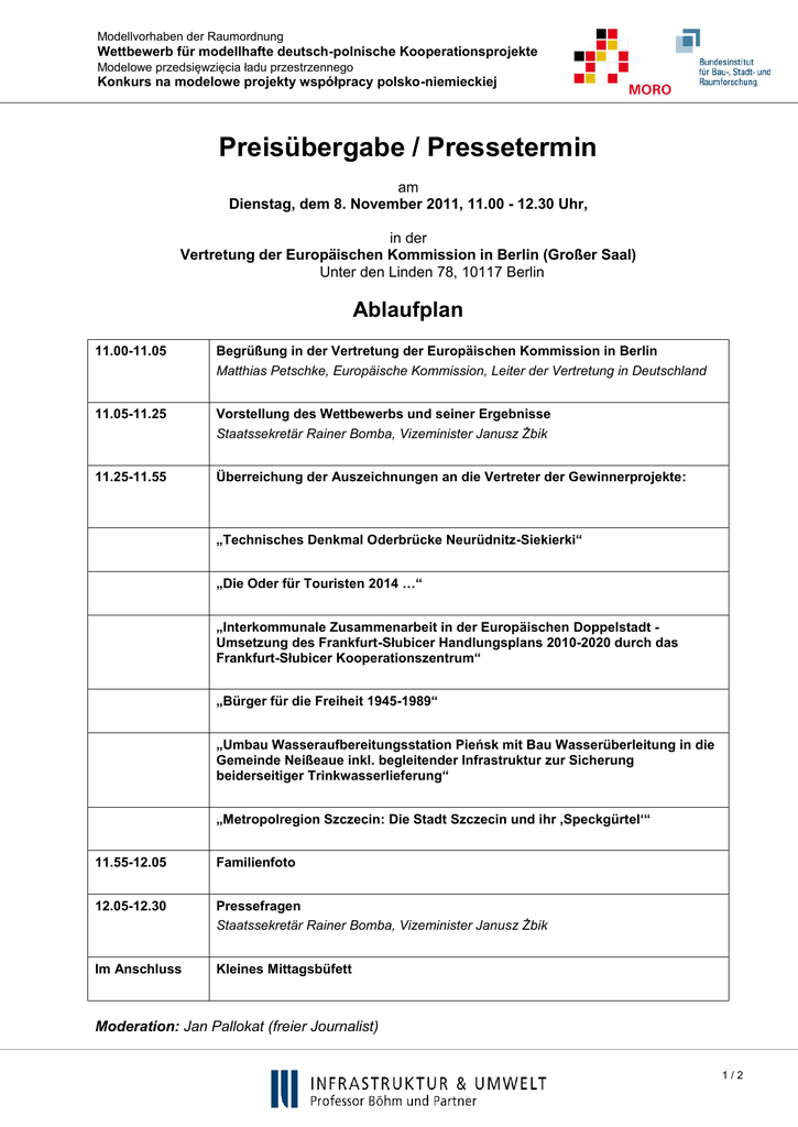 Modellvorhaben der Raumordnung Wettbewerb für modellhafte deutsch-polnische Kooperationsprojekte Modelowe przedsięwzięcia ładu przestrzennego Konkurs na modelowe projekty współpracy polsko-niemieckiej Preisübergabe / Pressetermin am Dienstag, dem 8. November 2011, 11.00 - 12.30 Uhr, in der Vertretung der Europäischen Kommission in Berlin (Großer Saal) Unter den Linden 78, 10117 Berlin Ablaufplan 11.00-11.05 Begrüßung in der Vertretung der Europäischen Kommission in Berlin Matthias Petschke, Europäische Kommission, Leiter der Vertretung in Deutschland 11.05-11.25 Vorstellung des Wettbewerbs und seiner Ergebnisse Staatssekretär Rainer Bomba, Vizeminister Janusz Żbik 11.25-11.55 Überreichung der Auszeichnungen an die Vertreter der Gewinnerprojekte: „Technisches Denkmal Oderbrücke Neurüdnitz-Siekierki“ „Die Oder für Touristen 2014 …“ „Interkommunale Zusammenarbeit in der Europäischen Doppelstadt Umsetzung des Frankfurt-Słubicer Handlungsplans 2010-2020 durch das Frankfurt-Słubicer Kooperationszentrum“ „Bürger für die Freiheit 1945-1989“ „Umbau Wasseraufbereitungsstation Pieńsk mit Bau Wasserüberleitung in die Gemeinde Neißeaue inkl. begleitender Infrastruktur zur Sicherung beiderseitiger Trinkwasserlieferung“ „Metropolregion Szczecin: Die Stadt Szczecin und ihr ‚Speckgürtel‘“ 11.55-12.05 Familienfoto 12.05-12.30 Pressefragen Staatssekretär Rainer Bomba, Vizeminister Janusz Żbik Im Anschluss Kleines Mittagsbüfett Moderation: Jan Pallokat (freier Journalist) 1/2 Modellvorhaben der Raumordnung Wettbewerb für modellhafte deutsch-polnische Kooperationsprojekte Modelowe przedsięwzięcia ładu przestrzennego Konkurs na modelowe projekty współpracy polsko-niemieckiej Wręczenie nagród / Termin prasowy we wtorek, 8 listopada 2011 r., godz. 11.00 - 12.30, w Przedstawicielstwie Komisji Europejskiej w Berlinie (Wielka Sala) Unter den Linden 78, 10117 Berlin Program 11.00-11.05 Powitanie w Przedstawicielstwie Komisji Europejskiej w Berlinie Matthias Petschke, Komisja Europejska, Dyrektor Przedstawicielstwa w Niemczech 11.05-11.25 Przedstawienie konkursu i jego wyników Sekretarz stanu Rainer Bomba, Wiceminister Janusz Żbik 11.25-11.55 Wręczenie nagród przedstawicielom zwycięskich projektów: „Zabytek techniki ‚Most na Odrze Neurüdnitz-Siekierki‘“ „Odra dla turystów 2014...“ „Międzygminna Współpraca w Europejskim Dwumieście Wdrożenie Słubicko-Frankfurckiego Planu Działania 2010-2020 poprzez Słubicko-Frankfurckie Centrum Kooperacji“ „Działalność obywateli na rzecz wolności 1945-1989“ „Przebudowa stacji uzdatniania wody w Pieńsku z wykonaniem sieci wodociągowej dla Gminy Neißeaue wraz z infrastrukturą towarzyszącą zapewniającą obustroną dostawę wody pitnej“ „Metropolitalny region Szczecina: Miasto Szczecin i jego pas aglomeracji“ 11.55-12.05 Wspólna fotografia 12.05-12.30 Pytania prasy Sekretarz stanu Rainer Bomba, Wiceminister Janusz Żbik potem Mały bufet obiadowy Moderacja: Jan Pallokat (wolny dziennikarz) 2/2