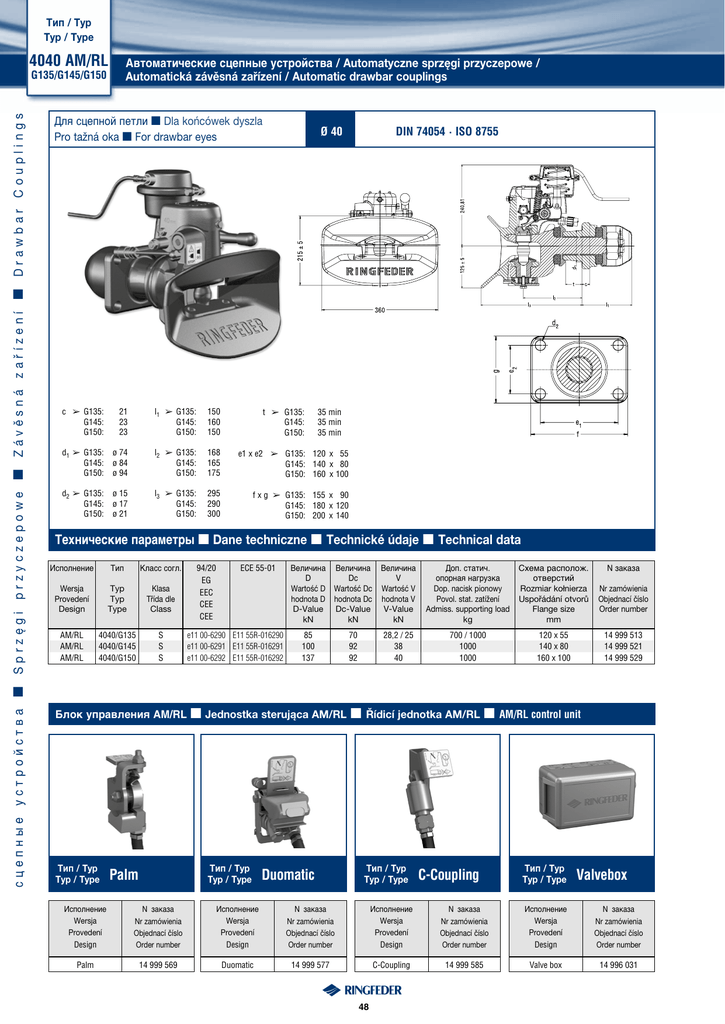 Tип / Typ Typ / Type 4040 AM/RL Автоматические сцепные устройствa / Automatyczne sprzęgi przyczepowe / Automatická závěsná zařízení / Automatic drawbar couplings сцепные устройства M Sprzęgi przyczepowe M Závěsná zařízení M Drawbar Couplings G135/G145/G150 Для сцепной петли M Dla końcówek dyszla Ø 40 Pro tažná oka M For drawbar eyes c ➢G135: 21 G145: 23 G150: 23 l1 ➢G135: 150 G145:160 G150:150 d1 ➢ G135: ø 74 G145: ø 84 G150: ø 94 l2 ➢G135: 168 G145:165 G150:175 e1 x e2 ➢ G135: 120x 55 G145: 140x 80 G150: 160 x100 d2 ➢ G135: ø 15 G145: ø 17 G150: ø 21 l3 ➢G135: 295 G145:290 G150:300 f x g ➢ G135: 155x 90 G145: 180x120 G150: 200x140 t ➢ G135: G145: G150: DIN 74054 · ISO 8755 35 min 35 min 35 min Технические параметры M Dane techniczne M Technické údaje M Technical data Исполнение Tип Класс согл. Wersja Provedení Design Typ Typ Type Klasa Třída dle Class AM/RL AM/RL AM/RL 4040/G135 4040/G145 4040/G150 S S S 94/20 EG EEC CEE CEE ECE 55-01 e11 00-6290 E11 55R-016290 e11 00-6291 E11 55R-016291 e11 00-6292 E11 55R-016292 Величина Величина D Dc Wartość D Wartość Dc hodnota D hodnota Dc D-Value Dc-Value kN kN 85 100 137 70 92 92 Величина V Wartość V hodnota V V-Value kN Доп. статич. опорная нагрузка Dop. nacisk pionowy Povol. stat. zatížení Admiss. supporting load kg Схема располож. отверстий Rozmiar kołnierza Uspořádání otvorů Flange size mm 28,2 / 25 38 40 700 / 1000 1000 1000 120 x 55 140 x 80 160 x 100 N заказа Nr zamówienia Objednací číslo Order number 14 999 513 14 999 521 14 999 529 Блок управления AM/RL M Jednostka sterująca AM/RL M Řídicí jednotka AM/RL M AM/RL control unit Tип / Typ Typ / Type Palm Tип / Typ Typ / Type Duomatic Tип / Typ Typ / Type C-Coupling Tип / Typ Typ / Type Valvebox Исполнение Wersja Provedení Design N заказа Nr zamówienia Objednací číslo Order number Исполнение Wersja Provedení Design N заказа Nr zamówienia Objednací číslo Order number Исполнение Wersja Provedení Design N заказа Nr zamówienia Objednací číslo Order number Исполнение Wersja Provedení Design N заказа Nr zamówienia Objednací číslo Order number Palm 14 999 569 Duomatic 14 999 577 C-Coupling 14 999 585 Valve box 14 996 031 48 Пример заказа M Przykład zamówienia M Příklad objednávky M Ordering example Соединительная муфта AM/RL без блока управления Sprzęg AM/RL bez jednostki sterującej Spojka AM/RL bez řídicí jednotky AM/RL coupling without control unit Номер заказа соединительной муфты AM/RL Numer katalogowy sprzęgła AM/RL Objednací číslo spojky AM/RL Order number for the AM/RL coupling Блок управления AM/RL Jednostka sterująca AM/RL Řídicí jednotka AM/RL AM/RL control unit Номер заказа блока управления AM/RL Numer katalogowy jednostki sterującej AM/RL Objednací číslo řídicí jednotky AM/RL Order number for the AM/RL control unit 14 999 XXX 14 999 XXX 14 999 XXX 14 999 XXX 14 99X XXX 14 99X XXX 14 99X XXX 14 99X XXX Заказ комплекта (2 номера заказа) Kompletne zamówienie (2 numery katalogowe) Kompletní objednávka (2 objednací čísla) Complete order (2 order numbers) ! Делая заказ, просим учесть, что необходимо указывать как номер заказа соединительной муфты, так и номер заказа блока управления. | Przy składaniu zamówienia należy pamiętać o podaniu numeru katalogowego sprzęgła i numeru katalogowego jednostki sterującej. | U své objednávky mějte prosím na paměti, že musí být uvedeno objednací číslo spojky a objednací číslo řídicí jednotky. | Please note that your order must include the order number for the coupling and the order number for the control unit. 49 Tип / Typ Typ / Type 4040 AM/RL сцепные устройства M Sprzęgi przyczepowe M Závěsná zařízení M Drawbar Couplings G135/G145/G150 Автоматические сцепные устройствa / Automatyczne sprzęgi przyczepowe / Automatická závěsná zařízení / Automatic drawbar couplings Запасные части Блок управления AM/RL M Części zamienne Jednostka sterująca AM/RL M Náhradní díly Řídicí jednotka AM/RL M Spare parts AM/RL control unit Tип | Typ | Typ | Type Palm 1 Pos. No. 2 3 Наименование M Oznaczenie M Označení M Designation 1 14 999 601 Держатель Palm M Uchwyt Palm M Držák Palm M Palm holder 2 14 999 625 Соединительная муфта Palm M Sprzęgło Palm M Spojka Palm M Palm coupling 3 14 999 593 Комплект шлангов Palm M Zestaw węży Palm M Hadicová sada Palm M Palm tube kit Tип | Typ | Typ | Type Duomatic 1 Pos. No. 2 3 Наименование M Oznaczenie M Označení M Designation 1 14 999 609 Держатель Duomatic M Uchwyt Duomatic M Držák Duomatic M Duomatic holder 2 14 999 633 Соединительная муфта Duomatic M Sprzęgło Duomatic M Spojka Duomatic M Duomatic coupling 3 14 999 593 Комплект шлангов Duomatic M Zestaw węży Duomatic M Hadicová sada Duomatic M Duomatic tube kit 50 Запасные части Блок управления AM/RL M Części zamienne Jednostka sterująca AM/RL M Náhradní díly Řídicí jednotka AM/RL M Spare parts AM/RL control unit Tип | Typ | Typ | Type C-Coupling 1 Pos. No. 2 3 Наименование M Oznaczenie M Označení M Designation 1 14 999 617 Держатель C-Coupling M Uchwyt C-Coupling M Držák C-Coupling M C-Coupling holder 2 14 999 641 Соединительная 