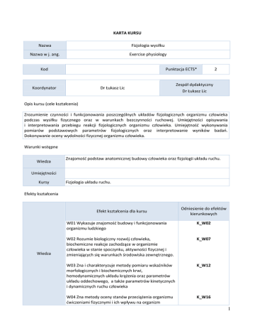 KARTA KURSU Nazwa Fizjologia wysiłku Nazwa w j. ang. Exercise physiology Kod Punktacja ECTS* 2 Koordynator Dr Łukasz Lic Zespół dydaktyczny Dr Łukasz Lic Opis kursu (cele kształcenia) Zrozumienie czynności i funkcjonowania poszczególnych układów fizjologicznych organizmu człowieka podczas wysiłku fizycznego oraz w warunkach bezczynności ruchowej. Umiejętności opisywania i interpretowania przebiegu reakcji fizjologicznych organizmu człowieka. Umiejętność wykonywania pomiarów podstawowych parametrów fizjologicznych oraz interpretowanie wyników badań. Dokonywanie oceny wydolności fizycznej organizmu człowieka. Warunki wstępne Znajomość podstaw anatomicznej budowy człowieka oraz fizjologii układu ruchu. Wiedza Umiejętności Kursy Fizjologia układu ruchu. Efekty kształcenia Efekt kształcenia dla kursu Wiedza W01 Wykazuje znajomość budowy i funkcjonowania organizmu ludzkiego W02 Rozumie biologiczny rozwój człowieka, biochemiczne reakcje zachodzące w organizmie człowieka w stanie spoczynku, aktywności fizycznej i zmieniających się warunkach środowiska zewnętrznego. W03 Zna i charakteryzuje metody pomiaru wskaźników morfologicznych i biochemicznych krwi, hemodynamicznych układu krążenia oraz parametrów układu oddechowego, a także parametrów kinetycznych i dynamicznych ruchu człowieka W04 Zna metody oceny stanów przeciążenia organizmu ćwiczeniami fizycznymi i ich wpływu na organizm Odniesienie do efektów kierunkowych K_W02 K_W07 K_W12 K_W16 1 Odniesienie do efektów kierunkowych Efekt kształcenia dla kursu Umiejętności K_U02 K_U12 K_U15 U01 Umie wykorzystać i obsługiwać aparaturę i sprzęt do badań funkcjonalnych i laboratoryjnych stosowany do oceny stanu fizycznego człowieka oraz stosowany w sporcie U02 Posiada umiejętność oceny i doboru odpowiedniej aktywności fizycznej w zależności od stopnia sprawności i wieku U03 Dokonuje pomiaru i umie właściwie interpretować wyniki wskaźników fizjologicznych, biofizycznych i morfologicznych pozwalających diagnozować stan organizmu, odnosząc je do wartości referencyjnych Odniesienie do efektów kierunkowych Efekt kształcenia dla kursu Kompetencje społeczne K_K07 K_K14 K01 Współdziała i pracuje w zespole, pełniąc różne w nim role K02 Rozumie potrzebę dbałości o sprawność fizyczną, jest świadomy jak wielką wartością jest zdrowie w wymiarze jednostkowym i społecznym, ma świadomość oddziaływania odnowy biologicznej na jakość życia człowieka Organizacja Forma zajęć Liczba godzin Wykład (W) Ćwiczenia w grupach A K L 15 S P E 2 Opis metod prowadzenia zajęć Wykonywanie różnych prób wysiłkowych w celu określenia ich wpływu na organizm. Prezentacje multimedialne ilustrujące poruszane zagadnienia. Udział w dyskusji Kryteria oceny Inne Projekt grupowy X X X X X X X X X X Egzamin pisemny Projekt indywidualny Egzamin ustny Praca laboratoryjna Praca pisemna (esej) Zajęcia terenowe Referat Ćwiczenia w szkole E – learning W01 W02 W03 W04 W05 U01 U02 U03 K01 K02 Gry dydaktyczne Formy sprawdzania efektów kształcenia Aktywny udział w zajęciach, pisemne kolokwium zaliczeniowe. Uwagi Treści merytoryczne (wykaz tematów) 1. Wpływ ćwiczeń fizycznych na organizm człowieka. Klasyfikacja wysiłków fizycznych. Procesy energetyczne i zmiany fizjologiczne podczas wysiłków fizycznych. Podstawowa i wysiłkowa przemiana materii. Metody oznaczania wskaźników strukturalnych ciała. 2. Sposoby oceny uciążliwości wysiłku. Fizjologiczne podłoże ćwiczeń rozgrzewkowych. Reakcje na wysiłek fizyczny ze względu na wiek i płeć. 3. Testy wydolności tlenowej i beztlenowej. 4. Badanie długu i deficytu tlenowego. Metody pomiaru kosztu energetycznego. 3 5. Fizjologiczne podłoże zmęczenia i przetrenowania. Badanie fizjologicznych reakcji organizmu na stres cieplny w saunie fińskiej. Wykaz literatury podstawowej Jaskólski A. (red.) – Podstawy fizjologii wysiłku fizycznego z zarysem fizjologii człowieka. Wyd. AWF Wrocław, 2002. Górski J., red. Fizjologia wysiłku i treningu fizycznego. Warszawa, PZWL, 2012. Wykaz literatury uzupełniającej Władysław Traczyk ‐ "Fizjologia człowieka w zarysie". Wyd. Lek. PZWL, Warszawa 1997 Bilans godzinowy zgodny z CNPS (Całkowity Nakład Pracy Studenta) Wykład Ilość godzin w kontakcie z prowadzącymi Konwersatorium (ćwiczenia, laboratorium itd.) Pozostałe godziny kontaktu studenta z prowadzącym Lektura w ramach przygotowania do zajęć Ilość godzin pracy studenta bez kontaktu z prowadzącymi 15 10 Przygotowanie krótkiej pracy pisemnej lub referatu po zapoznaniu się z niezbędną literaturą przedmiotu Przygotowanie projektu lub prezentacji na podany temat (praca w grupie) Przygotowanie do egzaminu 10 Ogółem bilans czasu pracy 35 Ilość punktów ECTS w zależności od przyjętego przelicznika 2 4