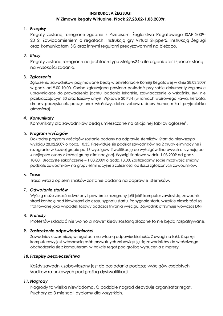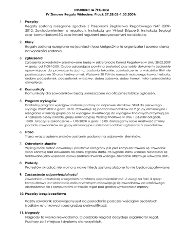 INSTRUKCJA ŻEGLUGI IV Zimowe Regaty Wirtualne, Płock 27,28.02-1.03.2009r. 1. Przepisy Regaty zostaną rozegrane zgodnie z Przepisami Żeglarstwa Regatowego ISAF 20092012, Zawiadomieniem o regatach, Instrukcją gry Virtual Skipper5, Instrukcją Żeglugi oraz komunikatami SG oraz innymi regułami precyzowanymi na bieżąco. 2. Klasy Regaty zostaną rozegrane na jachtach typu Melges24 o ile organizator i sponsor staną na wysokości zadania. 3. Zgłoszenia Zgłoszenia zawodników przyjmowane będą w sekretariacie Komisji Regatowej w dniu 28.02.2009 w godz. od 9.00-10.00. Osoba zgłaszająca powinna posiadać przy sobie dokumenty żeglarskie uprawniające do prowadzenia jachtu, badania lekarskie, zaświadczenie o wskaźniku BMI nie przekraczającym 30 oraz trzeźwy umysł. Wpisowe 20 PLN (w ramach wpisowego kawa, herbata, drobny poczęstunek, poczęstunek właściwy, dobra zabawa, dobry humor, miła i przyjacielska atmosfera). 4. Komunikaty Komunikaty dla zawodników będą umieszczane na oficjalnej tablicy ogłoszeń. 5. Program wyścigów Dokładny program wyścigów zostanie podany na odprawie sterników. Start do pierwszego wyścigu 28.02.2009 o godz. 10.35. Przewiduje się podział zawodników na 2 grupy eliminacyjne i rozegranie w każdej grupie po 16 wyścigów. Kwalifikację do wyścigów finałowych otrzymują po 4 najlepsze osoby z każdej grupy eliminacyjnej. Wyścigi finałowe w dniu 1.03.2009 od godz. 10.00. Uroczyste zakończenie – 1.03.2009r o godz. 13.00. Zastrzegamy sobie możliwość zmiany podziału zawodników na grupy eliminacyjne z zależności od ilości zgłoszonych zawodników. 6. Trasa Trasa wraz z opisem znaków zostanie podana na odprawie sterników. 7. Odwołanie startów Wyścig może zostać odwołany i powtórnie rozegrany jeśli jakiś komputer zawiesi się, zawodnik straci kontrolę nad klawiszami do czasu sygnału startu. Po sygnale startu wszelkie nieścisłości są traktowane jako wypadek losowy podczas trwania wyścigu. Zawodnik otrzymuje wówczas DNF. 8. Protesty Protestów składać nie wolno a nawet kiedy zostaną złożone to nie będą rozpatrywane. 9. Zastrzeżenie odpowiedzialności Zawodnicy uczestniczą w regatach na własną odpowiedzialność. Z uwagi na fakt, iż sprzęt komputerowy jest własnością osób prywatnych zobowiązuję się zawodników do właściwego obchodzenia się z komputerami w trakcie regat pod groźbą wyrzucenia z imprezy. 10. Przepisy bezpieczeństwa Każdy zawodnik zobowiązany jest do posiadania podczas wyścigów osobistych środków ratunkowych pod groźbą dyskwalifikacji. 11. Nagrody Nagrody to wielka niewiadoma. O podziale nagród decyduje organizator regat. Puchary za 3 miejsca i dyplomy dla wszystkich.
