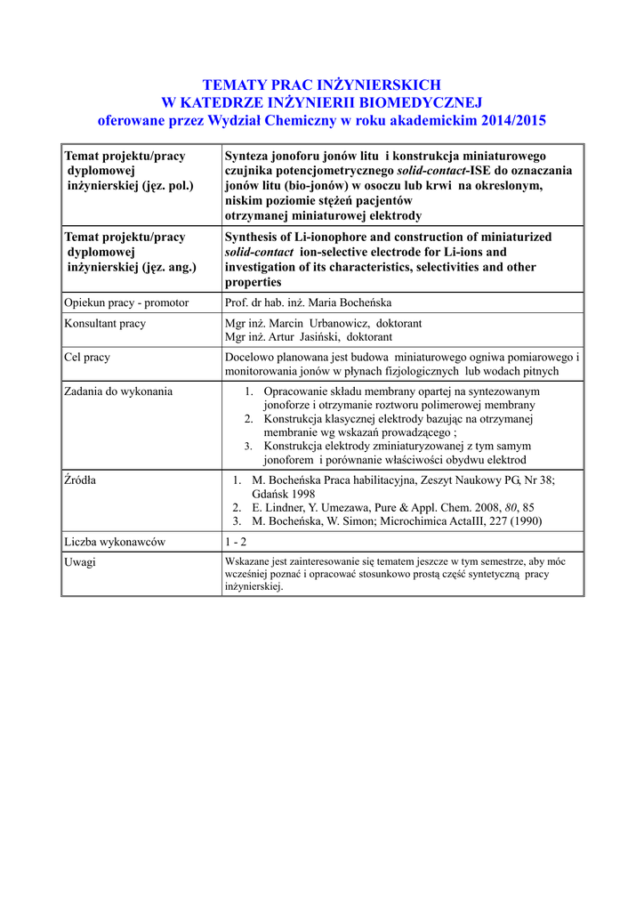 TEMATY PRAC INŻYNIERSKICH W KATEDRZE INŻYNIERII BIOMEDYCZNEJ oferowane przez Wydział Chemiczny w roku akademickim 2014/2015 Temat projektu/pracy dyplomowej inżynierskiej (jęz. pol.) Synteza jonoforu jonów litu i konstrukcja miniaturowego czujnika potencjometrycznego solid-contact-ISE do oznaczania jonów litu (bio-jonów) w osoczu lub krwi na okreslonym, niskim poziomie stężeń pacjentów otrzymanej miniaturowej elektrody Temat projektu/pracy dyplomowej inżynierskiej (jęz. ang.) Synthesis of Li-ionophore and construction of miniaturized solid-contact ion-selective electrode for Li-ions and investigation of its characteristics, selectivities and other properties Opiekun pracy - promotor Prof. dr hab. inż. Maria Bocheńska Konsultant pracy Mgr inż. Marcin Urbanowicz, doktorant Mgr inż. Artur Jasiński, doktorant Cel pracy Docelowo planowana jest budowa miniaturowego ogniwa pomiarowego i monitorowania jonów w płynach fizjologicznych lub wodach pitnych Zadania do wykonania Źródła 1. Opracowanie składu membrany opartej na syntezowanym jonoforze i otrzymanie roztworu polimerowej membrany 2. Konstrukcja klasycznej elektrody bazując na otrzymanej membranie wg wskazań prowadzącego ; 3. Konstrukcja elektrody zminiaturyzowanej z tym samym jonoforem i porównanie właściwości obydwu elektrod 1. M. Bocheńska Praca habilitacyjna, Zeszyt Naukowy PG, Nr 38; Gdańsk 1998 2. E. Lindner, Y. Umezawa, Pure & Appl. Chem. 2008, 80, 85 3. M. Bocheńska, W. Simon; Microchimica ActaIII, 227 (1990) Liczba wykonawców 1-2 Uwagi Wskazane jest zainteresowanie się tematem jeszcze w tym semestrze, aby móc wcześniej poznać i opracować stosunkowo prostą część syntetyczną pracy inżynierskiej. Temat projektu/pracy dyplomowej inżynierskiej (jęz. pol.) Sensory potencjometryczne dla analityki medycznej: testowanie nowych organicznych jonoforów Temat projektu/pracy dyplomowej inżynierskiej (jęz. ang.) Potentiometric sensors for medical analytics: testing of new organic ionophores Opiekun pracy - promotor dr hab. inż. Elżbieta Luboch, prof. nadzw. PG Konsultant pracy Cel pracy Badanie właściwości czujników potencjometrycznych – membranowych elektrod jonoselektywnych (ISE) zawierających w membranie zaprojektowane i nowootrzymane jonofory, selektywnych na wybrane biojony – istotne w analityce medycznej Zadania do wykonania 1. Przegląd literatury dotyczącej: czujników potencjometrycznych; struktury jonoforów, szczególnie tych dla elektrod selektywnych na kationy istotne w diagnostyce laboratoryjnej. 2. Opcjonalnie: udział w syntezie organicznego jonoforu. 3. Przygotowanie membran o różnym składzie i zbadanie charakterystyki klasycznych elektrod jonoselektywnych zawierających wybrane jonofory. 3. Przygotowanie miniaturowych elektrod typu all-solid-state, opartych na węglu szklistym zawierających analogiczne membrany, jak elektrody klasyczne i zbadanie ich właściwości. 4. Porównanie właściwości klasycznych i miniaturowych elektrod: selektywności, granicy wykrywalności i trwałości. 5. Opracowanie uzyskanych wyników. 1. Brzózka Z., Wróblewski W.: Sensory chemiczne. Warszawa: Oficyna Wydawnicza Politechniki Warszawskiej 1998. 2. Brzózka Z.: Miniaturyzacja w analityce. Warszawa: Oficyna Wydawnicza Politechniki Warszawskiej 2005. 3. Cygański A., Podstawy metod elektroanalitycznych. Warszawa: WNT 1999. 4. Janata J., Principles of Chemical Sensors, Springer, New York 2010. 5. Bühlmann P., Pretsch E., Bakker E., Chem. Rev., 98, 1593 (1998) 6. Umezawa Y., Bühlmann P., Umezawa K., Tohda K., Amemiya S.: Pure & Appl. Chem., 72, 1851 (2000) 7. Bakker E., Pretsch E., Bülhmann P., Anal. Chem., 72, 1127 (2000) 8. Bobacka J., Ivaska A., Lewenstam A., Chem. Rev., 108, 329 (2008) 9. Lindner. E. Umezawa Y., Pure Appl. Chem., 80, 85 (2008) Źródła 10. Aktualne pozycje literaturowe z czasopism o wysokim IF Liczba wykonawców Uwagi 1 Temat projektu/pracy dyplomowej inżynierskiej (jęz. pol.) Nanorurki węglowe z ugrupowaniem tiolowym do konstrukcji enzymatycznych bioogniw paliwowych Temat projektu/pracy dyplomowej inżynierskiej (jęz. ang.) Carbon nanotubes with a thiol moiety for the construction of enzymatic biofuel cell Opiekun pracy - promotor Prof. dr hab. inż. Jan Biernat Konsultant pracy Dr Jolanta Szczygelska-Tao Cel pracy W enzymatycznych bioogniwach podstawowym problemem jest uzyskanie trwałego połączenia centrum aktywnego enzymu z zewnętrznym obwodem elektrycznym. Celem pracy jest wyposażenie nanorurek węglowych stanowiących fragment obwodu wewnętrznego w resztę tiolową, która kowalencyjnie powiąże obwód wewnętrzny ze złoconym fragmentem obwodu zewnętrznego Zadania do wykonania 1. wyposażenie nanorurek węglowych jedno- lub wielościennych w ugrupowanie penetrujące centrum aktywne enzymu 2. Zaktywowanie ugrupowania karboksylowego nanorurki weglowej 3. Synteza amidu z aminotiofenolem lub z cysteaminą... 4. Przeprowadzenie podstawowych badań analitycznych 5. ewentualne sprawdzenie działania ogniwa w U.W. Źródła 1. Nanotechnology; M. Kohler, W. Frotsche, Wiley-VCH, 2004; 2. Nanotechnologia w chemii i medycynie, K. Żelechowska, Wydawnictwa politechniki Gdańskiej 2014.; 3. Np. Biobatteries and biofuel cells with biphenylated carbon nanotubes; K. Stolarczyk, M. Kizling, D. Majdecka, K. Ż elechowska, J.F. Biernat, J. Rogalski, R. Bilewicz J. Power Sources 249 (2014) 263-269 Liczba wykonawców Przewiduję możliwość wykonania dyplomu przez 1 – 2 osoby. Uwagi Temat projektu/pracy dyplomowej inżynierskiej (jęz. pol.) OGNIWO LITOWO-JONOWE DO ZASILANIA ROZRUSZNIKA SERCA Temat projektu/pracy dyplomowej inżynierskiej (jęz. ang.) Lithium-ion battery for pace maker Opiekun pracy - promotor A. Lisowska-Oleksiak Konsultant pracy A. P. Nowak Cel pracy Opracownie konstrukcji i wykorzystanie nanomateriałów w akumulatorze wysokiej energii Zadania do wykonania 1. Analiza danych literaturowych na temat ogniw litowo-jonowych stosowanych w implan