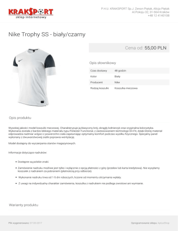 P.H.U. KRAKSPORT Sp.J. Zenon Piętak, Alicja Piętak Al.Pokoju 32, 31-564 Kraków +48 12 4140108 Nike Trophy SS - biały/czarny Cena od: 55,00 PLN Opis słownikowy Czas dostawy 48 godzin Kolor Biały Producent Nike Rodzaj koszulki Koszulka meczowa Opis produktu Wysokiej jakości model koszulki meczowej. Charakteryzuje ją klasyczny krój, okrągły kołnierzyk oraz oryginalna kolorystyka. Wykonana została z bardzo lekkiego materiału typu Poliester Functional, z zastosowaniem technologii Dri-Fit, dzięki której materiał odprowadza nadmiar wilgoci z powierzchni ciała zapewniając optymalny komfort podczas wysiłku fizycznego. Specjalny panel wykonany z dwuwarstwowej siatki poprawia wentylację. Model dostępny do wyczerpania stanów magazynowych. Informacje dotyczące nadruków: Dostępne są polskie znaki. Zamówienie nadruku możliwe jest tylko i wyłącznie z opcją płatności z góry (przelew lub karta kredytowa). Nie wysyłamy koszulek z nadrukiem za pobraniem (płatnością przy odbiorze). Wykonanie nadruku trwa od 1-5 dni roboczych, liczone od momentu otrzymania wpłaty. Z uwagi na indywidualny charakter zamówienia, koszulka z nadrukiem nie podlega zwrotowi ani wymianie. Warianty produktu Plik wygenerowano: 07-03-2017 Oprogramowanie sklepu: AptusShop P.H.U. KRAKSPORT Sp.J. Zenon Piętak, Alicja Piętak Al.Pokoju 32, 31-564 Kraków +48 12 4140108 S 55,00 PLN XL 55,00 PLN XXL 55,00 PLN Galeria Plik wygenerowano: 07-03-2017 Powered by TCPDF (www.tcpdf.org) Oprogramowanie sklepu: AptusShop