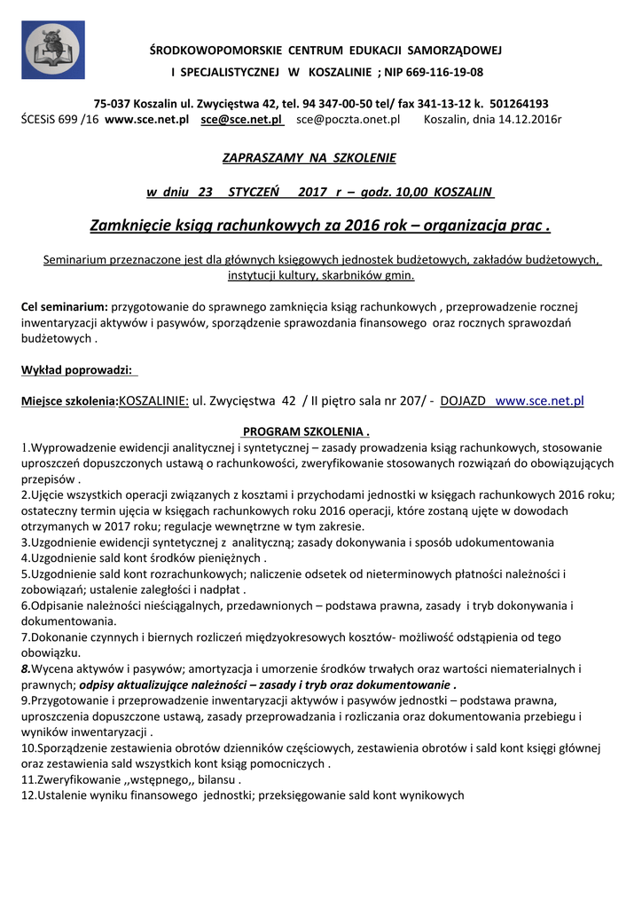ŚRODKOWOPOMORSKIE CENTRUM EDUKACJI SAMORZĄDOWEJ I SPECJALISTYCZNEJ W KOSZALINIE ; NIP 669-116-19-08 75-037 Koszalin ul. Zwycięstwa 42, tel. 94 347-00-50 tel/ fax 341-13-12 k. 501264193 ŚCESiS 699 /16 www.sce.net.pl [email protected] [email protected] Koszalin, dnia 14.12.2016r ZAPRASZAMY NA SZKOLENIE w dniu 23 STYCZEŃ 2017 r – godz. 10,00 KOSZALIN Zamknięcie ksiąg rachunkowych za 2016 rok – organizacja prac . Seminarium przeznaczone jest dla głównych księgowych jednostek budżetowych, zakładów budżetowych, instytucji kultury, skarbników gmin. Cel seminarium: przygotowanie do sprawnego zamknięcia ksiąg rachunkowych , przeprowadzenie rocznej inwentaryzacji aktywów i pasywów, sporządzenie sprawozdania finansowego oraz rocznych sprawozdań budżetowych . Wykład poprowadzi: Miejsce szkolenia:KOSZALINIE: ul. Zwycięstwa 42 / II piętro sala nr 207/ - DOJAZD www.sce.net.pl PROGRAM SZKOLENIA . 1.Wyprowadzenie ewidencji analitycznej i syntetycznej – zasady prowadzenia ksiąg rachunkowych, stosowanie uproszczeń dopuszczonych ustawą o rachunkowości, zweryfikowanie stosowanych rozwiązań do obowiązujących przepisów . 2.Ujęcie wszystkich operacji związanych z kosztami i przychodami jednostki w księgach rachunkowych 2016 roku; ostateczny termin ujęcia w księgach rachunkowych roku 2016 operacji, które zostaną ujęte w dowodach otrzymanych w 2017 roku; regulacje wewnętrzne w tym zakresie. 3.Uzgodnienie ewidencji syntetycznej z analityczną; zasady dokonywania i sposób udokumentowania 4.Uzgodnienie sald kont środków pieniężnych . 5.Uzgodnienie sald kont rozrachunkowych; naliczenie odsetek od nieterminowych płatności należności i zobowiązań; ustalenie zaległości i nadpłat . 6.Odpisanie należności nieściągalnych, przedawnionych – podstawa prawna, zasady i tryb dokonywania i dokumentowania. 7.Dokonanie czynnych i biernych rozliczeń międzyokresowych kosztów- możliwość odstąpienia od tego obowiązku. 8.Wycena aktywów i pasywów; amortyzacja i umorzenie środków trwałych oraz wartości niematerialnych i prawnych; odpisy aktualizujące należności – zasady i tryb oraz dokumentowanie . 9.Przygotowanie i przeprowadzenie inwentaryzacji aktywów i pasywów jednostki – podstawa prawna, uproszczenia dopuszczone ustawą, zasady przeprowadzania i rozliczania oraz dokumentowania przebiegu i wyników inwentaryzacji . 10.Sporządzenie zestawienia obrotów dzienników częściowych, zestawienia obrotów i sald kont księgi głównej oraz zestawienia sald wszystkich kont ksiąg pomocniczych . 11.Zweryfikowanie ,,wstępnego,, bilansu . 12.Ustalenie wyniku finansowego jednostki; przeksięgowanie sald kont wynikowych 13.Sporządzenie ostatecznej wersji sprawozdania finansowego jednostki, w tym jednostki samorządu terytorialnego; zasady sporządzania bilansu, rachunku zysków i strat oraz zestawienia zmian w funduszu jednostki – zasady grupowania operacji ujętych w ewidencji syntetycznej i analitycznej w poszczególnych sprawozdaniach – zakres regulacji wewnętrznych w tym zakresie. 14.Sporządzenie obowiązujących jednostkę sprawozdań budżetowych – zasady, terminy, odpowiedzialność. 15.Powiązanie sprawozdań budżetowych ze sprawozdaniem finansowym. 16.Ostateczne zamknięcie ksiąg rachunkowych ( po przyjęciu bilansu ) . 17. Wprowadzenie bilansu otwarcia do ksiąg rachunkowych następnego roku Uczestnicy otrzymują zaświadczenie o ukończeniu szkolenia. Odpłatność : 310,00 zł od osoby - płatne przelewem 7 DNI od otrzymania rachunku . W cenie zapewniamy: catering oraz materiały szkoleniowe. Zgłoszenie na szkolenie prosimy wypełnić i przesłać do Centrum listownie /adres w nagłówku pisma/ lub faxem /tel/fax 94-341-13-12. - płatne przelewem po otrzymaniu rachunku . Zgłaszając uczestnictwo faxem prosimy o potwierdzenie telefoniczne. W przypadku nie zebrania odpowiedniej ilości osób organizator zastrzega sobie prawo odwołania szkolenia lub zmiany terminu,miejsca szkolenia.. DYREKTOR Andrzej Urbanek Z G Ł O S Z E N I E – „ BILANS OGÓLNY 2016 . ” -w dniu 23.01.2017 r –g.10.00 KOSZALIN KARTA ZGŁOSZENIOWA- DANE DO WYSTAWIENIA FAKTURY /NAZWA,ADRES ,NIP/ ................................................................................................................................................. NIP ...................................................... TEL. ................................................ 1. ......................................................................................... .................................................. /imię i nazwisko/ /stanowisko/ 2. ............................................................................................................................................... • /wpisać pismem drukowanym / Należność w wysokości ............... złotych za szkolenie przekażemy gotówką/przelewem/ na konto: PKO BP SA 26 1020 2791 0000 7802 0233 7533. Przyjmujemy do wiadomości, że nie zgłoszenie rezygnacji ze szkolenia na 4 dni robocze przed terminem spowoduje obciążenie zgłaszającego kosztami szkolenia. Zgadzamy się na przetwarzanie danych osobowych zawartych w zgłoszeniu do czynnosci związanych z realizacją szkolenia. ........................................... /podpis i pieczątka /