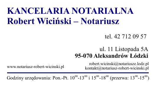 KANCELARIA NOTARIALNA Robert Wiciński – Notariusz tel. 42 712 09 57 ul. 11 Listopada 5A 95-070 Aleksandrów Łódzki www.notariusz-robert-wicinski.pl [email protected] [email protected] Godziny urzędowania: Pon.-Pt. 1000-1300 i 1500-1800 (przerwa: 1300-1500)