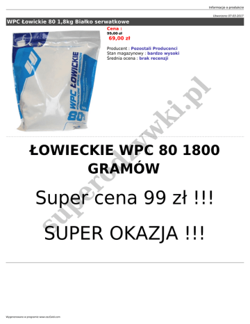 Informacje o produkcie Utworzono 07-03-2017 WPC Łowickie 80 1,8kg Białko serwatkowe Cena : 99,00 zł 69,00 zł w ki .p l Producent : Pozostali Producenci Stan magazynowy : bardzo wysoki Średnia ocena : brak recenzji ro dz y ŁOWIECKIE WPC 80 1800 GRAMÓW su pe Super cena 99 zł !!! SUPER OKAZJA !!! Wygenerowano w programie www.oscGold.com WPC ŁOWICKIE 80% jest białkowym preparatem serwatkowym, wzbogaconym w proteinę o przewadze L-glutaminy, dzięki czemu znajduje szersze zastosowanie w dyscyplinach siłowych. WPC ŁOWICKIE 80% jest produktem polskim, powstałym dzięki specjalistom branży mleczarskiej i doświadczonym technologom produktów dietetycznych z centrum kraju. ki .p l WPC ŁOWICKIE 80% wykazuje niespotykane w popularnej klasie białek jednosurowcowych walory smakowe i jakościowe. Jest wyspecjalizowaną odżywką dla kulturystów dzięki zawartości peptydu glutaminy, łagodnemu smakowi, dobrej konsystencji i obniżonej pienistości. Odżywka dostracza 80% wysokiej jakości protein w masie suchej - nadaje się najlepiej do wzbogacenia diety ukierunkowanej na przyrost tkanki mięśniowej (endogenna synteza protein). ro dz y w Osoby obciążone wysiłkiem fizycznym oraz sportowcy mają 2-4 krotnie wyższe zapotrzebowanie na białko w stosunku do pozostałych. Dzienne zapotrzebowanie na białko łącznie: 1,4 g białka/kg m.c. - sportowcy dyscyplin wytrzymałościowych 1,6 - 1,8 g/kg m.c. - sportowcy dyscyplin wytrzymałościowo-siłowych 2,0 - 2,5 g/kg m.c. - kulturyści Około 1/3 dziennego zapotrzebowania może pochodzić z koncentratów uzupełniających dietę. su pe Składniki: koncentrat białka serwatki (WPC 80), peptydy glutaminy (gluten częściowo hydrolizowany). Składniki dodatkowe: hydrolizat żelatyny (wzmacniacz smaku) - dla smaku ciastka kruchego, aromat (smak na opakowaniu), acesulfam K, cyklaminian sodu, sacharynian sodu -substancje słodzące, pektyna - substancja wzbogacająca, guma ksantanowa - zagęstnik. Osoby obciążone wysiłkiem fizycznym oraz sportowcy mają 2-4 krotnie wyższe zapotrzebowanie na białko w stosunku do pozostałych. Dzienne zapotrzebowanie na białko łącznie: 1,4 g białka/kg m.c. - sportowcy dyscyplin wytrzymałościowych 1,6 - 1,8 g/kg m.c. - sportowcy dyscyplin wytrzymałościowo-siłowych 2,0 - 2,5 g/kg m.c. - kulturyści Około 1/3 dziennego zapotrzebowania może pochodzić z koncentratów uzupełniających dietę. Informacje o produkcie SPOSÓB SPOŻYCIA: Porcję 20-35g preparatu (2-3 czubate łyżki stołowe) preparatu rozmieszać w zamkniętym naczyniu z 0,3l wody. Spożywać porcję do 3 razy dziennie. Stosować w 3 godz. odstępach pomiędzy posiłkami. Nie zawiera środków konserwujących. Zawiera źródło fenyloalaniny. Zamknięte opakowanie przechowywać w temperaturze do 25oC. .p l Wartość odżywcza w 100g: Białko (min. w % s.m.) 80 Węglowodany (min. w % s.m.) 6 Tłuszcz (max. w % s.m.) 7 ki Wartość energetyczna 391/1653 (kJ/kcal w 100g) su pe ro dz y w Zawartość aminokwasów w 100g białka: Alanina 5,41g Arginina 2,741g Kwas asparginowy 10,01g Cystyna 2,25g Kwas glutaminowy 20,60g Glicyna 2,68g Histydyna 1,46g Izoleucyna* 5,71g Leucyna* 10,03g Lizyna 7,53g Metionina 2,31g Fenyloalanina 3,75g Prolina 6,75g Seryna 4,88g Treonina 6,02g Tryptofan 1,26g Tyrozyna 2,78g Walina* 5,14g *aminokwasy egzogenne Naturalna zawartość witamin i mikroelementów w 100g: Wygenerowano w programie www.oscGold.com .p l Witamina A 25,8mg(3,2%*) Witamina E 0,0612mg (0,6%*) Witamina D3 2,11mg (42%*) Witamina K1 0,07mg Wapń 395mg (49%*) Fosfor całkowity 251mg (31%*) Potas 385mg Magnez 58mg 19%*) Żelazo 1mg (7%*) Cynk 0,5mg (3%*) *% zalecanego dziennego spożycia su pe ro dz y w ki Produkcja: POLSKA Produkt obecny w Rejestrze Środków Spożywczych Głównego Inspektora Sanitarnego, podlega monitoringowi sanitarnemu, spełnia standardy Polski i UE