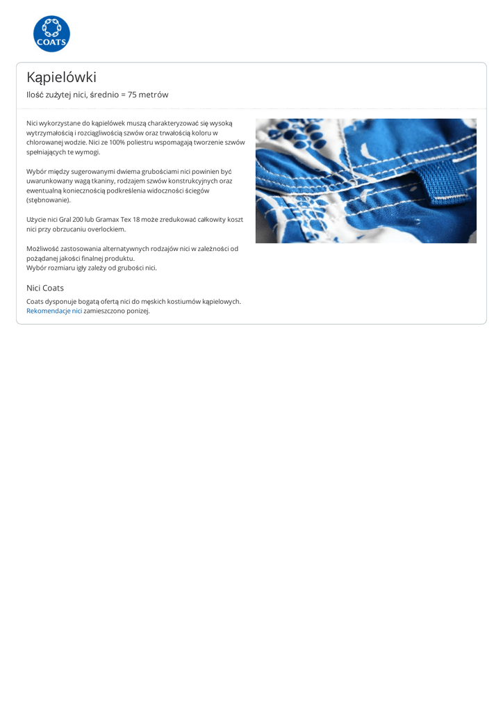 Kąpielówki Ilość zużytej nici, średnio = 75 metrów Nici wykorzystane do kąpielówek muszą charakteryzować się wysoką wytrzymałością i rozciągliwością szwów oraz trwałością koloru w chlorowanej wodzie. Nici ze 100% poliestru wspomagają tworzenie szwów spełniających te wymogi. Wybór między sugerowanymi dwiema grubościami nici powinien być uwarunkowany wagą tkaniny, rodzajem szwów konstrukcyjnych oraz ewentualną koniecznością podkreślenia widoczności ściegów (stębnowanie). Użycie nici Gral 200 lub Gramax Tex 18 może zredukować całkowity koszt nici przy obrzucaniu overlockiem. Możliwość zastosowania alternatywnych rodzajów nici w zależności od pożądanej jakości finalnej produktu. Wybór rozmiaru igły zależy od grubości nici. Nici Coats Coats dysponuje bogatą ofertą nici do męskich kostiumów kąpielowych. Rekomendacje nici zamieszczono ponizej. Numer ściegu Rodzaj ściegu Produkt 1 301 Ścieg stębnowy dwunitkowy (301) Epic Więcej 2 406 Podszywanie dwuigłowe (406) Seamsoft Więcej 504 Ścieg trzynitkowy overlokowy (504) Seamsoft Więcej Seamsoft Więcej Epic Więcej 3 4 516 Ścieg pięcionitkowy overlokowy, obrzucanie trzema nitkami + łańcuszek (516) 5 304-5 Ścieg stębnowy, ozdobny prostokątny (301) Premium Tkaniny Super miękkie szwy Nici przemysłowe Coats dostępne są w szerokiej gamie rodzajów włókien i wykończeń, z których każdy opracowany jest pod kątem konkretnych potrzeb naszych klientów. Zapraszamy do zapoznania się z naszą bogatą ofertą poniżej. W przypadku dostępności innych opcji, proszę wybrać odpowiednią opcję z listy. Wygląd szwu Rodzaj ściegu Numer ściegu Gęstość ściegu (na 3cm) Górna nitka Grubość igły Nm Dolna nitka Produkt Tex Tkt Produkt Tex Tkt 1 Ścieg stębnowy dwunitkowy (301) 301 12 - 14 Epic 24 120 Epic 24 120 70 - 75 2 Podszywanie dwuigłowe (406) 406 14 - 16 Seamsoft 24 140 Seamsoft 18 160 70 - 80 504 14 - 16 Seamsoft 24 140 Seamsoft 18 160 70 - 80 516 14 - 16 Seamsoft 24 140 Seamsoft 18 160 70 - 80 304-5 - Epic 24 120 Epic 24 120 70 - 75 3 4 5 Ścieg trzynitkowy overlokowy (504) Ścieg pięcionitkowy overlokowy, obrzucanie trzema nitkami + łańcuszek (516) Ścieg stębnowy, ozdobny prostokątny (301) Informacje dodatkowe Rekomendacje nici do szycia zamieszczone powyżej pełnią funkcję pomocniczą w produkcji odzieży o wysokiej jakości szwach. Ponieważ elementy tego samego rodzaju mogą różnić się surowcem, konstrukcją, oraz metodami produkcji i postprodukcji, rekomendacje te należy traktować jako wstępne wskazówki w wyborze nici. Szczegółowe rekomendacje w wyborze nici i igieł, precyzyjny szacunek zużycia nici oraz wsparcie techniczne można uzyskać kontaktując się z lokalnym oddziałem Coats. Niniejsze zalecenia i dane na temat zużycia stanowią jedynie wskazówki i udzielone są w dobrej wierze, lecz bez gwarancji lub odpowiedzialności ze strony firmy lub jej pracowników.