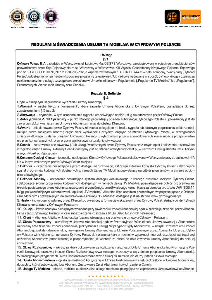 REGULAMIN ŚWIADCZENIA USŁUGI TV MOBILNA W CYFROWYM POLSACIE I. Wstęp §1 Cyfrowy Polsat S. A. z siedzibą w Warszawie, ul. Łubinowa 4a, 03-878 Warszawa, zarejestrowany w rejestrze przedsiębiorców prowadzonym przez Sąd Rejonowy dla m.st. Warszawy w Warszawie, XIII Wydział Gospodarczy Krajowego Rejestru Sądowego pod nr KRS 0000010078, NIP 796-18-10-732, o kapitale zakładowym 13.934.113,44 zł w pełni opłacony, zwany dalej „Cyfrowy Polsat”, udostępnia konsumentom kodowane programy telewizyjne i/lub radiowe nadawane w sposób cyfrowy drogą rozsiewczą naziemną oraz inne usługi, szczegółowo określone w Umowie, niniejszym Regulaminie („Regulamin TV Mobilna” lub „Regulamin”), Promocyjnych Warunkach Umowy oraz Cenniku. Rozdział II. Definicje §2 Użyte w niniejszym Regulaminie wyrażenia i zwroty oznaczają: 1.Abonent – osoba fizyczna (konsument), która zawarła Umowę Abonencką z Cyfrowym Polsatem, posiadająca Sprzęt, z zastrzeżeniem § 5 ust. 2; 2.Aktywacja – czynności, w tym uruchomienie sygnału, umożliwiające odbiór usług świadczonych przez Cyfrowy Polsat; 3.Autoryzowany Punkt Sprzedaży – punkt, którego prowadzący posiada autoryzację Cyfrowego Polsatu i upoważniony jest do zawarcia i dokonywania zmian Umowy z Abonentem oraz do obsługi Klientów; 4.Awaria – nieplanowane przez Cyfrowy Polsat zdarzenie polegające na braku sygnału lub istotnym pogorszeniu odbioru, obejmujące swym zasięgiem znaczną część sieci, wynikające z przyczyn leżących po stronie Cyfrowego Polsatu, w szczególności z nieprawidłowego działania urządzeń Cyfrowego Polsatu, z wyłączeniem przerw spowodowanych koniecznością przeprowadzenia prac konserwacyjnych oraz przerw wynikających z działania siły wyższej; 5.Cennik – zestawienie cen towarów i/lub Usług świadczonych przez Cyfrowy Polsat oraz innych opłat i należności, stanowiące integralną część Umowy. Aktualny Cennik dostępny jest na stronie ww.cyfrowypolsat.pl, w Centrum Obsługi Klienta i w Autoryzowanych Punktach Sprzedaży; 6.Centrum Obsługi Klienta – jednostka obsługująca Klientów Cyfrowego Polsatu zlokalizowana w Warszawie przy ul. Łubinowej 4 A lub w innym wskazanym przez Cyfrowy Polsat miejscu; 7.Dekoder – urządzenie posiadające system dostępu warunkowego, z którego aktualnie korzysta Cyfrowy Polsat, i dekodujące sygnał programów kodowanych dostępnych w ramach Usługi TV Mobilna, pozwalające na odbiór programów na ekranie odbiornika telewizyjnego; 8.Dekoder Mobilny – urządzenie posiadające system dostępu warunkowego, z którego aktualnie korzysta Cyfrowy Polsat, i dekodujące sygnał programów kodowanych dostępnych w ramach Usługi TV Mobilna, pozwalające na odbiór programów na ekranie posiadanego przez Abonenta urządzenia przenośnego, umożliwiającego komunikację za pomocą protokołu WiFi (802.11 b/g), po wcześniejszym zainstalowaniu aplikacji „TV Mobilna”. Aktualna lista urządzeń przenośnych współpracujących z Dekoderem Mobilnym i pozwalających na zainstalowanie aplikacji “TV Mobilna” dostępna jest na stronie www.cyfrowypolsat.pl; 9. Hasło – indywidualny, wybrany przez Klienta kod określony w formacie wskazanym przez Cyfrowy Polsat, służący do identyfikacji Klienta w kontaktach z Cyfrowym Polsatem; 10. Kaucja – kwota środków pieniężnych wpłacana przy zawieraniu Umowy Abonenckiej bądź w trakcie jej trwania, przez Abonenta na rzecz Cyfrowego Polsatu, w celu zabezpieczenia roszczeń z tytułu Usług lub innych należności; 11. Klient – Abonent, Użytkownik lub osoba fizyczna ubiegająca się o zawarcie umowy z Cyfrowym Polsatem; 12. Okres Podstawowy – określony w Umowie Abonenckiej bądź w Promocyjnych Warunkach Umowy zawartej z Abonentem minimalny czas trwania Umowy Abonenckiej (korzystania z Usług). W przypadku gdy Abonentowi, w związku z zawarciem Umowy Abonenckiej, została udzielona ulga, rozwiązanie Umowy Abonenckiej w Okresie Podstawowym przez Abonenta lub przez Cyfrowy Polsat z winy Abonenta, uprawnia Cyfrowy Polsat do naliczenia kary umownej w wysokości nieprzekraczającej wartości ulgi udzielonej Abonentowi pomniejszonej o proporcjonalną jej wartość za okres od dnia zawarcia Umowy Abonenckiej do dnia jej rozwiązania; 13. Okres Rozliczeniowy – okres, za który dokonywane są rozliczenia należności. O ile Umowa Abonencka lub Promocyjne Warunki Umowy nie stanowią inaczej, Okres Rozliczeniowy trwa miesiąc i rozpoczyna się z dniem podpisania Umowy Abonenckiej. W szczególnych przypadkach Okres Rozliczeniowy może trwać dłużej niż miesiąc, nie dłużej jednak niż dwa miesiące. 14. Opłata Abonamentowa – opłata za możliwość korzystania w Okresie Rozliczeniowym z usługi określonej w Umowie Abonenckiej, do zapłaty której zobowiązany jest Abonent. Zestawienie Opłat Abonamentowych zawiera Cennik; 15. Usługa TV Mobilna – płatna, mobilna, audiowizualna usługa medialna, polegająca na zapewnieniu Użytkownikowi lub Abonen- 1 Cyfrowy Polsat S.A. z siedzibą w Warszawie, ul. Łubinowa 4a, 03-878 Warszawa Sąd Rejonowy dla m.st. Warszawy, XIII Wydział Gospodarczy Krajowego Rejestru Sądowego KRS 0000010078, NIP 796-18-10-732, REGON 670925160, GIOŚ – E0001824WZBW Kapitał zakładowy 13.934.113,44 zł w pełni wpłacony towi Cyfrowego Polsatu dostępu do kodowanych programów telewizyjnych i radiowych nadawanych cyfrowo drogą rozsiewczą naziemną. 16. Usługi – Usługi świadczone przez Cyfrowy Polsat, określone w Umowie Abonenckiej, Regulaminie, Promocyjnych Warunkach Umowy bądź w Cenniku; 17. Bezpłatna Naziemna Telewizja Cyfrowa – audiowizualna usługa medialna świadczona przez operatorów Multipleksów, polegająca na zapewnieniu odbiorcom końcowym powszechnego dostępu do niekodowanych programów telewizyjnych nadawanych drogą rozsiewczą naziemną, zgodnie z ustawą z dnia 30 czerwca 2011 r. o wdrożeniu naziemnej telewizji cyfrowej (Dz. U. z dnia 2