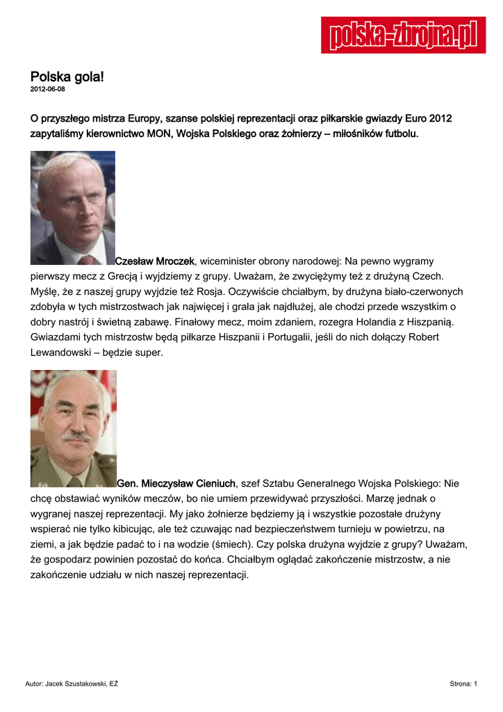 Polska gola! 2012-06-08 O przyszłego mistrza Europy, szanse polskiej reprezentacji oraz piłkarskie gwiazdy Euro 2012 zapytaliśmy kierownictwo MON, Wojska Polskiego oraz żołnierzy – miłośników futbolu. Czesław Mroczek, wiceminister obrony narodowej: Na pewno wygramy pierwszy mecz z Grecją i wyjdziemy z grupy. Uważam, że zwyciężymy też z drużyną Czech. Myślę, że z naszej grupy wyjdzie też Rosja. Oczywiście chciałbym, by drużyna biało-czerwonych zdobyła w tych mistrzostwach jak najwięcej i grała jak najdłużej, ale chodzi przede wszystkim o dobry nastrój i świetną zabawę. Finałowy mecz, moim zdaniem, rozegra Holandia z Hiszpanią. Gwiazdami tych mistrzostw będą piłkarze Hiszpanii i Portugalii, jeśli do nich dołączy Robert Lewandowski – będzie super. Gen. Mieczysław Cieniuch, szef Sztabu Generalnego Wojska Polskiego: Nie chcę obstawiać wyników meczów, bo nie umiem przewidywać przyszłości. Marzę jednak o wygranej naszej reprezentacji. My jako żołnierze będziemy ją i wszystkie pozostałe drużyny wspierać nie tylko kibicując, ale też czuwając nad bezpieczeństwem turnieju w powietrzu, na ziemi, a jak będzie padać to i na wodzie (śmiech). Czy polska drużyna wyjdzie z grupy? Uważam, że gospodarz powinien pozostać do końca. Chciałbym oglądać zakończenie mistrzostw, a nie zakończenie udziału w nich naszej reprezentacji. Autor: Jacek Szustakowski, EŻ Strona: 1 Gen. Waldemar Skrzypczak, były dowódca Wojsk Lądowych, obecnie doradca szefa MON: Obstawiam, że dziś będzie dwa zero dla Polski i nasza drużyna wyjdzie z grupy. Gdybym w to nie wierzył, zmieniłbym obywatelstwo. Nie może nam zabraknąć wiary we własną drużynę. W finale stawiam na Niemców, choć Rosjanie też mogą sprawić niespodziankę. Takie turnieje jak mistrzostwa Europy mają to do siebie, że często faworyci odpadają, a pojawiają się nowe gwiazdy. Dlatego nie typuję na zwycięzcę drużyny Hiszpanii. Stawiam na tych, którzy będą grać ładną, dobrą piłkę. Gen. Bogusław Pacek, były dowódca Żandarmerii Wojskowej, obecnie doradca szefa MON: Nasza drużyna wygra z Grekami, ale nie będzie to duża wygrana. Jestem przekonany, że zwyciężymy też z Rosją, choć rozsądek podpowiada remis. Co do typowania mistrza Europy, to moim zdecydowanym faworytem są Niemcy, którzy mają doskonałych zawodników i są świetnie przygotowani. Drugie miejsce zajmą – jak sądzę – Hiszpanie. Wszystko, co działo się w naszej piłce nożnej, może źle wróżyć, ale historia uczy, że właśnie wtedy, gdy nikt się tego nie spodziewał, biało-czerwoni szli jak burza. Wierzę, że i tym razem nie skończy się tylko na wyjściu z grupy. Jacek Sońta, rzecznik prasowy MON: Przede wszystkim bardzo żałuję, że nie wylosowałem biletów na Euro 2012. Marzyłem, by być na meczu otwarcia, czyli meczu Polska – Autor: Jacek Szustakowski, EŻ Strona: 2 Grecja. Będę oglądał mecze niestety tylko w telewizji i kibicował biało-czerwonym, by grali jak najdłużej. Jako wrodzony optymista wierzę w wygraną naszej drużyny. Mecze Polaków z Rosją i Czechami, podobnie jak ten z Grecją, będą zwycięskie. Na pewno wyjdziemy z grupy. W finale stawiam na Hiszpanię, choć Niemcy mają świetną, doskonale przygotowaną drużynę i też mogą zawalczyć o tytuł mistrza Europy. Kpt. Jakub Wołyński, 23 Śląska Brygada Artylerii w Bolesławcu: Sądzę, że w finale spotkają się Niemcy z Hiszpanią. Wygrają Niemcy. Jeśli chodzi o naszą drużynę to wierzę, że: remis z Grekami, porażka z Rosją i wygrana z reprezentacją Czech dadzą nam wyjście z grupy. Potem jednak trafimy na bardziej wymagających rywali i występ biało-czerwonych zakończy się w ćwierćfinale. Uważam, że gwiazdą tych mistrzostw objawi się niemiecki piłkarz, grający na pozycji pomocnika Mesut Özil. Por. Daniel Myśliński, pomysłodawca i współzałożyciel Wojskowego Klubu Sportowego „Wędrzyn”: Typuję finał Niemcy – Hiszpania. Jeśli tak się stanie, to moje serce będzie rozdarte, bo kibicuję obu drużynom, choć nieco bliższa jest mi Hiszpania. Co do naszej jedenastki to myślę, że po ciężkich bojach zwyciężymy z Grecją, zremisujemy z Rosją i pokonamy Czechów. Jednak w ćwierćfinale trafimy na Niemców, Holendrów lub Portugalczyków. Tych ostatnich jesteśmy w stanie pokonać, ale pewnie nasza reprezentacja zakończy grę w ćwierćfinale. Obym się mylił. Bardzo bym chciał, by gwiazdą Euro 2012 był któryś z naszych zawodników: Maciej Rybus lub Rafał Wolski. Myślę jednak, że będzie to Robin van Persie, Andres Iniesta lub Lukas Podolski, którego może nieść wsparcie polskich kibiców. Autor: Jacek Szustakowski, EŻ Strona: 3 Chor. mar. na ORP „Grom” Daniel Kowalski: Już nie raz bywało, że mistrzostwa przegrywali faworyci, więc serce mi dyktuje, że zwycięzcami mogą być… Polacy. Na pewno po spotkaniach grupowych będziemy w lepszych nastrojach niż przed czterema laty. Liczę bowiem na remis z Rosją i dwa zwycięstwa, a potem w Gdańsku po raz pierwszy wygramy z Niemcami! Dalej jeszcze Anglicy i jesteśmy w finale… Ależ się rozmarzyłem! Co do gwiazdy, to chciałbym żeby był nią Robert Lewandowski. Ma dobry sezon, jest w formie, więc liczę na niego. Sierż. Jakub Sołtysiak, 25 Brygada Kawalerii Powietrznej: Na Euro specjalnie wziąłem urlop, by nie przegapić żadnego meczu. Szansę na puchar mają trzy drużyny: Niemcy, Holandia i Francja. Ten ostatni zespół może być moim zdaniem czarnym koniem mistrzostw. Francuzom nie udały się dwie ostatnie imprezy mistrzowskie. Teraz naprawdę odbudowali się i mają mocny skład. Choć bardziej prawdopodobnym byłaby wygrana Niemców lub Holendrów. Sądzę, że nasza drużyna z Grecją zremisuje, a potem będzie już tylko gorzej: przegramy dwa mecze i nie wyjdziemy z grupy. Stawianie tylko na jednego napastnika Lewandowskiego na takim turnieju nie g