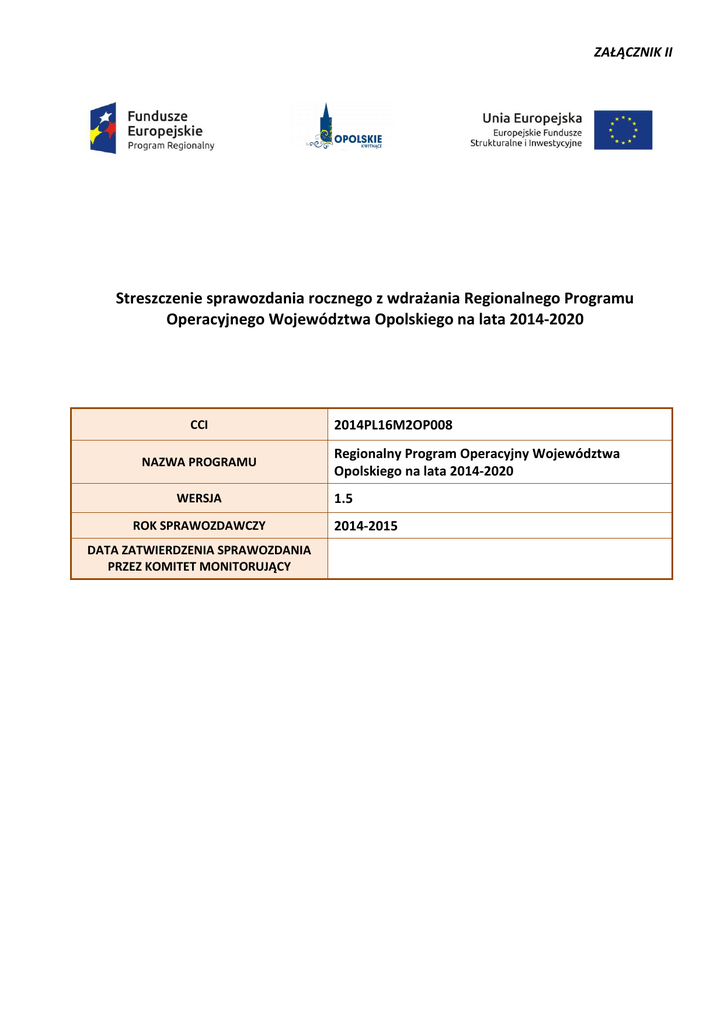 ZAŁĄCZNIK II Streszczenie sprawozdania rocznego z wdrażania Regionalnego Programu Operacyjnego Województwa Opolskiego na lata 2014-2020 CCI NAZWA PROGRAMU WERSJA ROK SPRAWOZDAWCZY DATA ZATWIERDZENIA SPRAWOZDANIA PRZEZ KOMITET MONITORUJĄCY 2014PL16M2OP008 Regionalny Program Operacyjny Województwa Opolskiego na lata 2014-2020 1.5 2014-2015 Opracowanie: Instytucja Zarządzająca RPO WO 2014-2020 Opole, Maj 2016 r. 2 SPIS TREŚCI Strona WYKAZ SKRÓTÓW 4 1 INFORMACJE WSTĘPNE 5 2 PRZEGLĄD WDRAŻANIA PROGRAMU OPERACYJNEGO 6 2.1 OGÓLNE INFORMACJE FINANSOWE 6 2.2 INSTRUMENTY FINANSOWE 11 3 PRZEPROWADZONE EWALUACJE 11 4 KWESTIE MAJĄCE WPŁYW NA WYKONANIE PROGRAMU 12 4.1 KWESTIE MAJĄCE WPŁYW NA WYKONANIE PROGRAMU 12 4.2 OCENA POSTĘPÓW POCZYNIONYCH W ZAKRESIE REALIZACJI CELÓW POŚREDNICH 13 SZCZEGÓLNE PRZEDSIĘWZIĘCIA MAJĄCE NA CELU PROMOWANIE RÓWNOUPRAWNIENIA PŁCI ORAZ ZAPOBIEGANIE DYSKRYMINACJI 13 5 3 Wykaz skrótów EFRR Europejski Fundusz Rozwoju Regionalnego EFS Europejski Fundusz Społeczny GUS Główny Urząd Statystyczny IC Instytucja Certyfikująca IP Instytucja Pośrednicząca IZ Instytucja Zarządzająca KE Komisja Europejska KM RPO WO 2014-2020 Komitet Monitorujący Regionalny Program Operacyjny Województwa Opolskiego na lata 2014-2020 MR Ministerstwo Rozwoju OCRG Opolskie Centrum Rozwoju Gospodarki OFiP RPO WO 2014-2020 Opis Funkcji i Procedur Obowiązujących w Instytucji Zarządzającej oraz Instytucji Certyfikującej. Regionalny Program Operacyjny Województwa Opolskiego na lata 2014-2020 OP Oś Priorytetowa PI Priorytet Inwestycyjny PO KL Program Operacyjny Kapitał Ludzki RPDPT Roczny Plan Działań Pomocy Technicznej RPO WO 2007-2013 Regionalny Program Operacyjny Województwa Opolskiego na lata 2007-2013 RPO WO 2014-2020 Regionalny Program Operacyjny Województwa Opolskiego na lata 2014-2020 SZOOP RPO WO 2014-2020 Szczegółowy Opis Osi Priorytetowych Regionalnego Programu Operacyjnego Województwa Opolskiego na lata 2014-2020 UMWO Urząd Marszałkowski Województwa Opolskiego WUP Wojewódzki Urząd Pracy Związek ZIT Związek Zintegrowanych Inwestycji Terytorialnych 4 1. INFORMACJE WSTĘPNE Regionalny Program Operacyjny Województwa Opolskiego na lata 2014-2020 nr CCI 2014PL16M2OP008 został przyjęty przez Komisję Europejską Decyzją nr C(2014)10195 z dnia 18 grudnia 2014 r. oraz Uchwałą nr 347/2015 ZWO z dnia 11 marca 2015 r. w sprawie przyjęcia Komunikatu IZ RPO WO 2014-2020 dotyczącego RPO WO 2014-2020. Realizacja Programu przyczynić się ma do zwiększenia konkurencyjności i innowacyjności gospodarki oraz poprawy jakości życia w wielokulturowym regionie opolskim. W myśl wyzwań, celów rozwojowych UE oraz Polski celem interwencji RPO WO 2014-2020 jest podejmowanie i wspieranie działań na rzecz pobudzania aktywności społecznej, poprawy spójności społecznej oraz zwiększanie konkurencyjności gospodarki regionalnej. Biorąc pod uwagę zapisy Strategii Rozwoju Województwa Opolskiego do 2020, w Programie uwzględniony został wymiar terytorialny, który ma zastosowanie do określonych w Umowie Partnerstwa obszarów strategicznej interwencji, tj. miasta wojewódzkiego z obszarem funkcjonalnym, miast wymagających rewitalizacji, obszarów przygranicznych. Szczególne znaczenie ma specyficzny dla regionu Obszar Strategicznej Interwencji Depopulacja, który ze względu na wyróżniające na tle kraju i UE zjawiska demograficzne obejmuje całe województwo opolskie. Alokacja środków UE w ramach RPO WO 2014-2020 wynosi 944 967 792 Euro, w tym 56 698 068 Euro stanowią środki w ramach Rezerwy Wykonania. Obowiązek sporządzania sprawozdań rocznych z wdrażania Programu wynika z art. 50 rozporządzenia Parlamentu Europejskiego i Rady (UE) nr 1303/2013 z dnia 17 grudnia 2013 r. ustanawiające wspólne przepisy dotyczące Europejskiego Funduszu Rozwoju Regionalnego, Europejskiego Funduszu Społecznego, Funduszu Spójności, Europejskiego Funduszu Rolnego na rzecz Rozwoju Obszarów Wiejskich oraz Europejskiego Funduszu Morskiego i Rybackiego oraz ustanawiającego przepisy ogólne dotyczące Europejskiego Funduszu Rozwoju Regionalnego, Europejskiego Funduszu Społecznego, Funduszu Spójności i Europejskiego Funduszu Morskiego i Rybackiego oraz uchylającego rozporządzenie Rady (WE) nr 1083/2006. Realizując ww. obowiązek oraz stosując zasady sprawozdawczości wymagane przez krajowe akty prawne, a także dobre praktyki wypracowane w latach poprzednich, Instytucja Zarządzająca przygotowała Sprawozdanie roczne z wdrażania Regionalnego Programu Operacyjnego Województwa Opolskiego na lata 2014-2020 (za lata 2014-2015), które zostanie przyjęte przez Komitet Monitorujący RPO WO 2014-2020. Prezentowane streszczenie stanowi syntetyczny opis wyników wdrażania RPO WO 2014-2020. Dla czytelności dokumentu w każdej z części znajdują się odniesienia do treści sprawozdania rocznego oraz jego załączników, prezentowane jak w przykładzie poniżej: Sprawozdanie - pkt. 2.1 System realizacji Programu Operacyjnego Streszczenie, podobnie jak pozostałe załączniki Sprawozdania zostanie przekazane Komisji Europejskiej poprzez elektroniczny system SFC2014. 5 2. PRZEGLĄD WDRAŻANIA PROGRAMU OPERACYJNEGO 2.1 OGÓLNE INFORMACJE FINANSOWE ALOKACJA ⇒ łączna kwota alokacji na RPO WO 2014-2020 wynosi 944 967 792 Euro (888 269 724 Euro bez Rezerwy Wykonania); ⇒ kwota alokacji z EFRR stanowi 679 152 913 Euro, natomiast z EFS 265 814 879 Euro. NABORY WNIOSKÓW ⇒ do końca grudnia 2015 r. przeprowadzono łącznie 19 naborów wniosków: 9 w procedurze konkursowej oraz 10 w pozakonkursowej (łącznie z Planami Działań Pomocy Technicznej RPO WO 2014-2020 na lata 2014-2015 oraz na rok 2016), ⇒ kwota alokacji EFRR/EFS przeznaczona na przeprowadzone nabory wniosków wyniosła 113,80 mln Euro (w trybie konkursowym i pozakonkursowym), co stanowi około 13% środków przeznaczonych na wszystkie nabory w latach 2014-2020. Zestawienie przeprowadzonych na