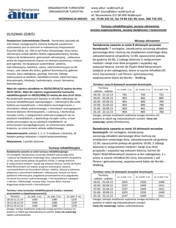Agencja Turystyczna ORGANIZATOR TURNUSÓW ORGANIZATOR TURYSTYKI www.altur- walbrzych.pl e-mail: [email protected] Al. Wyzwolenia 3/2 58-300 Wałbrzych REZERWACJA MIEJSC: tel. 74 84 242 22, fax 74 84 221 49, kom. 506 716 255 Turnusy rehabilitacyjne, wczasy zdrowotne, wczasy wypoczynkowe, wczasy świąteczne i noworoczne DUSZNIKI-ZDRÓJ Sanatorium Uzdrowiskowe Chemik - kameralny (posiada ok. 120 miejsc noclegowych), stylowy budynek sanatorium usytuowany jest w centrum w malowniczej miejscowości Duszniki-Zdrój, ok. 150 m od Parku Zdrojowego. Duży teren rekreacyjny wokół obiektu ładnie zagospodarowany: boisko, miejsca do leżakowania i gimnastyki rekreacyjnej, zadaszona wiata do organizowania imprez na świeżym powietrzu, miejsce pod ognisko. Do dyspozycji uczestników: jadalnia, sala telewizyjna, świetlica, sauna, sala konferencyjna na 30 miejsc, sala zabaw dla dzieci, gabinet kosmetyczny, gabinet masażu, baza zabiegowa, parking, Internet. Zabiegi wykonywane w obiekcie: światłolecznictwo, elektroterapia, kinezyterapia, inhalacje, hydroterapia, masaż, borowina, laseroterapia. Wpis do rejestru ośrodków nr OD/02/0014/12 ważny do dnia 20.07.2015r. Wpis do rejestru organizatorów turnusów rehabilitacyjnych nr OR/02/006/12 ważny do dnia 19.07.2015r. Na podstawie powyższych wpisów w ośrodku odbywają się turnusy rehabilitacyjne usprawniająco – rekreacyjne dla osób: kobiety po mastektomii, z chorobami neurologicznymi, z chorobami układu pokarmowego, z chorobami wymagającymi leczenia dietami eliminacyjnymi, z cukrzycą, z dysfunkcją narządu ruchu, z wyłączeniem osób poruszających się na wózkach inwalidzkich, z dysfunkcją narządu ruchu, w tym osoby poruszające się na wózkach inwalidzkich, ze schorzeniami laryngologicznymi, ze schorzeniami układu krążenia, ze schorzeniami układu oddechowego. Zakwaterowanie: pokoje 1, 2, 3 i 4 osobowe z łazienką. W każdym pokoju telewizor i czajnik bezprzewodowy. Wyżywienie: 3 posiłki dziennie. Turnusy rehabilitacyjne Świadczenia zawarte w cenie turnusu rehabilitacyjnego: 14 noclegów, świadczenia zaczynają obiadem pierwszego dnia i kończą się śniadaniem ostatniego dnia, zakwaterowanie od godziny 17.00, opuszczenie pokoju do godziny 10.00, 2 zabiegi dziennie (z wyłączeniem niedziel i świąt) wg wskazań lekarza, karnet do Pijalni Wód Mineralnych (14 wejść), program animacyjny: spacery z przewodnikiem po Dusznikach-Zdroju i okolicy, kolacja w plenerze połączona z pieczeniem kiełbasek i zabawą przy muzyce na żywo, spotkanie informacyjne, pogadanki prozdrowotne oraz pogadanka na temat lecznictwa uzdrowiskowego, 3 dni bezpłatnych zabiegów z zakresu: refleksologii, masaży stóp, masaży dłoni, masaży kręgosłupa połączonych z konsultacjami. Terminy i ceny turnusów rehabilitacyjnych (osoby z ważnym orzeczeniem o niepełnosprawności): Terminy os. pok. 1 os. os. pok. 2 os. os. pok. 3 os. 28.10-11.11.14 1430 1380 1270 18.11-02.12.14 1430 1380 1270 09.12-23.12.14 1430 1380 1270 Uwaga: istnieje możliwość wybrania innego terminu turnusu niż podane w tabeli wg indywidualnych ustaleń. Ceny nie zawierają: opłaty uzdrowiskowej. Wczasy zdrowotne Świadczenia zawarte w cenie 8 dniowych wczasów leczniczych: 7 noclegów, świadczenia zaczynają obiadem pierwszego dnia i kończą się śniadaniem ostatniego dnia, zakwaterowanie od godziny 12.00, opuszczenie pokoju do godziny 10.00, 2 zabiegi dziennie (z wyłączeniem niedziel i świąt oraz dnia przyjazdu i wyjazdu) wg wskazań lekarza, karnet do Pijalni Wód Mineralnych (wejścia w dni zabiegowe), seans w saunie InfraRed (45 min), korzystanie z sali fitness i gimnastycznej, wypożyczenie kijów do Nordic - Walking. Terminy i ceny 8 dniowych wczasów leczniczych: Terminy os. w pok. 1 os. os. w pok. 2 os. os. w pok. 3 os. sobota - sobota 04.10 - 21.12.14 791 742 721 04.01 - 01.03.15 903 861 805 02.03 - 02.04.15 854 805 784 07.04 - 31.05.15 854 805 784 01.06 - 30.09.15 903 861 805 01.10 - 22.12.15 854 805 784 Uwaga: istnieje możliwość wybrania innego terminu niż podane w tabeli wg indywidualnych ustaleń. Ceny nie zawierają: opłaty klimatycznej. Świadczenia zawarte w cenie 14 dniowych wczasów leczniczych: 14 noclegów, świadczenia zaczynają obiadem pierwszego dnia i kończą się śniadaniem ostatniego dnia, zakwaterowanie od godziny 12.00, opuszczenie pokoju do godziny 10.00, 2 zabiegi dziennie (z wyłączeniem niedziel i świąt oraz dnia przyjazdu i wyjazdu) wg wskazań lekarza, karnet do Pijalni Wód Mineralnych (wejścia w dni zabiegowe), 2 x seans w saunie InfraRed (45 min), korzystanie z sali fitness i gimnastycznej, wypożyczenie kijów do Nordic Walking. Terminy i ceny 14 dniowych wczasów leczniczych: Terminy os. w pok. 1 os. os. w pok. 2 os. os. w pok. 3 os. sobota - sobota 04.01 - 01.03.15 1625 1550 1449 02.03 - 02.04.15 1537 1449 1411 07.04 - 31.05.15 1537 1449 1411 01.06 - 30.09.15 1625 1550 1449 01.10 - 22.12.15 1537 1449 1411 Uwaga: istnieje możliwość wybrania innego terminu niż podane w tabeli wg indywidualnych ustaleń. Ceny nie zawierają: opłaty uzdrowiskowej. Wczasy noworoczne Wczasy wypoczynkowe Świadczenia zawarte w cenie 8 dniowych wczasów wypoczynkowych: 7 noclegów, świadczenia zaczynają się obiadem lub obiadokolacją pierwszego dnia i kończą się śniadaniem ostatniego dnia, zakwaterowanie od godziny 12.00, opuszczenie pokoju do godziny 10.00 .(Wyżywienie do wyboru: 2 posiłki dziennie: śniadania i obiadokolacje (HP) lub 3 posiłki dziennie: śniadania, obiady i kolacje (VP)). Świadczenia zawarte w cenie 5 dniowych wczasów noworocznych: 4 noclegi, 4 śniadania, 4 serwowane obiadokolacje, Bal Sylwestrowy w Janie Kazimierzu w rytmach Italiano Disco. Świadczenia zaczynają rano pierwszego dnia zakwaterowanie od godziny 9.00, pierwsze świadczenie obiadokolacja i kończą sę śniadaniem ostatniego dnia, opuszczenie pokoju do godziny 10.00. Terminy i ceny 8 dniowych wczasów wypoczynkowych: Świadczenia zawa