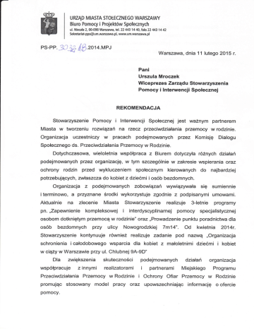 I URĄD MlAsTA STOŁECZNEGo WARSZAWY Biuro Pomocy i Projektów Społeanych ul. Niecala 2, 00-098 Warszawa, tel, 22 ,l43 14 40, fak 22 44314 42 [email protected]§zawa,pl, www.um,warszawa.pl ps-pp. "H 3ł [ fi .zol4.MpJ Warszawa, dnia 11 lutego 2015 Pani urszula Mroczek Wi ceprez es Zarządu Stowa rzysze Pomocy i lnterwencji Społecznej n i r. a REKOMENDACJA Stowarzyszenie Pomocy i lnterwencji Społecznej jest waznym partnerem Miasta w tworzeniu rozwiązań na rzecz pzeciwdziałania przemocy w rodzinie. Organizacja uczestniczy w pracach podejmowanych przez Komisję Dialogu Społecznego ds. Pzeciwdziałania Przemocy w Rodzinie. Dotychczasowa, wieloletnia współpraca z Biurem dotyczyła różnych działań podejmowanych przez organizację, w tym szczególnie w zakresie wspierania oraz ochrony rodzin przed wykluczeniem społecznym kierowanych do najbardziej potrzebujących, ał,tłaszcza do kobiet zdziećmi iosób bezdomnych. Organizacja iterminowo, Aktualnie a z podejmowanych zobowiązań wywiązywała się sumiennie przyznane środkiwykorzystuje zgodnie na zlecenie Miasta z podpisanymi umowami. Stowarzyszenie realizuje 3-1etnie programy pn.,,Zapewnienie kompleksowej i interdyscyplinarnej pomocy specjalistycznE osobom dotkniętym przemocą w rodzinie" oraz,,Prowadzenie punktu poradnictwa dla osób bezdomnych przy ulicy Nowogrodzkiej 7m14". Od kwietnia 2O14r. Stowarzyszenie kontynuuje również realizuje zadanie pod nazwą ,,Organizacja schronienia icałodobowego wsparcia dla kobiet z małoletnimi dziećmi i kobiet w ciąży w Warszawie przy ul. Chlubnej 9A-9D" Dla zwiększenia skutecznościpodejmowanych działań organizacja współpracuje z innymi realizatorami i pańnerami Miejskiego Programu Przeciwdziałania Przemocy w Rodzinie i Ochrony Ofiar Przemocy w Rodzinie promując stosowany model pracy oraz upowszechniając informację o ofercie pomocy. Stowarzyszenie posiada doświadczenie w zakresie świadczenia pomocy osobom doznającym przemocy w rodzinie oraz aktywnie współpracuje w zespołach interdyscyplinarnych ds. przeciwdziałania pzemocy w rodzinie na terenie m.st, Warszawy. Posiada kompetencje do wykonywania zleoonych zadań, profesjonalną kadrę, właściwąbazę lokalową oraz gotowośćdo wymiany doświadczeń. Rekomend ację p rzyg otowano na prośbęorgan izacj i.