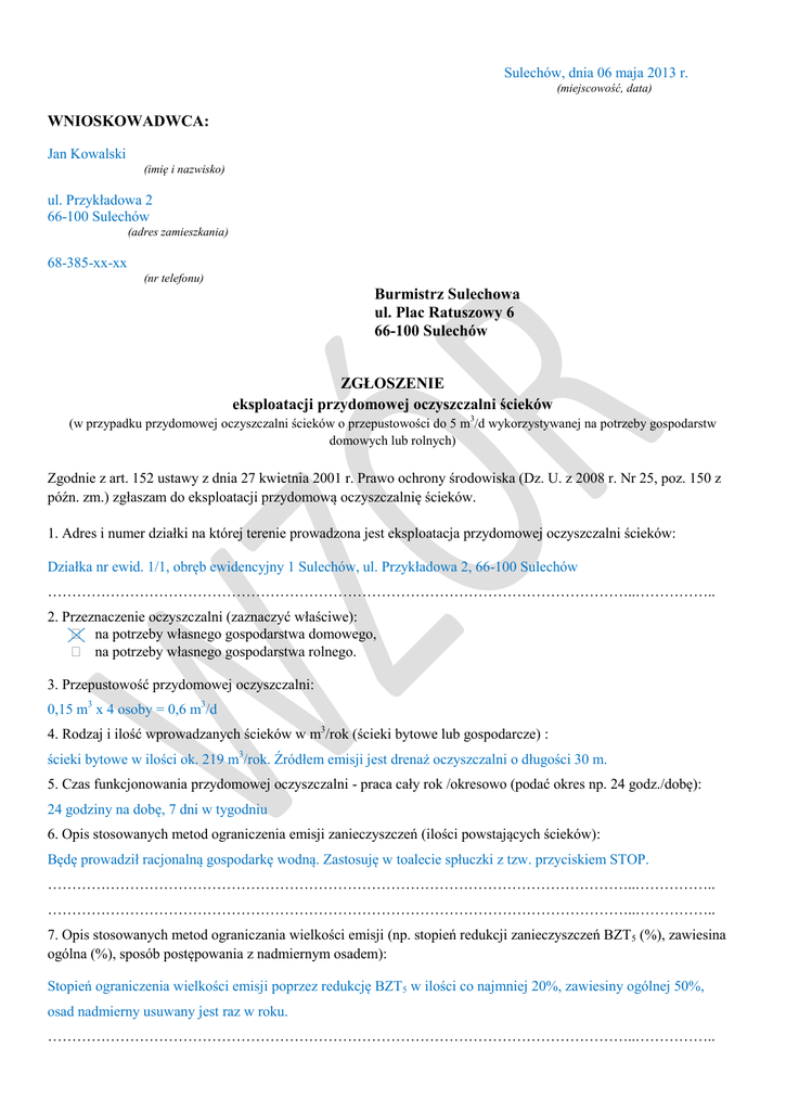 Sulechów, dnia 06 maja 2013 r. (miejscowość, data) WNIOSKOWADWCA: Jan Kowalski (imię i nazwisko) ul. Przykładowa 2 66-100 Sulechów (adres zamieszkania) 68-385-xx-xx (nr telefonu) Burmistrz Sulechowa ul. Plac Ratuszowy 6 66-100 Sulechów ZGŁOSZENIE eksploatacji przydomowej oczyszczalni ścieków (w przypadku przydomowej oczyszczalni ścieków o przepustowości do 5 m3/d wykorzystywanej na potrzeby gospodarstw domowych lub rolnych) Zgodnie z art. 152 ustawy z dnia 27 kwietnia 2001 r. Prawo ochrony środowiska (Dz. U. z 2008 r. Nr 25, poz. 150 z późn. zm.) zgłaszam do eksploatacji przydomową oczyszczalnię ścieków. 1. Adres i numer działki na której terenie prowadzona jest eksploatacja przydomowej oczyszczalni ścieków: Działka nr ewid. 1/1, obręb ewidencyjny 1 Sulechów, ul. Przykładowa 2, 66-100 Sulechów …………………………………………………………………………………………………………..…………….. 2. Przeznaczenie oczyszczalni (zaznaczyć właściwe): na potrzeby własnego gospodarstwa domowego, na potrzeby własnego gospodarstwa rolnego. 3. Przepustowość przydomowej oczyszczalni: 0,15 m3 x 4 osoby = 0,6 m3/d 4. Rodzaj i ilość wprowadzanych ścieków w m3/rok (ścieki bytowe lub gospodarcze) : ścieki bytowe w ilości ok. 219 m3/rok. Źródłem emisji jest drenaż oczyszczalni o długości 30 m. 5. Czas funkcjonowania przydomowej oczyszczalni - praca cały rok /okresowo (podać okres np. 24 godz./dobę): 24 godziny na dobę, 7 dni w tygodniu 6. Opis stosowanych metod ograniczenia emisji zanieczyszczeń (ilości powstających ścieków): Będę prowadził racjonalną gospodarkę wodną. Zastosuję w toalecie spłuczki z tzw. przyciskiem STOP. …………………………………………………………………………………………………………..…………….. …………………………………………………………………………………………………………..…………….. 7. Opis stosowanych metod ograniczania wielkości emisji (np. stopień redukcji zanieczyszczeń BZT5 (%), zawiesina ogólna (%), sposób postępowania z nadmiernym osadem): Stopień ograniczenia wielkości emisji poprzez redukcję BZT5 w ilości co najmniej 20%, zawiesiny ogólnej 50%, osad nadmierny usuwany jest raz w roku. …………………………………………………………………………………………………………..…………….. 8. Informacja, czy stopień ograniczenia wielkości emisji jest zgodny z obowiązującymi przepisami (czy oczyszczalnia posiada certyfikat zgodności z normami i jaki). Stopień ograniczenia emisji jest zgodny z obowiązującymi przepisami, tzn. spełnione są warunki określone w rozporządzeniu przytoczonym w pouczeniu. Oczyszczalnia na certyfikat zgodności z nomą PN-EN 12566-3. Osad zostaje wywożony przez firmę posiadającą odpowiednie uprawienia do wykonywania tych czynności. ………………..……….…………………… (podpis) Załączniki (zaznaczyć dołączone dokumenty): mapa sytuacyjno-wysokościowa z naniesioną lokalizacją oczyszczalni ścieków lub powykonawcza inwentaryzacja geodezyjna, informacja potwierdzająca tytuł prawny do instalacji (kopia aktu notarialnego, umowy dzierżawy, umowy najmu), kopia zgłoszenia budowy indywidualnej przydomowej oczyszczalni ścieków, kopia dokumentacji technicznej przydomowej oczyszczalni ścieków (instrukcja eksploatacji), ekspertyzy, atesty lub certyfikat dotyczący montowanej oczyszczalni ścieków, opinia o gruncie zawierająca w szczególności informacje o głębokości położenia najwyższego użytkowego poziomu wodonośnego wód podziemnych, chłonności gruntu, pełnomocnictwo, w przypadku dokonania zgłoszenia przez pełnomocnika, dowód wpłaty opłaty skarbowej : za zgłoszenie – 120 zł (w przypadku korzystania z przydomowej oczyszczalni na inne potrzeby niż budynek mieszkalny) za pełnomocnictwo – 17 zł. Pouczenie dla użytkownika instalacji: Zgodnie z Rozporządzeniem Ministra Środowiska z dnia 24 lipca 2006 r. w sprawie warunków jakie należy spełnić przy wprowadzeniu ścieków do wód lub do ziemi oraz w sprawie substancji szczególnie szkodliwych dla środowiska wodnego (Dz. U. z 2006 Nr 137, poz. 984 z późn. zm.), ścieki pochodzące z własnego gospodarstwa domowego lub rolnego mogą być wprowadzane do ziemi, w granicach gruntu stanowiącego własność wprowadzającego, jeżeli spełnione są łącznie następujące warunki: ilość ścieków nie przekracza 5,0 m3 na dobę, BZT5 ścieków dopływających jest redukowane co najmniej o 20% a zawartość zawiesin ogólnych co najmniej o 50%, miejsce wprowadzania ścieków oddzielone jest warstwą gruntu o miąższości co najmniej 1,5 m od najwyższego użytkowego poziomu wodonośnego wód podziemnych. Zgodnie z art. 122 w związku z art. 37 ustawy z dnia 18 lipca 2001 r. Prawo wodne (Dz. U. z 2012 r. poz. 145 z późn. zm.) w przypadku przekroczenia ram zwykłego korzystania z wód, konieczne jest uzyskanie pozwolenia wodnoprawnego. Zgodnie z art. 36 ust.3 pkt 3 i 4 w/w ustawy przekracza się ramy zwykłego korzystania z wód m. in. w przypadku: korzystania z oczyszczalni na potrzeby działalności gospodarczej, gdy oczyszczone ścieki wprowadzane będą do wód lub do ziemi w ilości przekraczającej 5 m3/d. Zgodnie z art. 152 ust. 4 ustawy Prawo ochrony środowiska (Dz. U. z 2008 r. Nr 25, poz. 150 z późn. zm.) do rozpoczęcia eksploatacji przydomowej oczyszczalni można przystąpić jeżeli organ właściwy do przyjęcia zgłoszenia wykonania robót budowlanych w terminie 30 dni od dnia przyjęcia zgłoszenia nie wniesie sprzeciwu w drodze decyzji. Organem właściwym do dokonania zgłoszenia budowy przydomowej oczyszczalni ścieków o wydajności do 7,5 m 3/d jest starosta. Po przystąpieniu do eksploatacji przydomowej oczyszczalni ścieków zgodnie z zapisem art. 152 ustawy z dnia 27 kwietnia