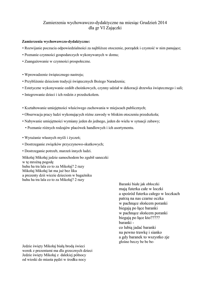 Zamierzenia wychowawczo-dydaktyczne na miesiąc Grudzień 2014 dla gr VI Zajączki Zamierzenia wychowawczo-dydaktyczne: • Rozwijanie poczucia odpowiedzialności za najbliższe otoczenie, porządek i czystość w nim panujące; • Poznanie czynności gospodarczych wykonywanych w domu; • Zaangażowanie w czynności prospołeczne. • Wprowadzenie świątecznego nastroju; • Przybliżenie dzieciom tradycji świątecznych Bożego Naradzenia; • Estetyczne wykonywanie ozdób choinkowych, czynny udział w dekoracji drzewka świątecznego i sali; • Integrowanie dzieci i ich rodzin z przedszkolem. • Kształtowanie umiejętności właściwego zachowania w miejscach publicznych; • Obserwacja pracy ludzi wykonujących różne zawody w bliskim otoczeniu przedszkola; • Nabywanie umiejętności wymiany jeden do jednego, jeden do wielu w sytuacji zabawy; • Poznanie różnych rodzajów placówek handlowych i ich asortymentu. • Wyrażanie własnych myśli i życzeń; • Dostrzeganie związków przyczynowo-skutkowych; • Dostrzeganie potrzeb, marzeń innych ludzi. Mikołaj Mikołaj jedzie samochodem bo zgubił saneczki w tę mroźną pogodę huhu ha tra lala co to za Mikołaj? 2 razy Mikołaj Mikołaj lat ma już bez liku a prezenty dziś wiezie dzieciom w bagażniku huhu ha tra lala co to za Mikołaj? 2 razy Baranki białe jak obłoczki mają futerka całe w loczki a spośród futerka całego w loczkach patrzą na nas czarne oczka w pachnące słońcem poranki biegają po łące baranki w pachnące słońcem poranki biegają po łące kto????? baranki co lubią jadać baranki na pewno trawkę i sianko a gdy baranek to wszystko zje głośno beczy be be beJedzie święty Mikołaj białą brodą świeci worek z prezentami ma dla grzecznych dzieci Jedzie święty Mikołaj z dalekiej północy od wioski do miasta pędzi w środku nocy