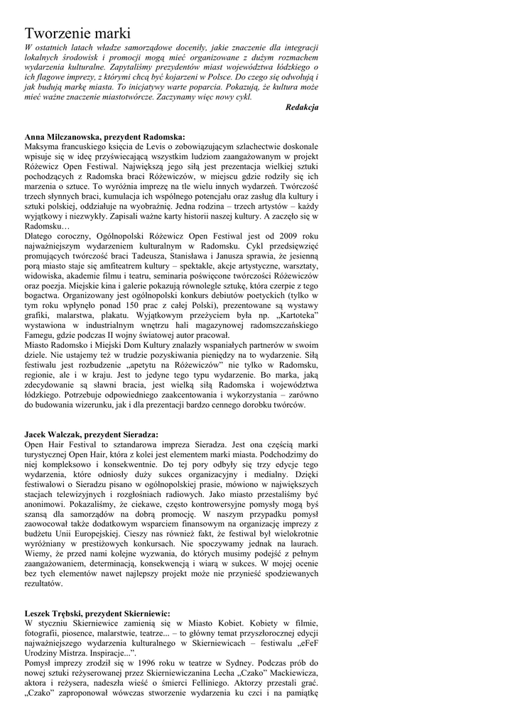 Tworzenie marki W ostatnich latach władze samorządowe doceniły, jakie znaczenie dla integracji lokalnych środowisk i promocji mogą mieć organizowane z dużym rozmachem wydarzenia kulturalne. Zapytaliśmy prezydentów miast województwa łódzkiego o ich flagowe imprezy, z którymi chcą być kojarzeni w Polsce. Do czego się odwołują i jak budują markę miasta. To inicjatywy warte poparcia. Pokazują, że kultura może mieć ważne znaczenie miastotwórcze. Zaczynamy więc nowy cykl. Redakcja Anna Milczanowska, prezydent Radomska: Maksyma francuskiego księcia de Levis o zobowiązującym szlachectwie doskonale wpisuje się w ideę przyświecającą wszystkim ludziom zaangażowanym w projekt Różewicz Open Festiwal. Największą jego siłą jest prezentacja wielkiej sztuki pochodzących z Radomska braci Różewiczów, w miejscu gdzie rodziły się ich marzenia o sztuce. To wyróżnia imprezę na tle wielu innych wydarzeń. Twórczość trzech słynnych braci, kumulacja ich wspólnego potencjału oraz zasług dla kultury i sztuki polskiej, oddziałuje na wyobraźnię. Jedna rodzina – trzech artystów – każdy wyjątkowy i niezwykły. Zapisali ważne karty historii naszej kultury. A zaczęło się w Radomsku… Dlatego coroczny, Ogólnopolski Różewicz Open Festiwal jest od 2009 roku najważniejszym wydarzeniem kulturalnym w Radomsku. Cykl przedsięwzięć promujących twórczość braci Tadeusza, Stanisława i Janusza sprawia, że jesienną porą miasto staje się amfiteatrem kultury – spektakle, akcje artystyczne, warsztaty, widowiska, akademie filmu i teatru, seminaria poświęcone twórczości Różewiczów oraz poezja. Miejskie kina i galerie pokazują równolegle sztukę, która czerpie z tego bogactwa. Organizowany jest ogólnopolski konkurs debiutów poetyckich (tylko w tym roku wpłynęło ponad 150 prac z całej Polski), prezentowane są wystawy grafiki, malarstwa, plakatu. Wyjątkowym przeżyciem była np. „Kartoteka” wystawiona w industrialnym wnętrzu hali magazynowej radomszczańskiego Famegu, gdzie podczas II wojny światowej autor pracował. Miasto Radomsko i Miejski Dom Kultury znalazły wspaniałych partnerów w swoim dziele. Nie ustajemy też w trudzie pozyskiwania pieniędzy na to wydarzenie. Siłą festiwalu jest rozbudzenie „apetytu na Różewiczów” nie tylko w Radomsku, regionie, ale i w kraju. Jest to jedyne tego typu wydarzenie. Bo marka, jaką zdecydowanie są sławni bracia, jest wielką siłą Radomska i województwa łódzkiego. Potrzebuje odpowiedniego zaakcentowania i wykorzystania – zarówno do budowania wizerunku, jak i dla prezentacji bardzo cennego dorobku twórców. Jacek Walczak, prezydent Sieradza: Open Hair Festival to sztandarowa impreza Sieradza. Jest ona częścią marki turystycznej Open Hair, która z kolei jest elementem marki miasta. Podchodzimy do niej kompleksowo i konsekwentnie. Do tej pory odbyły się trzy edycje tego wydarzenia, które odniosły duży sukces organizacyjny i medialny. Dzięki festiwalowi o Sieradzu pisano w ogólnopolskiej prasie, mówiono w największych stacjach telewizyjnych i rozgłośniach radiowych. Jako miasto przestaliśmy być anonimowi. Pokazaliśmy, że ciekawe, często kontrowersyjne pomysły mogą byś szansą dla samorządów na dobrą promocję. W naszym przypadku pomysł zaowocował także dodatkowym wsparciem finansowym na organizację imprezy z budżetu Unii Europejskiej. Cieszy nas również fakt, że festiwal był wielokrotnie wyróżniany w prestiżowych konkursach. Nie spoczywamy jednak na laurach. Wiemy, że przed nami kolejne wyzwania, do których musimy podejść z pełnym zaangażowaniem, determinacją, konsekwencją i wiarą w sukces. W mojej ocenie bez tych elementów nawet najlepszy projekt może nie przynieść spodziewanych rezultatów. Leszek Trębski, prezydent Skierniewic: W styczniu Skierniewice zamienią się w Miasto Kobiet. Kobiety w filmie, fotografii, piosence, malarstwie, teatrze... – to główny temat przyszłorocznej edycji najważniejszego wydarzenia kulturalnego w Skierniewicach – festiwalu „eFeF Urodziny Mistrza. Inspiracje...”. Pomysł imprezy zrodził się w 1996 roku w teatrze w Sydney. Podczas prób do nowej sztuki reżyserowanej przez Skierniewiczanina Lecha „Czako” Mackiewicza, aktora i reżysera, nadeszła wieść o śmierci Felliniego. Aktorzy przestali grać. „Czako” zaproponował wówczas stworzenie wydarzenia ku czci i na pamiątkę Mistrza. Przeniesiona na grunt Polski „Felliniada” przez pięć pierwszych lat odbywała się w Skierniewicach, potem w Warszawie. W ostatnich latach równolegle. Teraz wydarzenie dziać się będzie wyłącznie w Skierniewicach. Patronujący festiwalowi Wielki Mistrz Fellini nadal jest w naszej pamięci, ale bardziej jako pretekst niż tło wydarzeń. „eFeF” to impreza niszowa, niekomercyjna, szereg dziejących się równocześnie lub zazębiających się wydarzeń artystycznych. Uczestnik musi dokonywać wyborów: czy wyjść ze spektaklu, by obejrzeć film, czy pójść na koncert lub spotkać się z utytułowanym reżyserem, operatorem, aktorem etc. „eFeF” łączy wiele form: od filmowych i teatralnych, poprzez malarstwo, grafikę czy koncerty. Stałym elementem festiwalu jest też konkurs filmowy na bardzo krótki metraż – do 4 minut. To jedyne wydarzenie w naszym mieście, podczas którego spotykają się przedstawiciele różnych dziedzin sztuki, o różnych doświadczeniach i w różnym wieku: od nastolatków po seniorów. Naszych artystów wyróżniamy Nagrodą Dużego „eFeF”. Co istotne, nie przyznają jej urzędnicy. Zwycięzcy są wybierani w plebiscycie przez publiczność festiwalu. Projekt w całości finansuje miasto, dzięki czemu wstęp na imprezę jest wolny. Tylko ostatni koncert – gwiazd takich jak Maleńczuk czy Waglewski Fisz Emade – to impreza biletowana. „eFeF” zazwyczaj zaczyna się w sobotnie południe i trwa do późnych godzin nocnych. Wytrw