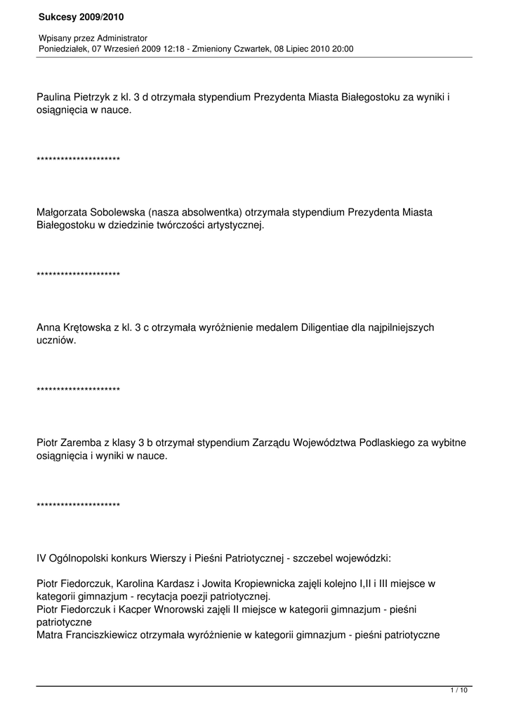 Sukcesy 2009/2010 Wpisany przez Administrator Poniedziałek, 07 Wrzesień 2009 12:18 - Zmieniony Czwartek, 08 Lipiec 2010 20:00 Paulina Pietrzyk z kl. 3 d otrzymała stypendium Prezydenta Miasta Białegostoku za wyniki i osiągnięcia w nauce. ********************* Małgorzata Sobolewska (nasza absolwentka) otrzymała stypendium Prezydenta Miasta Białegostoku w dziedzinie twórczości artystycznej. ********************* Anna Krętowska z kl. 3 c otrzymała wyróżnienie medalem Diligentiae dla najpilniejszych uczniów. ********************* Piotr Zaremba z klasy 3 b otrzymał stypendium Zarządu Województwa Podlaskiego za wybitne osiągnięcia i wyniki w nauce. ********************* IV Ogólnopolski konkurs Wierszy i Pieśni Patriotycznej - szczebel wojewódzki: Piotr Fiedorczuk, Karolina Kardasz i Jowita Kropiewnicka zajęli kolejno I,II i III miejsce w kategorii gimnazjum - recytacja poezji patriotycznej. Piotr Fiedorczuk i Kacper Wnorowski zajęli II miejsce w kategorii gimnazjum - pieśni patriotyczne Matra Franciszkiewicz otrzymała wyróżnienie w kategorii gimnazjum - pieśni patriotyczne 1 / 10 Sukcesy 2009/2010 Wpisany przez Administrator Poniedziałek, 07 Wrzesień 2009 12:18 - Zmieniony Czwartek, 08 Lipiec 2010 20:00 ********************* IV miejsce w Gimnazjadzie w Tenisie stołowym: Bielkiewicz Katarzyna III b, Dawidziuk Angelilka II b, Oniśko Marta I e. ********************* Stypendium w ramach projektu "Wsparcie stypendialne dla uzdolnionych uczniów 2009 r." otrzymali: Magdalena Szarkowska z klasy II b i Olga Mazuruk z klasy II f. ********************* III Ogólnopolskie Podziemne Zawody Strzeleckie z Broni Pneumatycznej w Bochni Karabin pneumatyczny 30 3. Bielecka Izabella Międzywojewódzkie Mistrzostwa Młodzików Białystok 2-4.10.2009 Pistolet szybkostrzelny chł. 1. Malinowski Patryk 2. Kowalewski Mateusz 3. Sienkiewicz Grzegorz Pistolet Pneumatyczny chł. 1. Malinowski Patryk 2. Kowalewski Mateusz Karabin pneumatyczny chł 1. Kuryłowicz Kamil Karabin Pneumatyczny dz. 3. Bielecka Izabella Pistolet sportowy część dokładna chł. 1. Malinowski Patryk 2. Kowalewski Mateusz Pistolet sportowy część dokładna dz. 3. Bielkiewicz Katarzyna Pistolet sportowy część szybka chłopców 2 / 10 Sukcesy 2009/2010 Wpisany przez Administrator Poniedziałek, 07 Wrzesień 2009 12:18 - Zmieniony Czwartek, 08 Lipiec 2010 20:00 1. Malinowski Patryk 3. Kowalewski Mateusz Pistolet sportowy część szybka dziewczyn 2. Bielewicz Katarzyna VI Ogólnopolskie Zawody Strzeleckie w strzelaniu z broni pneumatycznej o Puchar Ziemi Międzyrzeckiej Międzyrzec Podlaski 12-15.11.2009 r. Karabin pneumatyczny 3. Kuryłowicz Kamil Eliminacje strefowe Podlaskiej Gimnazjady Strzeleckiej Drużynowo: 1. PG7 dziewczęta 1. PG7 chłopcy Indywidualnie: Chłopcy 2. Kuryłowicz Kamil 3. Prokop Łukasz Dziewczyny 3. Dziekońska Monika Podlaska Gimnazjada Strzelecka Drużynowo: 1. PG7 dziewczęta 1. PG7 chłopcy Indywidualnie: Chłopcy 2. Pacuk Piotr 3. Kuryłowicz Kamil Dziewczyny 2. Bielecka Izabella ********************* Elżbieta Zajko kl. 1b, 2 miejsce w konkursie recytatorskim "Trójgłos poetycki" ********************* 3 / 10 Sukcesy 2009/2010 Wpisany przez Administrator Poniedziałek, 07 Wrzesień 2009 12:18 - Zmieniony Czwartek, 08 Lipiec 2010 20:00 Piotr Fiedorczuk, 1 miejsce w konkursie recytatorskim poezji patriotycznej ********************* Piotr Fiedorczuk, 2 miejsce w konkursie pieśni patriotycznej ********************* Piotr Zaremba, kl. 3b, 3 miejsce w konkursie interdyscyplinarnym WODA ********************* Maciej Stankiewicz, 4 miejsce w konkursie interdyscyplinarnym WODA ********************* Katarzyna Gulko, kl. 1d, 2 miejsce - konkurs gramatyki j. ang. zakres ogólnopolski - Junior Master of Grammar ********************* Martyna Iwaniuk, kl. 3c, 3 miejsce - konkurs gramatyki j. ang. zakres ogólnopolski - Junior Master of Grammar 4 / 10 Sukcesy 2009/2010 Wpisany przez Administrator Poniedziałek, 07 Wrzesień 2009 12:18 - Zmieniony Czwartek, 08 Lipiec 2010 20:00 ********************* Multitest 2009 / ogólnopolski konkurs z j. angielskiego laureatka - 2 miejsce - Katarzyna Gulko kl. 1d laureatka - 5 miejsce - Diana Okruszko z kl. 3d wyróżnienie - Piotr Fiedorczuk z kl. 3d wyróżnienie - Marta Iwaniuk z kl. 3c wyróżnienie - Anna Krętowska z kl. 3c wyróżnienie - Michał Sobolewski z kl. 3c ********************* Wyniki Ogólnopolskiego Konkursu Wiedzy o II wojnie światowej: Tomasz Nastały z klasy 2 c- IV miejsce- tytuł laureata Magdalena Kozłowska z klasy 3 e- VI miejsce- tytuł laureata Maciej Stankiewicz z klasy 3 b- VI miejsce- tytuł laureata Piotr Zaremba z klasy 3 b- VII miejsce- tytuł laureata Magdalena Konopka z klasy 3 e- X miejsce- tytuł laureata Krystian Bartnik z klasy 3 c- XIV miejsce- wyróżnienie 5 / 10 Sukcesy 2009/2010 Wpisany przez Administrator Poniedziałek, 07 Wrzesień 2009 12:18 - Zmieniony Czwartek, 08 Lipiec 2010 20:00 ********************* Finaliści Wojewódzkich Konkursów Przedmiotowych w roku szkolnym 2009/2010: 1. Justyna Golonko- język polski 2. Paulina Pietrzyk- język polski 3. Maria Hrubczyńska- język polski 4. Milena Maria Klepacka- język polski 5. Dariusz Komosiński- język polski 6. Piotr Krajewski- język polski 7. Mateusz Damian Król- język polski 8. Paulina Pietrzyk- matematyka 9. Justyna Golonko- matematyka 10. Tomasz Nastały- matematyka 11. Dariusz Komosiński- matematyka 12. Magdalena Szarkowska- matematyka 13. Piotr Zaremba- matematyka 14. Anna Krętowska- matematyka 15. Mateusz Damian Król- matematyka 16. Karolina Monika Pawelczyk- matematyka 17. Tomasz Nastały- historia 18. Piotr Zaremba- historia 19. Magdalena Kozłowska- historia 20. Piotr Krajewski- historia 21. Maciej Stankiewicz- historia 22. Konrad Marceli Tyszka- historia 23. Paulina Pietrzyk –fizyka 24. Justyna Golonko- chemia 25. Magdalena Konopka- geografia 26. Piotr Zaremba- geografia 27. Magdalena Kozłowska- geografia 28. Piotr Krajewski- geografi