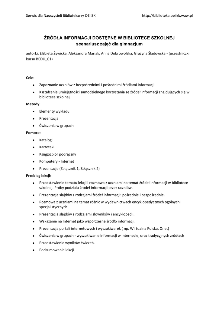Serwis dla Nauczycieli Bibliotekarzy OEIiZK http://biblioteka.oeiizk.waw.pl ŹRÓDŁA INFORMACJI DOSTĘPNE W BIBLIOTECE SZKOLNEJ scenariusz zajęć dla gimnazjum autorki: Elżbieta Żywicka, Aleksandra Mariak, Anna Dobrowolska, Grażyna Śladowska - (uczestniczki kursu BEDU_01) Cele: Zapoznanie uczniów z bezpośrednimi i pośrednimi źródłami informacji. Kształcenie umiejętności samodzielnego korzystania ze źródeł informacji znajdujących się w bibliotece szkolnej. Metody: Elementy wykładu Prezentacja Ćwiczenia w grupach Pomoce: Katalogi Kartoteki Księgozbiór podręczny Komputery - Internet Prezentacje (Załącznik 1, Załącznik 2) Przebieg lekcji: Przedstawienie tematu lekcji i rozmowa z uczniami na temat źródeł informacji w bibliotece szkolnej. Próby podziału źródeł informacji przez uczniów. Prezentacja slajdów z rodzajami źródeł informacji: pośrednie i bezpośrednie. Rozmowa z uczniami na temat różnic w wydawnictwach encyklopedycznych ogólnych i specjalistycznych Prezentacja slajdów z rodzajami słowników i encyklopedii. Wskazanie na Internet jako współczesne źródło informacji. Prezentacja portali internetowych i wyszukiwarek ( np. Wirtualna Polska, Onet) Ćwiczenia w grupach - wyszukiwanie informacji w Internecie, oraz tradycyjnych źródłach Przedstawienie wyników ćwiczeń. Podsumowanie lekcji. Serwis dla Nauczycieli Bibliotekarzy OEIiZK http://biblioteka.oeiizk.waw.pl ZAŁĄCZNIK 1 Serwis dla Nauczycieli Bibliotekarzy OEIiZK http://biblioteka.oeiizk.waw.pl Serwis dla Nauczycieli Bibliotekarzy OEIiZK http://biblioteka.oeiizk.waw.pl
