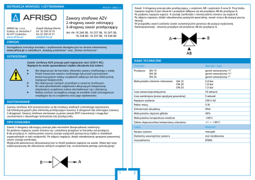 INSTRUKCJA MONTAŻU I UŻYTKOWANIA 953.011.000 2 1 Zawory strefowe AZV AFRISO Sp. z o.o. Szałsza, ul. Kościelna 7 42-677 Czekanów www.afriso.pl Zespół Obsługi Klienta tel. 32 330 33 55 fax 32 330 33 51 [email protected] 2-drogowy zawór odcinający 3-drogowy zawór przełączający Zawór 3-drogowy pracuje jako przełączający, z wejściem AB i wyjściami A oraz B. Przy braku napięcia wyjście A jest otwarte i przepływ odbywa się od przyłącza AB do przyłącza A. Po podaniu napięcia wyjście A zostaje zamknięte i równocześnie otwiera się wyjście B. Po zdjęciu napięcia, dzięki wbudowanej sprężynie powrotnej, zawór wraca do pozycji początkowej. W przypadku awarii zasilania zawór automatycznie powraca do pozycji wyjściowej (beznapięciowej) - otwarty przepływ od przyłacza AB do przyłącza A. Art.-Nr 16 246 00, 16 237 00, 16 247 00, 16 238 00, 16 337 00, 16 338 00 UWAGA! B A A B Szczegółowa instrukcja montażu i użytkowania dostępna jest na stronie internetowej www.afriso.pl w zakładkach „Katalog produktów” oraz „Pomoc techniczna”. AB OSTRZEŻENIE! DANE TECHNICZNE Zawór strefowy AZV pracuje pod napięciem sieci (230 V AC). Napięcie to może spowodować ciężkie obrażenia lub śmierć. ff ff ff ff ff Parametr Przyłącza: Nie dopuszczać do kontaktu siłownika zaworu strefowego z wodą. Przed otwarciem zaworu strefowego lub przed czynnościami konserwacyjnymi należy urządzenie odłączyć od sieci elektrycznej (wyłączyć bezpiecznik). Nie dokonywać żadnych przeróbek w zaworze strefowym. W razie jakichkolwiek wątpliwości dotyczących bezpiecznej eksploatacji urządzenia należy skontaktować się z dostawcą. Należy zwrócić szczególną uwagę na wszelkie znaki ostrzegawcze znajdujące się na urządzeniu oraz jego opakowaniu. Wartość / opis DN 15 DN 20 DN 25 Maksymalne ciśnienie różnicowe: ZASTOSOWANIE Zawory strefowe AZV przeznaczone są do instalacji wodnych centralnego ogrzewania lub klimatyzacyjnych jako elementy przełączające (zawory 3-drogowe) lub odcinające (zawory 2-drogowe). Zawory strefowe sterowane są przez zestyk SPST (rozwierny) i mogą być uruchamiane z dowolnego termostatu lub przełącznika. gwint wewnętrzny ½” gwint wewnętrzny ¾” gwint wewnętrzny 1” DN 15 DN 20 DN 25 2,0 bar 1,8 bar 1,5 bar Czas otwarcia/przełączenia 10 sekund Czas zamknięcia (przez sprężynę powrotną) 5 sekund Napięcie zasilania 230 V AC Pobór mocy 5W Ochronność obudowy IP44 Maksymalne stężenie glikolu 40% Maksymalna temperatura medium +95°C OPIS DZIAŁANIA Zakres dopuszczalnej temperatury otoczenia +1 ÷ +95°C Zawór 2-drogowy odcinający pracuje jako normalnie (bezprądowo) zamknięty. Po podaniu napięcia zawór otwiera się i umożliwia przepływ w kierunku od przyłącza B do przyłącza A. Jednocześnie zwarty zostaje wyłącznik pomocniczy (tylko w modelach wyposażonych w taki wyłącznik). Po zdjęciu napięcia, dzięki wbudowanej sprężynie powrotnej, zawór zostaje zamknięty. Wyłącznik pomocniczy aktywowany jest w chwili podania napięcia na zawór. Może być więc wykorzystywany do sterowania różnych urządzeń (np. uruchamianie pompy cyrkulacyjnej). Część Materiał Korpus zaworu mosiądz Elementy wewnętrzne zaworu stal nierdzewna Uszczelnienia EPDM B A 1 2 MONTAŻ ZAWORU OBSŁUGA Upewnić się, czy kierunek przepływu w instalacji jest zgodny z oznaczeniem na korpusie zaworu. Kierunek przepływu oraz oznaczenia przyłączy oznaczono na korpusie zaworu. Przed zainstalowaniem zaworu należy starannie wypłukać instalację, zwracając szczególną uwagę na usunięcie pozostałości po lutowaniu, cięciu rur, itp. Zawory strefowe AZV zbudowane są z dwóch głównych elementów - zaworu oraz siłownika elektrycznego. Zawory strefowe umożliwiają zamontowanie w instalacji samego zaworu, bez siłownika elektrycznego. Po zainstalowaniu zaworu, siłownik można zamontować w dowolnym momencie. W czasie eksploatacji, siłownik można wymienić bez potrzeby spuszczania wody lub zatrzymywania pracy instalacji. Aby zdemontować siłownik należy nacisnąć czarny przycisk znajdujący się z boku obudowy siłownika i oddzielić siłownik od zaworu. Należy jednak pamiętać, że w czasie, gdy siłownik jest odłączony, trzpień zaworu może przemieszczać się swobodnie, dlatego zaleca się założenie nowego siłownika elektrycznego tak szybko, jak to jest możliwe. Zawór należy zamontować tak, by zespół siłownika elektrycznego nie był usytuowany poniżej części zaworowej. Na przyłączach zalecany jest montaż zaworów odcinających w celu ułatwienia późniejszej konserwacji lub ewentualnej wymiany. W wypadku awarii zasilania, a także w czasie napełniania lub opróżniania instalacji zawory powinny pracować jako zawory otwarte. W tym celu należy przestawić znajdującą się z boku urządzenia dźwignię w pozycję opisaną na zespole siłownika „OPEN” i zablokować wykorzystując blokadę w obudowie zespołu siłownika. Przed zaworem zalecany jest montaż filtra. Do podłączeń elektrycznych wykorzystać fabryczne elektryczne przewody przyłączeniowe o długości 10 cm wystające z obudowy siłownika. Nie otwierać obudowy siłownika. Działanie zaworów ustawionych w pozycji „OPEN” jest następujące: Wersja bez wyłącznika pomocniczego Podłączyć przewód fazowy (L) do jednego z czerwonych przewodów znajdujących się przy siłowniku, natomiast przewód neutralny (N) do drugiego z czerwonych przewodów znajdujących się przy siłowniku. Polaryzacja jest obojętna. N L • Zawór 2-drogowy odcinający jest otwarty. • Zawór 3-drogowy przełączający rozdziela strumień z wejścia AB do obydwu wyjść: A oraz B (oba wyjścia są otwarte). 230 V AC WYŁĄCZENIE Z EKSPLOATACJI, ZŁOMOWANIE 1. Odłączyć zasilanie urządzenia. 2. Zdemontować urządzenie. 3. W trosce o ochronę środowiska naturalnego nie wolno wyrzucać wyłączonego z eksploatacji urządzenia raze
