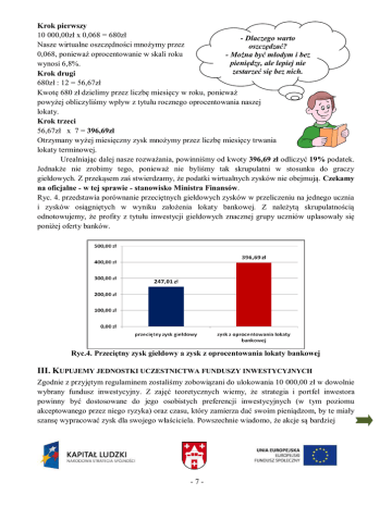Krok pierwszy 10 000,00zł x 0,068 = 680zł - Dlaczego warto Nasze wirtualne oszczędności mnożymy przez oszczędzać? 0,068, ponieważ oprocentowanie w skali roku - Można być młodym i bez pieniędzy, ale lepiej nie wynosi 6,8%. zestarzeć się bez nich. Krok drugi 680zł : 12 = 56,67zł Kwotę 680 zł dzielimy przez liczbę miesięcy w roku, ponieważ powyżej obliczyliśmy wpływ z tytułu rocznego oprocentowania naszej lokaty. Krok trzeci 56,67zł x 7 = 396,69zł Otrzymany wyżej miesięczny zysk mnożymy przez liczbę miesięcy trwania lokaty terminowej. Urealniając dalej nasze rozważania, powinniśmy od kwoty 396,69 zł odliczyć 19% podatek. Jednakże nie zrobimy tego, ponieważ nie byliśmy tak skrupulatni w stosunku do graczy giełdowych. Z przekąsem zaś stwierdzamy, że podatki wirtualnych zysków nie obejmują. Czekamy na oficjalne - w tej sprawie - stanowisko Ministra Finansów. Ryc. 4. przedstawia porównanie przeciętnych giełdowych zysków w przeliczeniu na jednego ucznia i zysków osiągniętych w wyniku założenia lokaty bankowej. Z należytą skrupulatnością odnotowujemy, że profity z tytułu inwestycji giełdowych znacznej grupy uczniów uplasowały się poniżej oferty banków. Ryc.4. Przeciętny zysk giełdowy a zysk z oprocentowania lokaty bankowej III. KUPUJEMY JEDNOSTKI UCZESTNICTWA FUNDUSZY INWESTYCYJNYCH Zgodnie z przyjętym regulaminem zostaliśmy zobowiązani do ulokowania 10 000,00 zł w dowolnie wybrany fundusz inwestycyjny. Z zajęć teoretycznych wiemy, że strategia i portfel inwestora powinny być dostosowane do jego osobistych preferencji inwestycyjnych (w tym poziomu akceptowanego przez niego ryzyka) oraz czasu, który zamierza dać swoim pieniądzom, by te miały szansę wypracować zysk dla swojego właściciela. Powszechnie wiadomo, że akcje są bardziej -7-