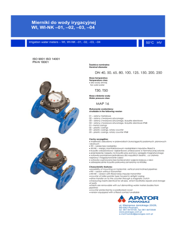 Mierniki do wody irygacyjnej WI, WI-NK –01, –02, –03, –04 Irrigation water meters – WI, WI-NK –01, -02, –03, –04 50C HV ISO 9001 ISO 14001 PN-N 18001 Średnica nominalna Nominal diameter DN 40, 50, 65, 80, 100, 125, 150, 200, 250 Klasa temparatury Temperature class dla wody zimnej for cold water T30, T50 Klasa ciśnienia wody Water pressure class MAP 16 Wykonanie wodomierzy Available in the following version 01 – osłony metalowe 02 – osłony z tworzywa sztucznego 03 – osłony z tworzywa sztucznego, liczydło obrotowe 04 – osłony z tworzywa sztucznego, liczydło obrotowe IP68 01– metal casings 02 – plastic casings 03 – plastic casings, rotary counter 03 – plastic casings, rotary counter IP68 Cechy szczególne: możliwość zabudowy w przewodach (rurociągach) poziomych, pionowych i skośnych WI – wersja bez nadajnika WI-NK – wersja z kontraktonowym nadajnikiem impulsów Reed’a liczydło wskazówkowo- bębenkowe umieszczone w hermetycznej osłonie przeniesienie napędu na liczydło przy pomocy sprzęgła magnetycznego wstawka pomiarowa jednakowa dla wszystkich średnic , co ułatwia naprawy i magazynowanie części wstawka wyjmowana bez konieczności wyjęcia korpusu z sieci zabezpieczenie liczydła pokrywką zamykaną na kłódkę Characteristic features: possibility of mounting on horizontal, vertical and inclined pipelines WI – version without transmitter WI-NK – version with Reed relay impulse transmitter counter of roller-pointer type housed in airtight casing drive transfer on to the counter through a magnetic clutch measuring inserts identical for all sizes, which facilitates repairs and storage of parts inserts are removable with out dismantling water meters bodies from pipelines counter protected by a padlocked cover version equipped with a Reed contact available ul. Klemensa Janickiego 23/25, 60-542 Poznań, tel. 061 8418100, fax 061 8472548 www.powogaz.com.pl e-mail:[email protected] Średnica nominalna Nominal diameter DN mm 40 50 65 80 100 125 150 200 250 Parametry wg PN-EN-14268:2005 / Parameters according to PN-EN-14268:2005 Maksymalny strumień objętości Overload flow rate Nominalny strumień objętości Nominal flow rate Minimalny strumień objętości Minimum flow rate Q4 m /h 3 25 31,25 50 78,75 125 200 312,5 500 787,5 Q3 m /h 3 20 25 40 63 100 160 250 400 630 3 1 1,25 2 3,15 5 8 12,5 20 31,5 Q1 m /h Parametry producenta / Producer’s parameters Maksymalny strumień objętości Maximum flow rate Nominalny strumień objętości Nominal flow rate Minimalny strumień objętości Minimum flow rate Zakres liczydła Indicating range Działka elementarna Resolution of the reading Działka elementarna Resolution of the reading Działka elementarna Resolution of the reading Masa Weight Q4 m /h 3 50 70 100 150 250 350 500 900 1400 Q3 m /h 3 25 30 50 90 125 175 250 450 700 Q1 m /h 3 1 1,2 2 3 4,8 8 10 18 30 - m 3 9 999 999 - m 3 0,005 - US Gallons - Imperial Gallons L mm h mm 65 72 H mm 225 245 230 250 - kg 7,8 9 10 200 200 0,05 (0,189 l) 0,5 (1,89 l) 0,05 (0,227 l) 0,5 (2,27 l) 200 225 250 250 300 350 450 83 94 105 118 135 160 190 240 260 250 270 260 280 305 325 335 355 335 355 385 405 12 16 20 25 38 43 Strata ciśnienia Head loss Dokładność Accuracy Q4 Q1 ±5% Nadajnik kontaktronowy (nadajnik Reed’a) Reed relay (Reed contact) - moc łączona max 10W contact rating - wytrzymałość napięciowa max 200V voltage - prąd łączony Owiercenie kołnierzy wg PN-ISO-7005 PN 1,6Mpa lub wg innych norm. Flange drilling according to ISO-7005 DIN 2501 NP16 or other standards. Przykład zamówienia: - MIERNIK IRYGACYJNY WI 80-01 - MIERNIK IRYGACYJNY Z NADAJNIKIEM - MIERNIK IRYGACYJNY WI-NK 80-01 - wartość impulsu 1 m3/imp max 0,5A switching current - długość przewodu 2m cable length 10 lub/or 1 lub/or 0,1 m3 – typ 01; 03; 04 - wartość impulsu pulse value 10 lub/or 1 m3 – typ 02 - zalecana wartość impuslu 1 m3 reccomended pulse value - minimalna wartość impulsu 100l lub 25l – typ 01; 03; 04 minimal pulse value 1000l or 250l – typ 02 Example of an order: - IRRIGATION WATER METER WI 80-01 - irrigation water meter with a Reed contact - IRRIGATION WATER METER WI-NK 80-01 - pulse value 1 m3/imp ul. Klemensa Janickiego 23/25, 60-542 Poznań, tel. 061 8418100, fax 061 8472548 www.powogaz.com.pl e-mail:[email protected]