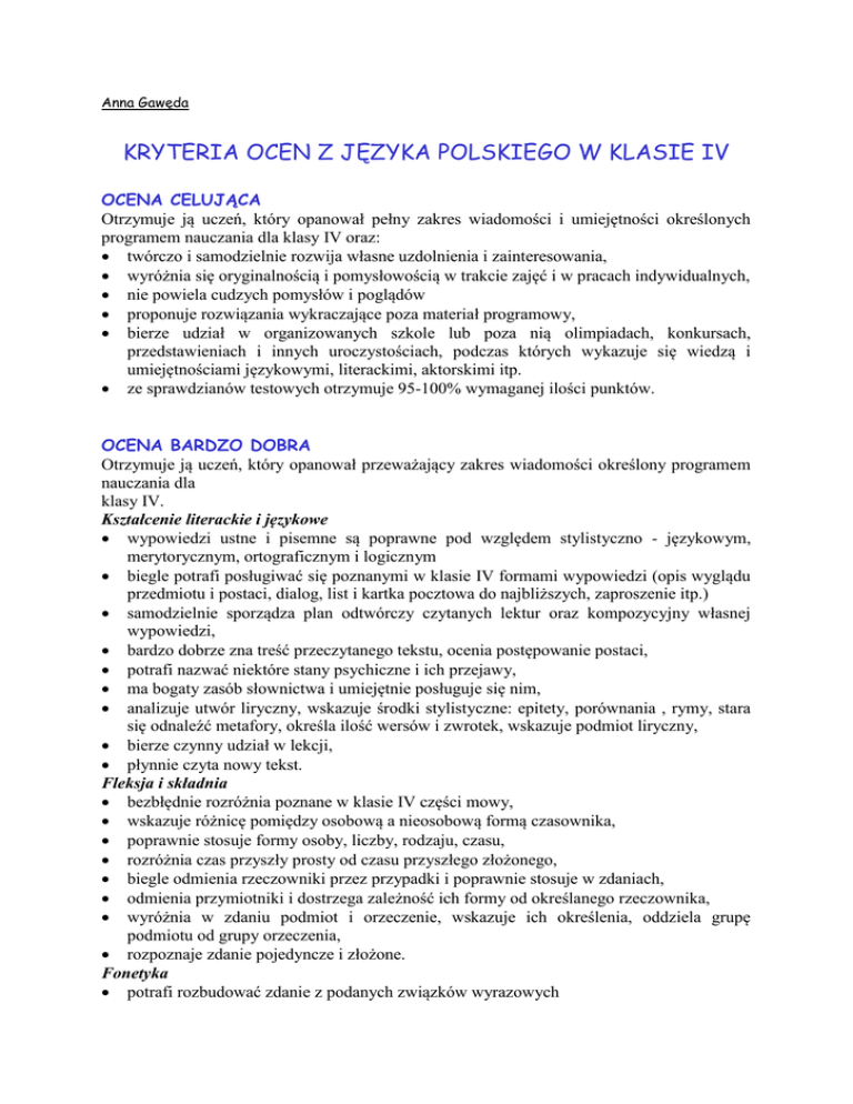 Anna Gawęda KRYTERIA OCEN Z JĘZYKA POLSKIEGO W KLASIE IV OCENA CELUJĄCA Otrzymuje ją uczeń, który opanował pełny zakres wiadomości i umiejętności określonych programem nauczania dla klasy IV oraz: twórczo i samodzielnie rozwija własne uzdolnienia i zainteresowania, wyróżnia się oryginalnością i pomysłowością w trakcie zajęć i w pracach indywidualnych, nie powiela cudzych pomysłów i poglądów proponuje rozwiązania wykraczające poza materiał programowy, bierze udział w organizowanych szkole lub poza nią olimpiadach, konkursach, przedstawieniach i innych uroczystościach, podczas których wykazuje się wiedzą i umiejętnościami językowymi, literackimi, aktorskimi itp. ze sprawdzianów testowych otrzymuje 95-100% wymaganej ilości punktów. OCENA BARDZO DOBRA Otrzymuje ją uczeń, który opanował przeważający zakres wiadomości określony programem nauczania dla klasy IV. Kształcenie literackie i językowe wypowiedzi ustne i pisemne są poprawne pod względem stylistyczno - językowym, merytorycznym, ortograficznym i logicznym biegle potrafi posługiwać się poznanymi w klasie IV formami wypowiedzi (opis wyglądu przedmiotu i postaci, dialog, list i kartka pocztowa do najbliższych, zaproszenie itp.) samodzielnie sporządza plan odtwórczy czytanych lektur oraz kompozycyjny własnej wypowiedzi, bardzo dobrze zna treść przeczytanego tekstu, ocenia postępowanie postaci, potrafi nazwać niektóre stany psychiczne i ich przejawy, ma bogaty zasób słownictwa i umiejętnie posługuje się nim, analizuje utwór liryczny, wskazuje środki stylistyczne: epitety, porównania , rymy, stara się odnaleźć metafory, określa ilość wersów i zwrotek, wskazuje podmiot liryczny, bierze czynny udział w lekcji, płynnie czyta nowy tekst. Fleksja i składnia bezbłędnie rozróżnia poznane w klasie IV części mowy, wskazuje różnicę pomiędzy osobową a nieosobową formą czasownika, poprawnie stosuje formy osoby, liczby, rodzaju, czasu, rozróżnia czas przyszły prosty od czasu przyszłego złożonego, biegle odmienia rzeczowniki przez przypadki i poprawnie stosuje w zdaniach, odmienia przymiotniki i dostrzega zależność ich formy od określanego rzeczownika, wyróżnia w zdaniu podmiot i orzeczenie, wskazuje ich określenia, oddziela grupę podmiotu od grupy orzeczenia, rozpoznaje zdanie pojedyncze i złożone. Fonetyka potrafi rozbudować zdanie z podanych związków wyrazowych odróżnia głoskę od litery, samogłoskę od spółgłoski, zna zasady akcentowania, poprawnie akcentuje. OCENĘ DOBRĄ otrzymuje uczeń, który opanował wiadomości i umiejętności przewidziane podstawą programową oraz wybrane elementy przewidziane programem nauczania w klasie IV. Kształcenie literackie i językowe czyta poprawnie, stosując zasady prawidłowego przestankowania, jego wypowiedzi ustne i pisemne mogą zawierać nieliczne błędy językowo- stylistyczne, logiczne i ortograficzne, potrafi samodzielnie poprawić większość własnych błędów, w wypowiedziach próbuje oceniać zachowania bohaterów literackich ora formułuje ogólne wnioski o utworach, poprawnie sporządza plan ramowy, potrafi posługiwać się słownikiem ortograficznym, umie wskazać w wierszu epitet, porównanie, rymy, wersy, strofy. Fleksja i składnia określa formę gramatyczną czasowników i rzeczowników, stosuje w zdaniu czasowniki w formie osobowej i nieosobowej, poprawnie odmienia czasowniki, odmienia rzeczowniki przez przypadki i liczby, poprawnie odmienia przymiotniki, umie wskazać w zdaniu podmiot i orzeczenie, układa zdanie pojedyncze i złożone. Fonetyka rozróżnia głoskę, literę, samogłoskę, spółgłoskę, poprawnie dzieli wyrazy na sylaby. OCENĘ DOSTATECZNĄ otrzymuje uczeń, który opanował wiedzę i umiejętności zawarte w podstawie programowej. Kształcenie literackie i językowe w wypowiedziach ustnych i pisemnych na ogół przestrzega zasad poprawności w zakresie budowy zdań, poprawnego stosowania słownictwa i ortografii, przy niewielkiej pomocy nauczyciela wypowiada się w szkolnych formach pisemnych, rozumie czytany tekst, zna treść lektur obowiązkowych, umie wyróżnić podstawowe elementy świata przedstawionego, odróżnia podmiot liryczny od bohatera utworu, wskazuje epitety, porównania, rymy, wersy, strofy, odróżnia postacie i wydarzenia realistyczne od fantastycznych. Fleksja i składnia tworzy bezokoliczniki od osobowych form czasowników i odwrotnie, odróżnia przyimek od innych części mowy, wskazuje w zdaniu podmiot i orzeczenie, odmienia rzeczowniki przez przypadki, odmienia czasowniki przez osoby, liczby, czasy i rodzaje, podane zdania dzieli na pojedyncze i złożone. Fonetyka rozróżnia głoski i litery, dzieli wyrazy na sylaby. OCENĘ DOPUSZCZAJĄCĄ otrzymuje uczeń, którego wiedza i umiejętności pozwalają na samodzielne wykonanie zadań o niewielkim stopniu trudności, jego technika czytania pozwala na zrozumienie tekstu, względna poprawność językowa i rzeczowa wypowiedzi ustnych świadczy o zrozumieniu przez niego analizowanego zagadnienia, w wypowiedziach pisemnych popełniane błędy językowe, stylistyczne, logiczne i ortograficzne nie przekraczają wartości prac i wysiłku, jaki włożył w ich napisanie, stopień opanowania przez niego wiadomości pozwala na samodzielne wykonanie zadań typowych, o niewielkim zakresie trudności, przy pomocy nauczyciela rozpoznaje części mowy, odróżnia zdania pojedyncze od złożonych, odmienia rzeczowniki przez przypadki, odmienia czasowniki przez osoby, liczby, czasy i rodzaje, wskazuje w zdaniu podmiot i orzeczenie, zna podstawowe zasady ortograficzne. OCENĘ NIEDOSTATECZNĄ otrzymuje uczeń, który: nie opanował podstawowych wiadomości w zakresie fleksji i składni, słownictwa, frazeologii i redagowania wypowiedzi oraz elementarnych wiadomości z zakresu budowy i analizy utworu literackiego, przewidzianych podstawą programową, nie opanował techniki głośnego i c