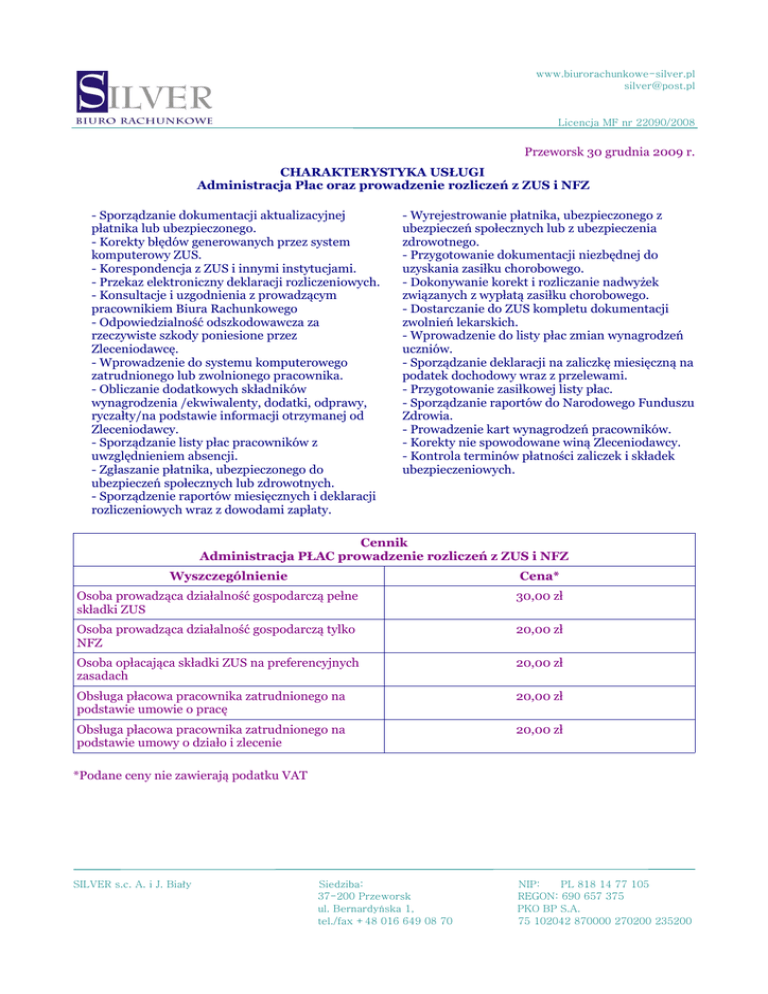 www.biurorachunkowe-silver.pl [email protected] Licencja MF nr 22090/2008 Przeworsk 30 grudnia 2009 r. CHARAKTERYSTYKA USŁUGI Administracja Płac oraz prowadzenie rozliczeń z ZUS i NFZ - Sporządzanie dokumentacji aktualizacyjnej płatnika lub ubezpieczonego. - Korekty błędów generowanych przez system komputerowy ZUS. - Korespondencja z ZUS i innymi instytucjami. - Przekaz elektroniczny deklaracji rozliczeniowych. - Konsultacje i uzgodnienia z prowadzącym pracownikiem Biura Rachunkowego - Odpowiedzialność odszkodowawcza za rzeczywiste szkody poniesione przez Zleceniodawcę. - Wprowadzenie do systemu komputerowego zatrudnionego lub zwolnionego pracownika. - Obliczanie dodatkowych składników wynagrodzenia /ekwiwalenty, dodatki, odprawy, ryczałty/na podstawie informacji otrzymanej od Zleceniodawcy. - Sporządzanie listy płac pracowników z uwzględnieniem absencji. - Zgłaszanie płatnika, ubezpieczonego do ubezpieczeń społecznych lub zdrowotnych. - Sporządzenie raportów miesięcznych i deklaracji rozliczeniowych wraz z dowodami zapłaty. - Wyrejestrowanie płatnika, ubezpieczonego z ubezpieczeń społecznych lub z ubezpieczenia zdrowotnego. - Przygotowanie dokumentacji niezbędnej do uzyskania zasiłku chorobowego. - Dokonywanie korekt i rozliczanie nadwyżek związanych z wypłatą zasiłku chorobowego. - Dostarczanie do ZUS kompletu dokumentacji zwolnień lekarskich. - Wprowadzenie do listy płac zmian wynagrodzeń uczniów. - Sporządzanie deklaracji na zaliczkę miesięczną na podatek dochodowy wraz z przelewami. - Przygotowanie zasiłkowej listy płac. - Sporządzanie raportów do Narodowego Funduszu Zdrowia. - Prowadzenie kart wynagrodzeń pracowników. - Korekty nie spowodowane winą Zleceniodawcy. - Kontrola terminów płatności zaliczek i składek ubezpieczeniowych. Cennik Administracja PŁAC prowadzenie rozliczeń z ZUS i NFZ Wyszczególnienie Cena* Osoba prowadząca działalność gospodarczą pełne składki ZUS 30,00 zł Osoba prowadząca działalność gospodarczą tylko NFZ 20,00 zł Osoba opłacająca składki ZUS na preferencyjnych zasadach 20,00 zł Obsługa płacowa pracownika zatrudnionego na podstawie umowie o pracę 20,00 zł Obsługa płacowa pracownika zatrudnionego na podstawie umowy o działo i zlecenie 20,00 zł *Podane ceny nie zawierają podatku VAT SILVER s.c. A. i J. Biały Siedziba: 37-200 Przeworsk ul. Bernardyńska 1, tel./fax +48 016 649 08 70 NIP: PL 818 14 77 105 REGON: 690 657 375 PKO BP S.A. 75 102042 870000 270200 235200