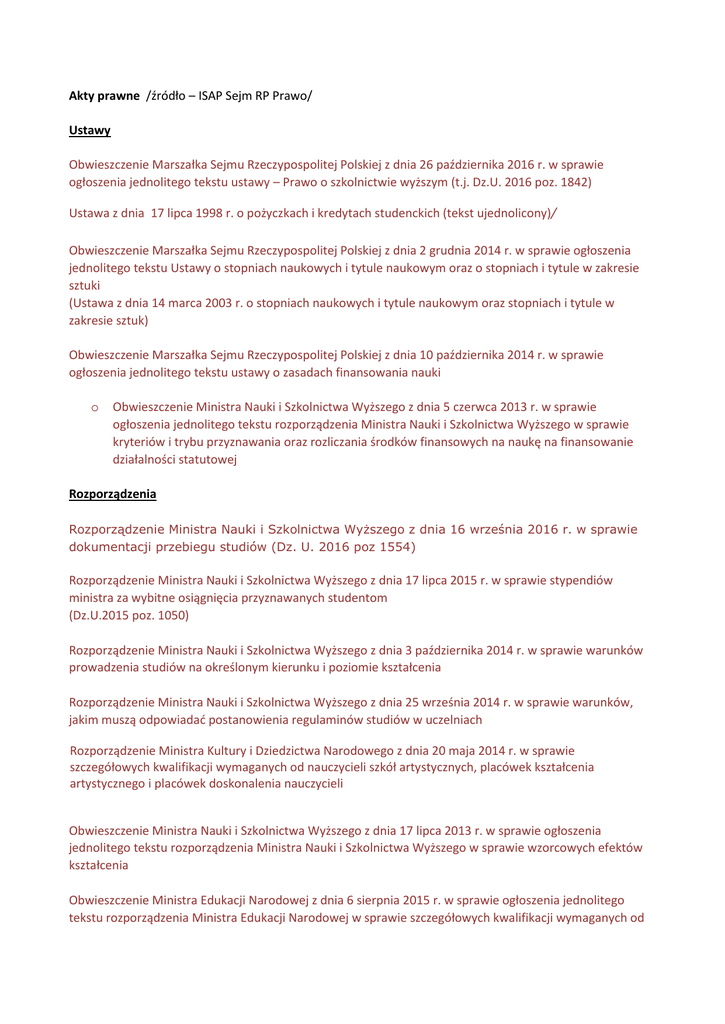 Akty prawne /źródło – ISAP Sejm RP Prawo/ Ustawy Obwieszczenie Marszałka Sejmu Rzeczypospolitej Polskiej z dnia 26 października 2016 r. w sprawie ogłoszenia jednolitego tekstu ustawy – Prawo o szkolnictwie wyższym (t.j. Dz.U. 2016 poz. 1842) Ustawa z dnia 17 lipca 1998 r. o pożyczkach i kredytach studenckich (tekst ujednolicony)/ Obwieszczenie Marszałka Sejmu Rzeczypospolitej Polskiej z dnia 2 grudnia 2014 r. w sprawie ogłoszenia jednolitego tekstu Ustawy o stopniach naukowych i tytule naukowym oraz o stopniach i tytule w zakresie sztuki (Ustawa z dnia 14 marca 2003 r. o stopniach naukowych i tytule naukowym oraz stopniach i tytule w zakresie sztuk) Obwieszczenie Marszałka Sejmu Rzeczypospolitej Polskiej z dnia 10 października 2014 r. w sprawie ogłoszenia jednolitego tekstu ustawy o zasadach finansowania nauki o Obwieszczenie Ministra Nauki i Szkolnictwa Wyższego z dnia 5 czerwca 2013 r. w sprawie ogłoszenia jednolitego tekstu rozporządzenia Ministra Nauki i Szkolnictwa Wyższego w sprawie kryteriów i trybu przyznawania oraz rozliczania środków finansowych na naukę na finansowanie działalności statutowej Rozporządzenia Rozporządzenie Ministra Nauki i Szkolnictwa Wyższego z dnia 16 września 2016 r. w sprawie dokumentacji przebiegu studiów (Dz. U. 2016 poz 1554) Rozporządzenie Ministra Nauki i Szkolnictwa Wyższego z dnia 17 lipca 2015 r. w sprawie stypendiów ministra za wybitne osiągnięcia przyznawanych studentom (Dz.U.2015 poz. 1050) Rozporządzenie Ministra Nauki i Szkolnictwa Wyższego z dnia 3 października 2014 r. w sprawie warunków prowadzenia studiów na określonym kierunku i poziomie kształcenia Rozporządzenie Ministra Nauki i Szkolnictwa Wyższego z dnia 25 września 2014 r. w sprawie warunków, jakim muszą odpowiadać postanowienia regulaminów studiów w uczelniach Rozporządzenie Ministra Kultury i Dziedzictwa Narodowego z dnia 20 maja 2014 r. w sprawie szczegółowych kwalifikacji wymaganych od nauczycieli szkół artystycznych, placówek kształcenia artystycznego i placówek doskonalenia nauczycieli Obwieszczenie Ministra Nauki i Szkolnictwa Wyższego z dnia 17 lipca 2013 r. w sprawie ogłoszenia jednolitego tekstu rozporządzenia Ministra Nauki i Szkolnictwa Wyższego w sprawie wzorcowych efektów kształcenia Obwieszczenie Ministra Edukacji Narodowej z dnia 6 sierpnia 2015 r. w sprawie ogłoszenia jednolitego tekstu rozporządzenia Ministra Edukacji Narodowej w sprawie szczegółowych kwalifikacji wymaganych od nauczycieli oraz określenia szkół i wypadków, w których można zatrudnić nauczycieli niemających wyższego wykształcenia lub ukończonego zakładu kształcenia nauczycieli Rozporządzenie Ministra Nauki i Szkolnictwa Wyższego z dnia 2 listopada 2011 r. w sprawie Krajowych Ram Kwalifikacji dla Szkolnictwa Wyższego Rozporządzenie Ministra Nauki i Szkolnictwa Wyższego z dnia 1 września 2011 r. w sprawie tytułów zawodowych nadawanych absolwentom studiów, warunków wydawania oraz niezbędnych elementów dyplomów ukończenia studiów i świadectw ukończenia studiów podyplomowych oraz wzoru suplementu do dyplomu Rozporządzenie Ministra Nauki i Szkolnictwa Wyższego z dnia 18 maja 2010 r. w sprawie szczegółowych zasad, trybu i kryteriów udzielania, spłacania oraz umarzania kredytów i pożyczek studenckich Rozporządzenie Ministra Nauki i Szkolnictwa Wyższego z dnia 6 grudnia 2006 r. w sprawie szczegółowego trybu postępowania wyjaśniającego i dyscyplinarnego wobec studentów Rozporządzenie Ministra Nauki i Szkolnictwa Wyższego z dnia 1 marca 2013 r. w sprawie nagród ministra dla nauczycieli akademickich Cudzoziemcy Ustawa o cudzoziemcach z dnia 12 grudnia 2013r. (Dz. U 2013 poz. 1650) Rozporządzenie Ministra Nauki i Szkolnictwa Wyższego z dnia 1 września 2011 r. w sprawie nostryfikacji dyplomów ukończenia studiów wyższych uzyskanych za granicą (Dz. U. 2011 nr 196 poz. 1168) Rozporządzenie Ministra Nauki i Szkolnictwa Wyższego z dnia 12 października 2006 r. w sprawie podejmowania i odbywania przez cudzoziemców studiów i szkoleń oraz ich uczestniczenia w badaniach naukowych i pracach rozwojowych (Dz. U. nr 190 poz. 1406) o Rozporządzenie Ministra Nauki i Szkolnictwa Wyższego z dnia 29 lipca 2015 r. zmieniające rozporządzenie w sprawie podejmowania i odbywania przez cudzoziemców studiów i szkoleń oraz ich uczestniczenia w badaniach naukowych i pracach rozwojowych (Dz.U. 2015 poz. 1112) o Nowelizacja Rozporządzenia Ministra Nauki i Szkolnictwa Wyższego z dnia 9 września 2009 r. zmieniająca rozporządzenie w sprawie podejmowania i odbywania przez cudzoziemców studiów i szkoleń oraz ich uczestniczenia w badaniach naukowych i pracach rozwojowych (Dz. U. 2009 nr 176 poz. 1365) Rozporządzenia – studia doktoranckie, przewody doktorskie, postępowanie habilitacyjne oraz postępowanie o nadanie tytułu profesora Rozporządzenie Ministra Nauki i Szkolnictwa Wyższego z dnia 26 września 2016 r. w sprawie szczegółowego trybu i warunków przeprowadzania czynności w przewodzie doktorskim, w postępowaniu habilitacyjnym oraz w postępowaniu o nadanie tytułu profesora (Dz.U. 2016 poz. 1586) Rozporządzenie Ministra Nauki i Szkolnictwa Wyższego z dnia 30 października 2015 r. w sprawie szczegółowego trybu i warunków przeprowadzania czynności w przewodzie doktorskim, w postępowaniu habilitacyjnym oraz w postępowaniu o nadanie tytułu profesora (Dz.U. 2015 poz.1842) Rozporządzenie Ministra Nauki i Szkolnictwa Wyższego z dnia 17 lipca 2015 r. w sprawie stypendiów ministra za wybitne osiągnięcia przyznawanych doktorantom (Dz.U. 2015 poz. 1051) Obwieszczenie Ministra Nauki i Szkolnictwa Wyższego z dnia 19 stycznia 2015 r. w sprawie ogłoszenia jednolitego tekstu rozporządzenia Ministra Nauki i Szkolnictwa Wyższego w sprawie kształcenia na studiach doktoranckich w uczelniach i jednostkach naukowych (Dz.U 2015 poz 172- t.j.) Rozporządzenie Ministra Nauki i Szkolnictwa Wyższe