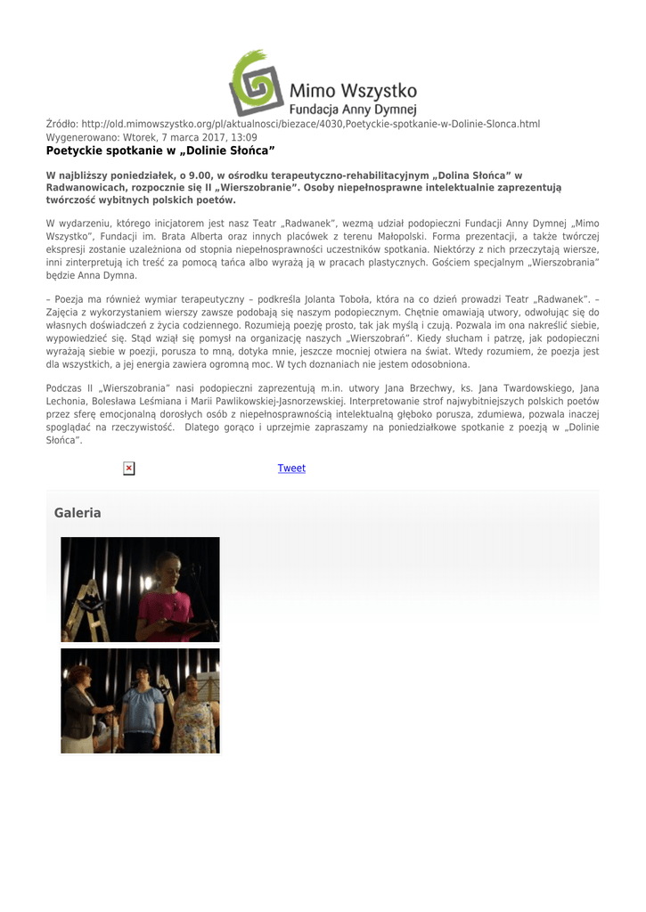 Źródło: http://old.mimowszystko.org/pl/aktualnosci/biezace/4030,Poetyckie-spotkanie-w-Dolinie-Slonca.html Wygenerowano: Wtorek, 7 marca 2017, 13:09 Poetyckie spotkanie w „Dolinie Słońca” W najbliższy poniedziałek, o 9.00, w ośrodku terapeutyczno-rehabilitacyjnym „Dolina Słońca” w Radwanowicach, rozpocznie się II „Wierszobranie”. Osoby niepełnosprawne intelektualnie zaprezentują twórczość wybitnych polskich poetów. W wydarzeniu, którego inicjatorem jest nasz Teatr „Radwanek”, wezmą udział podopieczni Fundacji Anny Dymnej „Mimo Wszystko”, Fundacji im. Brata Alberta oraz innych placówek z terenu Małopolski. Forma prezentacji, a także twórczej ekspresji zostanie uzależniona od stopnia niepełnosprawności uczestników spotkania. Niektórzy z nich przeczytają wiersze, inni zinterpretują ich treść za pomocą tańca albo wyrażą ją w pracach plastycznych. Gościem specjalnym „Wierszobrania” będzie Anna Dymna. – Poezja ma również wymiar terapeutyczny – podkreśla Jolanta Toboła, która na co dzień prowadzi Teatr „Radwanek”. – Zajęcia z wykorzystaniem wierszy zawsze podobają się naszym podopiecznym. Chętnie omawiają utwory, odwołując się do własnych doświadczeń z życia codziennego. Rozumieją poezję prosto, tak jak myślą i czują. Pozwala im ona nakreślić siebie, wypowiedzieć się. Stąd wziął się pomysł na organizację naszych „Wierszobrań”. Kiedy słucham i patrzę, jak podopieczni wyrażają siebie w poezji, porusza to mną, dotyka mnie, jeszcze mocniej otwiera na świat. Wtedy rozumiem, że poezja jest dla wszystkich, a jej energia zawiera ogromną moc. W tych doznaniach nie jestem odosobniona. Podczas II „Wierszobrania” nasi podopieczni zaprezentują m.in. utwory Jana Brzechwy, ks. Jana Twardowskiego, Jana Lechonia, Bolesława Leśmiana i Marii Pawlikowskiej-Jasnorzewskiej. Interpretowanie strof najwybitniejszych polskich poetów przez sferę emocjonalną dorosłych osób z niepełnosprawnością intelektualną głęboko porusza, zdumiewa, pozwala inaczej spoglądać na rzeczywistość. Dlatego gorąco i uprzejmie zapraszamy na poniedziałkowe spotkanie z poezją w „Dolinie Słońca”. Tweet Galeria Podziel się: