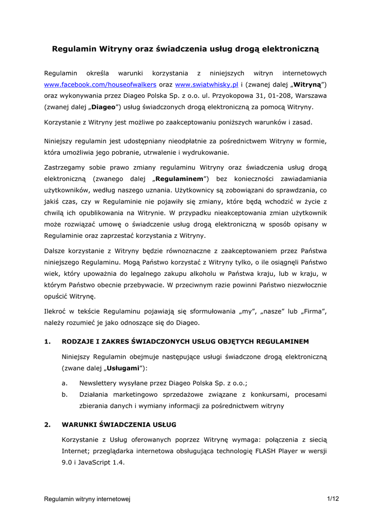 Regulamin Witryny oraz świadczenia usług drogą elektroniczną Regulamin określa warunki korzystania z niniejszych witryn internetowych www.facebook.com/houseofwalkers oraz www.swiatwhisky.pl i (zwanej dalej „Witryną”) oraz wykonywania przez Diageo Polska Sp. z o.o. ul. Przyokopowa 31, 01-208, Warszawa (zwanej dalej „Diageo”) usług świadczonych drogą elektroniczną za pomocą Witryny. Korzystanie z Witryny jest moŜliwe po zaakceptowaniu poniŜszych warunków i zasad. Niniejszy regulamin jest udostępniany nieodpłatnie za pośrednictwem Witryny w formie, która umoŜliwia jego pobranie, utrwalenie i wydrukowanie. Zastrzegamy sobie prawo zmiany regulaminu Witryny oraz świadczenia usług drogą elektroniczną (zwanego dalej „Regulaminem”) bez konieczności zawiadamiania uŜytkowników, według naszego uznania. UŜytkownicy są zobowiązani do sprawdzania, co jakiś czas, czy w Regulaminie nie pojawiły się zmiany, które będą wchodzić w Ŝycie z chwilą ich opublikowania na Witrynie. W przypadku nieakceptowania zmian uŜytkownik moŜe rozwiązać umowę o świadczenie usług drogą elektroniczną w sposób opisany w Regulaminie oraz zaprzestać korzystania z Witryny. Dalsze korzystanie z Witryny będzie równoznaczne z zaakceptowaniem przez Państwa niniejszego Regulaminu. Mogą Państwo korzystać z Witryny tylko, o ile osiągnęli Państwo wiek, który upowaŜnia do legalnego zakupu alkoholu w Państwa kraju, lub w kraju, w którym Państwo obecnie przebywacie. W przeciwnym razie powinni Państwo niezwłocznie opuścić Witrynę. Ilekroć w tekście Regulaminu pojawiają się sformułowania „my”, „nasze” lub „Firma”, naleŜy rozumieć je jako odnoszące się do Diageo. 1. RODZAJE I ZAKRES ŚWIADCZONYCH USŁUG OBJĘTYCH REGULAMINEM Niniejszy Regulamin obejmuje następujące usługi świadczone drogą elektroniczną (zwane dalej „Usługami”): a. Newslettery wysyłane przez Diageo Polska Sp. z o.o.; b. Działania marketingowo sprzedaŜowe związane z konkursami, procesami zbierania danych i wymiany informacji za pośrednictwem witryny 2. WARUNKI ŚWIADCZENIA USŁUG Korzystanie z Usług oferowanych poprzez Witrynę wymaga: połączenia z siecią Internet; przeglądarka internetowa obsługująca technologię FLASH Player w wersji 9.0 i JavaScript 1.4. Regulamin witryny internetowej 1/12 Zawarcie umowy o świadczenie Usług następuje poprzez zarejestrowanie i stworzenie konta na Witrynie oraz określenie zakresu Usług, które uŜytkownik chce otrzymywać. Diageo zobowiązuje się do niezwłocznego rozpoczęcia świadczenia Usług. UŜytkownik moŜe w kaŜdej chwili zrezygnować z otrzymywania Usługi. Rezygnacja z otrzymywania Usługi jest równoznaczna z rozwiązaniem umowy o świadczenie Usługi ze skutkiem natychmiastowym. UŜytkownik moŜe w kaŜdej chwili zamknąć swoje konto w Witrynie. Zamknięcie konta uŜytkownika w Witrynie jest równoznaczne z rozwiązaniem umów o świadczenie wszystkich Usług. Konto uŜytkownika w Witrynie podlega automatycznemu zamknięciu w przypadku braku aktywności uŜytkownika przez okres 3 lat i skutkuje zaprzestaniem świadczenia wybranych przez niego Usług. Zaprzestanie świadczenia Usług i rozwiązanie umowy o świadczenie Usług przez Diageo moŜe nastąpić za jednodniowym wypowiedzeniem a w przypadkach naruszenia postanowień niniejszego Regulaminu – bez wypowiedzenia ze skutkiem natychmiastowym. W przypadku rozwiązania umowy o Usługi, a takŜe zamknięcia Państwa nieaktywnego konta w Witrynie, Państwa dane osobowe zostaną usunięte lub zanonimizowane, o ile podstawa do ich dalszego przetwarzania nie wynika z przepisów prawa lub nie udzielili nam Państwo zgody na ich dalsze przetwarzanie. Zakazane jest dostarczanie przez uŜytkowników Witryny oraz Usług treści o charakterze bezprawnym. W razie otrzymania przez nas wiarygodnej informacji o bezprawnym charakterze treści dostarczanej przez uŜytkownika, moŜemy całkowicie albo teŜ czasowo zamknąć dostęp do Usług lub Witryny takiemu uŜytkownikowi oraz usunąć takie treści. UŜytkownicy Usług mogą składać reklamacje w sprawach dotyczących Usług. Reklamacje naleŜy składać pisemnie na adres: Diageo Polska Sp. z o.o. ul. Przyokopowa 31, 01-208, Warszawa. Reklamacja powinna zawierać co najmniej oznaczenie uŜytkownika (w tym imię, nazwisko, adres pocztowy, adres e-mail) oraz opis problemu będącego podstawą reklamacji. Reklamacje nie zawierające powyŜszych danych nie będą uwzględniane. Diageo rozpatruje reklamacje w terminie 30 dni licząc od dnia jej wniesienia. O rozstrzygnięciu uŜytkownik powiadamiany jest za pośrednictwem poczty elektronicznej na adres e-mail podany w reklamacji. UŜytkownik moŜe korzystać z wybranych Usług anonimowo lub z wykorzystaniem pseudonimu. Regulamin witryny internetowej 2/12 3. PRAWA Wszelkie prawa do materiałów oraz treści zamieszczonych w Witrynie (w tym, ale nie wyłącznie, materiałów tekstowych, graficznych oraz dźwiękowych, stron internetowych oraz oprogramowania z uwzględnieniem kodu, interfejsu oraz struktury strony) a takŜe filmów, naleŜą do nas lub podmiotów naleŜących do grupy w skład, której wchodzi Diageo i w której podmiotem dominującym jest Diageo plc zarejestrowana w Anglii i Walii pod numerem 23307, z siedzibą przy 8 Henrietta Place, London W1G 0NB, Wielka Brytania (zwanych dalej „Grupą Diageo”). Niniejszym wyraŜają Państwo zgodę na uŜywanie tych materiałów tylko na warunkach określonych w Regulaminie, chyba Ŝe dla innego sposobu ich uŜycia uzyskają Państwo pisemną zgodę właściwego podmiotu z Grupy Diageo lub podmiotów udzielających licencji. Z zastrzeŜeniem innych postanowień niniejszego Regulaminu, publicznie materiałów odtwarzać tych lub nie wolno wyświetlać, kopiować, rozdawać, powielać, przekazywać, wykorzystywać do celów komercyjnych lub zawodowych, utrwalać w jakikolwiek sposób, udostępniać w taki sposób,
