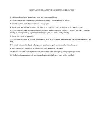 REGULAMIN OBJAZDOWEGO KINA PLENEROWEGO 1. Miejscem działalności kina plenerowego jest teren gminy Biecz. 2 .Organizatorem kina plenerowego jest Miejsko-Gminny Ośrodek Kultury w Bieczu. 3. Objazdowe kino letnie działa w okresie wakacyjnym. 4. Seanse będą wyświetlane w soboty - w lipcu 2016 r. o godz. 21.30 i w sierpniu 2016 r. o godz. 21.00. 5. Organizator nie stawia ograniczeń wiekowych dla uczestników pokazu, jednakże zastrzega, że dzieci i młodzież poniżej 15 roku życia mogą w pokazie uczestniczyć tylko pod opieką osoby dorosłej. 6. Seanse plenerowe są bezpłatne. 7. Organizator zapewnia 70 leżaków, jednak każdy widz może przynieść własne bezpieczne siedzisko (karimata, koc itp.) 8. W trakcie pokazu obowiązuje zakaz palenia tytoniu oraz spożywania napojów alkoholowych. 9. Wszyscy uczestnicy projekcji są zobowiązani zachowywać się kulturalnie. 10. Wzięcie udziału w seansie plenerowym jest równoznaczne z akceptacją niniejszego Regulaminu. 11. Osoby łamiące postanowienia niniejszego Regulaminu będą usuwane z miejsc projekcji.