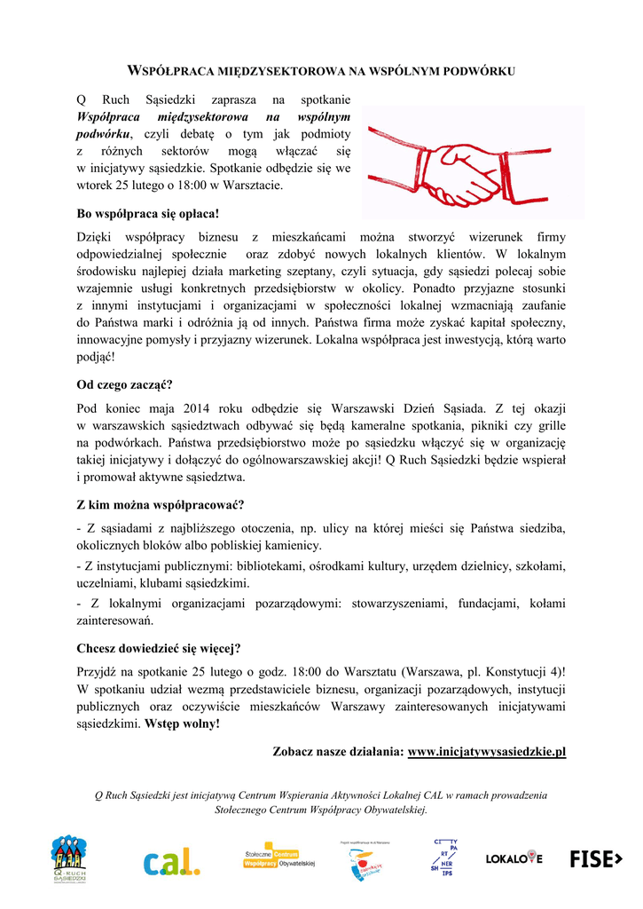 WSPÓŁPRACA MIĘDZYSEKTOROWA NA WSPÓLNYM PODWÓRKU Q Ruch Sąsiedzki zaprasza na spotkanie Współpraca międzysektorowa na wspólnym podwórku, czyli debatę o tym jak podmioty z różnych sektorów mogą włączać się w inicjatywy sąsiedzkie. Spotkanie odbędzie się we wtorek 25 lutego o 18:00 w Warsztacie. Bo współpraca się opłaca! Dzięki współpracy biznesu z mieszkańcami można stworzyć wizerunek firmy odpowiedzialnej społecznie oraz zdobyć nowych lokalnych klientów. W lokalnym środowisku najlepiej działa marketing szeptany, czyli sytuacja, gdy sąsiedzi polecaj sobie wzajemnie usługi konkretnych przedsiębiorstw w okolicy. Ponadto przyjazne stosunki z innymi instytucjami i organizacjami w społeczności lokalnej wzmacniają zaufanie do Państwa marki i odróżnia ją od innych. Państwa firma może zyskać kapitał społeczny, innowacyjne pomysły i przyjazny wizerunek. Lokalna współpraca jest inwestycją, którą warto podjąć! Od czego zacząć? Pod koniec maja 2014 roku odbędzie się Warszawski Dzień Sąsiada. Z tej okazji w warszawskich sąsiedztwach odbywać się będą kameralne spotkania, pikniki czy grille na podwórkach. Państwa przedsiębiorstwo może po sąsiedzku włączyć się w organizację takiej inicjatywy i dołączyć do ogólnowarszawskiej akcji! Q Ruch Sąsiedzki będzie wspierał i promował aktywne sąsiedztwa. Z kim można współpracować? - Z sąsiadami z najbliższego otoczenia, np. ulicy na której mieści się Państwa siedziba, okolicznych bloków albo pobliskiej kamienicy. - Z instytucjami publicznymi: bibliotekami, ośrodkami kultury, urzędem dzielnicy, szkołami, uczelniami, klubami sąsiedzkimi. - Z lokalnymi organizacjami pozarządowymi: stowarzyszeniami, fundacjami, kołami zainteresowań. Chcesz dowiedzieć się więcej? Przyjdź na spotkanie 25 lutego o godz. 18:00 do Warsztatu (Warszawa, pl. Konstytucji 4)! W spotkaniu udział wezmą przedstawiciele biznesu, organizacji pozarządowych, instytucji publicznych oraz oczywiście mieszkańców Warszawy zainteresowanych inicjatywami sąsiedzkimi. Wstęp wolny! Zobacz nasze działania: www.inicjatywysasiedzkie.pl Q Ruch Sąsiedzki jest inicjatywą Centrum Wspierania Aktywności Lokalnej CAL w ramach prowadzenia Stołecznego Centrum Współpracy Obywatelskiej.