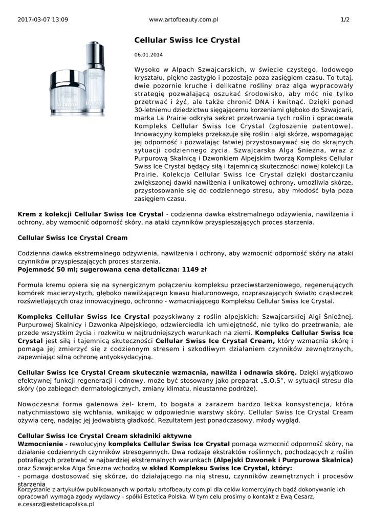 2017-03-07 13:09 www.artofbeauty.com.pl 1/2 Cellular Swiss Ice Crystal 06.01.2014 Wysoko w Alpach Szwajcarskich, w świecie czystego, lodowego kryształu, piękno zastygło i pozostaje poza zasięgiem czasu. To tutaj, dwie pozornie kruche i delikatne rośliny oraz alga wypracowały strategię pozwalającą oszukać środowisko, aby móc nie tylko przetrwać i żyć, ale także chronić DNA i kwitnąć. Dzięki ponad 30-letniemu dziedzictwu sięgającemu korzeniami głęboko do Szwajcarii, marka La Prairie odkryła sekret przetrwania tych roślin i opracowała Kompleks Cellular Swiss Ice Crystal (zgłoszenie patentowe). Innowacyjny kompleks przekazuje siłę roślin i algi skórze, wspomagając jej odporność i pozwalając łatwiej przystosowywać się do skrajnych sytuacji codziennego życia. Szwajcarska Alga Śnieżna, wraz z Purpurową Skalnicą i Dzwonkiem Alpejskim tworzą Kompleks Cellular Swiss Ice Crystal będący siłą i tajemnicą skuteczności nowej kolekcji La Prairie. Kolekcja Cellular Swiss Ice Crystal dzięki dostarczaniu zwiększonej dawki nawilżenia i unikatowej ochrony, umożliwia skórze, przystosowanie się do codziennego stresu, aby młodość była poza zasięgiem czasu. Krem z kolekcji Cellular Swiss Ice Crystal - codzienna dawka ekstremalnego odżywienia, nawilżenia i ochrony, aby wzmocnić odporność skóry, na ataki czynników przyspieszających proces starzenia. Cellular Swiss Ice Crystal Cream Codzienna dawka ekstremalnego odżywienia, nawilżenia i ochrony, aby wzmocnić odporność skóry na ataki czynników przyspieszających proces starzenia. Pojemność 50 ml; sugerowana cena detaliczna: 1149 zł Formuła kremu opiera się na synergicznym połączeniu kompleksu przeciwstarzeniowego, regenerujących komórek macierzystych, głęboko nawilżającego kwasu hialuronowego, rozpraszających światło cząsteczek rozświetlających oraz innowacyjnego, ochronno - wzmacniającego Kompleksu Cellular Swiss Ice Crystal. Kompleks Cellular Swiss Ice Crystal pozyskiwany z roślin alpejskich: Szwajcarskiej Algi Śnieżnej, Purpurowej Skalnicy i Dzwonka Alpejskiego, odzwierciedla ich umiejętność, nie tylko do przetrwania, ale przede wszystkim życia i rozkwitu w najtrudniejszych warunkach na ziemi. Kompleks Cellular Swiss Ice Crystal jest siłą i tajemnicą skuteczności Cellular Swiss Ice Crystal Cream, który wzmacnia skórę i pomaga jej zmierzyć się z codziennym stresem i szkodliwym działaniem czynników zewnętrznych, zapewniając silną ochronę antyoksydacyjną. Cellular Swiss Ice Crystal Cream skutecznie wzmacnia, nawilża i odnawia skórę. Dzięki wyjątkowo efektywnej funkcji regeneracji i odnowy, może być stosowany jako preparat „S.O.S”, w sytuacji stresu dla skóry (po zabiegach dermatologicznych, zmiany klimatu, nieustanne podróże). Nowoczesna forma galenowa żel- krem, to bogata a zarazem bardzo lekka konsystencja, która natychmiastowo się wchłania, wnikając w odpowiednie warstwy skóry. Cellular Swiss Ice Crystal Cream ożywia cerę, nadając jej jedwabistą gładkość. Rezultatem jest ponadczasowy, młody wygląd. Cellular Swiss Ice Crystal Cream składniki aktywne Wzmocnienie - rewolucyjny kompleks Cellular Swiss Ice Crystal pomaga wzmocnić odporność skóry, na działanie codziennych czynników stresogennych. Dwa rodzaje ekstraktów roślinnych, pochodzących z roślin potrafiących przetrwać w najbardziej ekstremalnych warunkach (Alpejski Dzwonek i Purpurowa Skalnica) oraz Szwajcarska Alga Śnieżna wchodzą w skład Kompleksu Swiss Ice Crystal, który: - pomaga dostosować się skórze, do działającego na nią stresu, czynników zewnętrznych i procesów starzenia Korzystanie z artykułów publikowanych w portalu artofbeauty.com.pl dla celów komercyjnych bądź dokonywanie ich opracowań wymaga zgody wydawcy - spółki Estetica Polska. W tym celu prosimy o kontakt z Ewą Cesarz, [email protected] 2017-03-07 13:09 - www.artofbeauty.com.pl 2/2 wspiera system obronny skóry i oczyszczają ją z toksyn ü chroni DNA komórek pomaga zachować prawidłową funkcję komórek macierzystych oraz wspierają odnowę naskórka chroni mitochondria w celu zabezpieczenia dostaw energii dla skóry działa silnie antyoksydacyjnie. Nawilżenie - wysoce skuteczne środki nawilżające wzmacniają i utrzymują prawidłowe nawilżenie skóry, wzmacniają funkcje ochronne skóry i chronią przed uszkodzeniami. - Mieszanka Kwasu Hialuronowego o dużej i małej masie cząsteczkowej pomaga utrzymać jędrność i nawilżenie poprzez poprawę spójności komórek. Wysokocząsteczkowy Kwas Hialuronowy działa jak ochronny film na powierzchni skóry, zatrzymując wilgoć w skórze, natomiast niskocząsteczkowy Kwas Hialuronowy ogranicza transepidermalną utratę wody. - Kompleks Sfingolipidów pozyskiwany z mąki pszennej stosowany jest w celu przywrócenia funkcji bariery międzykomórkowej skóry (cement międzykomórkowy), zwiększenia poziomu nawilżenia, ochrony oraz działania przeciwstarzeniowego. - Wyciąg z Kwiatu Malwy, Ekstrakt z Babki oraz Ekstrakt z Białej Genepi, rośliny pierwotnie uprawiane w szwajcarskich Alpach, wykazują właściwości antyoksydacyjne, łagodzące, jak również nawilżające. Dodatkowo, Masło Shea zapewnia korzyści zmiękczające i nawilżając Odnowa skóry - wyspecjalizowane składniki odnawiające skórę. - Macierz Sterowania Tkankami wspiera strukturę skóry, integruje młodsze komórki skóry w procesie starzenia prowadząc tym samym do odnowy skóry. Dodatkowo zapewnia korzyści tj. regeneracja skóry wygładzenie, nawilżenie, działanie łagodzące oraz ma pozytywny wpływ na strukturę skóry i funkcję macierzy zewnątrzkomórkowej. - Kultura komórek macierzystych Kawy Bengalskiej intensywnie przywraca gęstość skórze, wypełnia zmarszczki, nawilża oraz wykazuje działanie energizujące i antyoksydacyjne. Technologia działająca w trzech warstwach skóry zapobiega utracie tłuszczu w tkankach