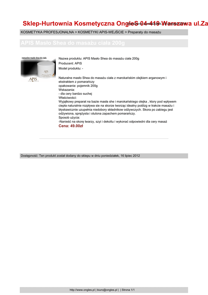 Utworzono: poniedziałek,Warszawa 18 sierpień 2014 Sklep-Hurtownia Kosmetyczna OngleS 04-419 ul.Za KOSMETYKA PROFESJONALNA > KOSMETYKI APIS-WEJŚCIE > Preparaty do masażu APIS Masło Shea do masażu ciała 200g Nazwa produktu: APIS Masło Shea do masażu ciała 200g Producent: APIS Model produktu: Naturalne masło Shea do masażu ciała z marokańskim olejkiem arganowym i ekstraktem z pomarańczy opakowanie: pojemnik 200g Wskazania: - dla cery bardzo suchej Właściwości: Wyjątkowy preparat na bazie masła she i marokańskiego olejka , ktory pod wpływem ciepła naturalnie rozpływa sie na skorze tworząc idealny poślizg w trakcie masażu i błyskawicznie uzupełnia niedobory składnikow odżywczych. Skora po zabiegu jest odżywiona, sprężysta i otulona zapachem pomarańczy. Sposob użycia: -Nanieść na skorę twarzy, szyi i dekoltu i wykonać odpowiedni dla cery masaż Cena: 49.00zł Dostępność: Ten produkt został dodany do sklepu w dniu poniedziałek, 16 lipiec 2012 http://www.ongles.pl | [email protected] | | Strona 1/1