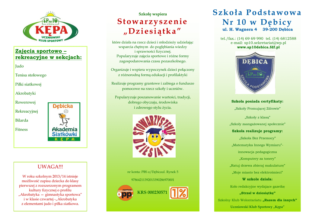 Szkołę wspiera Stowarzyszenie „Dziesiątka” Zajęcia sportowo – rekreacyjne w sekcjach: Judo Tenisa stołowego Piłki siatkowej Akrobatyki Rowerowej Rekreacyjnej które działa na rzecz dzieci i młodzieży udzielając wsparcia chętnym do pogłębiania wiedzy i sprawności fizycznej. Popularyzuje zajęcia sportowe i różne formy zagospodarowania czasu pozaszkolnego. Szkoła Podstawowa Nr 10 w Dębicy ul. H. Wagnera 4 39-200 Dębica tel./fax.: (14) 69 69 990 tel. (14) 6812588 e-mail: [email protected] www.sp10debica.fdf.pl Organizuje i wspiera wypoczynek dzieci połączony z różnorodną formą edukacji i profilaktyki Realizuje programy grantowe i zabiega o fundusze pomocowe na rzecz szkoły i uczniów. Popularyzuje poszanowanie wartości, tradycji, dobrego obyczaju, środowiska i zdrowego stylu życia. Szkoła posiada certyfikaty: „Szkoły Promującej Zdrowie” „Szkoły z klasą” Bilarda „Szkoły zaangażowanej społecznie” Fitness Szkoła realizuje programy: „Szkoła Bez Przemocy” „Matematyka Innego Wymiaru”innowacja pedagogiczna „Komputery za tonery” „Ratuj drzewa zbieraj makulaturę” UWAGA!!! W roku szkolnym 2013/14 istnieje możliwość zapisu dziecka do klasy pierwszej z rozszerzonym programem kultury fizycznej o profilu „Akrobatyka — gimnastyka sportowa” i w klasie czwartej -„Akrobatyka z elementami judo i piłka siatkowa. nr konta: PBS o/Dębicaul. Rynek 5 „Moje miasto bez elektrośmieci” 97864211392013390286970001 W szkole działa: Koło redakcyjne wydające gazetkę KRS 000230571 „Strzał w dziesiątkę” Szkolny Klub Wolontariatu „Razem dla innych” Uczniowski Klub Sportowy „Kępa” Szkoła Podstawowa nr 10 Zajęcia pozalekcyjne z języka angielskiego, informatyki, kółko ekologiczne, matematyczne, dziennikarskie dla dzieci młodszych i starszych. Możliwość działania na rzecz innych w Szkolnym Kole Wolontariatu i Kole Caritas Zajęcia szkoły tańca. Kursy efektywnych technik uczenia się. Obiady w stołówce szkolnej. Zajęcia świetlicowe w godzinach dostosowanych do potrzeb rodziców. Naukę na jedną zmianę. Udział w programach i projektach unijnych Atrakcyjne wycieczki, wyjazdy na Zielone Szkoły, zimowiska, półkolonie letnie, pikniki, bale karnawałowe, rajdy rowerowe i liczne imprezy środowiskowe. Po raz pierwszy od nowego roku szkolnego oferujemy naukę w klasie pierwszej z rozszerzonym programem kultury fizycznej „Akrobatyka i gimnastyka sportowa” i w klasie czwartej „Akrobatyka z elementami judo i piłka siatkowa. w Dębicy gwarantuje: wysoki poziom dydaktyczny fachową pomoc pedagoga, logopedy, reedukatora naukę języka angielskiego od klasy pierwszej. Lekcje wychowania fizycznego prowadzone w oparciu o nowoczesną bazę sportową (sala gimnastyczna, sala sztuk walki, sala korekcyjna- lustrzana) Przy szkole funkcjonuje oddział zerowy dla 5 i 6 – letnich dzieci Zajęcia w oddziale są bezpłatne. Dzieci mogą korzystać z obiadów w stołówce szkolnej, a po skończonych zajęciach ze świetlicy szkolnej. W oddziale przedszkolnym odbywają się dodatkowe zajęcia z języka angielskiego i rytmiki. Dzieci mogą korzystać z zajęć akrobatyki, judo i nauki tańca. Dzieci uczestniczą w programie profilaktyki zdrowotnej „Akademia Aquafresh” liczba miejsc w roku szkolnym 2013/2014 ograniczona. Bezpłatną naukę pływania w klasach I-III. Lekcje w pracowniach wyposażonych w komputery z dostępem do bezprzewodowego Internetu, projektory, tablice interaktywne i różnorakie pomoce dydaktyczne. Lekcje zajęć komputerowych — każdy uczeń przy osobnym laptopie. Udział w licznych konkursach, olimpiadach, zawodach sportowych, Dodatkowe lekcje dla uczniów potrzebujących wsparcia dydaktycznego oraz dla wyróżniających się w nauce.