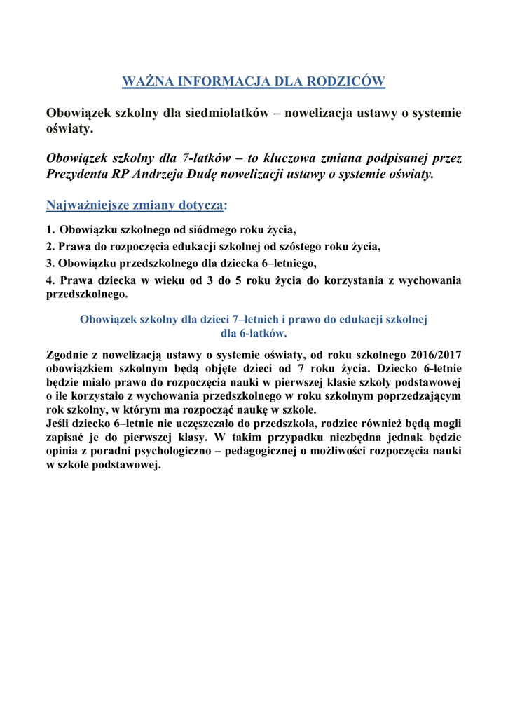 WAŻNA INFORMACJA DLA RODZICÓW Obowiązek szkolny dla siedmiolatków – nowelizacja ustawy o systemie oświaty. Obowiązek szkolny dla 7-latków – to kluczowa zmiana podpisanej przez Prezydenta RP Andrzeja Dudę nowelizacji ustawy o systemie oświaty. Najważniejsze zmiany dotyczą: 1. Obowiązku szkolnego od siódmego roku życia, 2. Prawa do rozpoczęcia edukacji szkolnej od szóstego roku życia, 3. Obowiązku przedszkolnego dla dziecka 6–letniego, 4. Prawa dziecka w wieku od 3 do 5 roku życia do korzystania z wychowania przedszkolnego. Obowiązek szkolny dla dzieci 7–letnich i prawo do edukacji szkolnej dla 6-latków. Zgodnie z nowelizacją ustawy o systemie oświaty, od roku szkolnego 2016/2017 obowiązkiem szkolnym będą objęte dzieci od 7 roku życia. Dziecko 6-letnie będzie miało prawo do rozpoczęcia nauki w pierwszej klasie szkoły podstawowej o ile korzystało z wychowania przedszkolnego w roku szkolnym poprzedzającym rok szkolny, w którym ma rozpocząć naukę w szkole. Jeśli dziecko 6–letnie nie uczęszczało do przedszkola, rodzice również będą mogli zapisać je do pierwszej klasy. W takim przypadku niezbędna jednak będzie opinia z poradni psychologiczno – pedagogicznej o możliwości rozpoczęcia nauki w szkole podstawowej. Ponowne zapisanie dziecka do klasy I lub II. Rodzice, których dzieci poszły do szkoły, jako sześciolatki i natrafiły na problemy adaptacyjne i trudności w szkole, wnosili o wprowadzenie rozwiązań, które złagodziłyby proces wcześniejszego objęcia ich dzieci obowiązkiem szkolnym. Dlatego wprowadzono w ustawie przepisy przejściowe odnoszące się do roku szkolnego 2015/2016 oraz 2016/2017. Dzieci urodzone w 2009 r., które są już w szkole w roku szkolnym 2015/2016, będą mogły na wniosek rodziców – kontynuować naukę w pierwszej klasie szkoły podstawowej w roku szkolnym 2016/2017. Rodzic musi złożyć stosowny wniosek do dyrektora szkoły do 31 marca 2016 r. Dziecko nie będzie podlegało klasyfikacji rocznej, a tym samym promowaniu do klasy drugiej; jeżeli rodzice zdecydują, że ich dziecko będzie kontynuować naukę w klasie pierwszej w szkole, do której uczęszcza, wobec tego dziecka nie będzie przeprowadzane postępowanie rekrutacyjne. Dzieci urodzone w I połowie 2008 r., które w roku szkolnym 2015/2016 chodzą do klasy II szkoły podstawowej, na wniosek rodziców, złożony do 31 marca 2016 r., będą mogły – w roku szkolnym 2016/2017 kontynuować naukę w klasie II. Uczniowie ze specjalnymi potrzebami edukacyjnymi. Dzieciom, które mają orzeczenie o potrzebie kształcenia specjalnego będzie można odroczyć obowiązek szkolny, jednak nie dłużej niż do końca roku szkolnego w tym roku kalendarzowym, w którym dziecko kończy 9 lat. W tym przypadku dziecko będzie kontynuowało przygotowanie przedszkolne. Wzór wniosku w załączeniu i w zakładce DLA RODZICA. Barbara Rozwadowska Dyrektor Szkoły