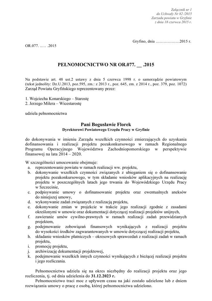 Załącznik nr 1 do Uchwały Nr 82 /2015 Zarzadu powiatu w Gryfinie z dnia 18 czerwca 2015 r. Gryfino, dnia ………………2015 r. OR.077. ..… .2015 PEŁNOMOCNICTWO NR OR.077. __ .2015 Na podstawie art. 48 ust.2 ustawy z dnia 5 czerwca 1998 r. o samorządzie powiatowym (tekst jednolity: Dz.U.2013, poz.595, zm.: z 2013 r., poz. 645, zm. z 2014 r., poz. 379, poz. 1072) Zarząd Powiatu Gryfińskiego reprezentowany przez: 1. Wojciecha Konarskiego – Starostę 2. Jerzego Milera – Wicestarostę udziela pełnomocnictwa Pani Bogusławie Florek Dyrektorowi Powiatowego Urzędu Pracy w Gryfinie do dokonywania w imieniu Zarządu wszelkich czynności zmierzających do uzyskania dofinansowania i realizacji projektu pozakonkursowego w ramach Regionalnego Programu Operacyjnego Województwa Zachodniopomorskiego w perspektywie finansowej na lata 2014 – 2020. W szczególności umocowanie obejmuje: a. reprezentowanie powiatu w ramach realizacji ww. projektu, b. dokonywanie wszelkich czynności związanych z ubieganiem się o dofinansowanie projektu pozakonkursowego, w tym składanie wniosków aplikacyjnych na realizację projektu w poszczególnych latach jego trwania do Wojewódzkiego Urzędu Pracy w Szczecinie, c. podpisywanie umowy o dofinansowanie projektu oraz ewentualnych aneksów do niniejszej umowy, d. wykonywanie zadań związanych z realizacją projektu, e. dokonywanie zmian w projekcie w trakcie jego realizacji zgodnie z zasadami określonymi w umowie oraz dokumentacji dotyczącej realizacji projektów unijnych, f. zawieranie umów cywilno-prawnych w ramach realizacji zadań przewidzianych projektem, g. podejmowanie zobowiązań finansowych wynikających z realizacji projektu do wysokości środków zagwarantowanych w umowie dotyczącej realizacji projektu, h. składanie wniosków płatniczych – okresowych sprawozdań z realizacji zadań w ramach projektu, i. promocję projektu, j. archiwizację dokumentacji projektowej, k. podejmowanie wszelkich innych czynności wynikających z bieżącej realizacji projektu i jego rozliczania. Pełnomocnictwa udziela się na okres niezbędny do realizacji projektu oraz jego rozliczenia, tj. od dnia udzielenia do 31.12.2023 r. Pełnomocnictwo traci moc z upływem czasu na jaki zostało udzielone lub z dniem rozwiązania umowy o pracę z osobą, której pełnomocnictwa udzielono. Pełnomocnik w granicach posiadanego umocowania może udzielić dalszego pełnomocnictwa pracownikowi Powiatowego Urzędu Pracy w Gryfinie do ww. czynności związanych z realizacją projektu. Dyrektor Powiatowego Urzędu Pracy w Gryfinie, któremu wydano pełnomocnictwo zobowiązuje się do każdorazowego poinformowania Zarządu Powiatu o wydanych przez siebie dalszych pełnomocnictwach z podaniem ich szczegółowego zakresu. Starosta – Wojciech Konarski …………………………………… Wicestarosta – Jerzy Miler ……………………………………