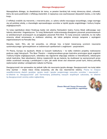 Dlaczego Dwujęzyczna? Niewątpliwie dlatego, że dwadzieścia lat temu, w pewien bardziej lub mniej słoneczny dzień, człowiek, który do życia podchodzi z refleksją stwierdził, iż najwyższy czas wychowywać obywateli świata, a nie tylko kraju. Z refleksji zrodziło się marzenie, z marzenia plan, a z planu szkoła nauczająca wszystkiego, czego wymaga się od polskiej szkoły, a równolegle wprowadzająca uczniów w tajniki języka angielskiego i kultury krajów anglojęzycznych. To tutaj najmłodsze dzieci finalizują każdy rok szkolny festiwalem teatru Funny Mask odkrywając swe talenty aktorskie i lingwistyczne. To tutaj Walentynki rozbrzmiewają dźwiękami piosenek prezentowanych w wielobarwnych aranżacjach na przeglądzie piosenek Pink Bird. To tutaj wreszcie naleśniki, to nie tylko smaczny obiad serwowany w stołówce szkolnej, ale także potężne emocje związane z wyścigami organizowanymi na Pancake Day. Muzyka, teatr, film, ale też wszystko, co oferuje tzw. e–świat towarzyszą uczniom nauczania systematycznego i gimnazjalistom w codziennych spotkaniach z anglistami - pasjonatami. TV Piwna, Europa na Językach, Moda w Czasach Subkultury – to tylko niektóre projekty realizowane podczas zajęć lekcyjnych. The Bear Theatre – międzynarodowa grupa teatralna promująca język angielski i kulturę krajów anglojęzycznych, odwiedza nas regularnie włączając widzów w interaktywne, edukacyjne sztuki teatralne. Nasi absolwenci, którzy rozpierzchli się po świecie, by studiować na wymarzonych przez siebie uczelniach wracają z prelekcjami o tym, jak wiele drzwi stoi otworem przed tymi, którzy potrafią wykorzystać wiedzę i umiejętności nabyte na Piwnej. Dwujęzyczność nie sprowadza się jednak tylko do nauczania języka obcego. Dwujęzyczność ma tutaj także inny wymiar – może nieco mniej oczywisty, ale dla nas niezmiernie istotny. Piwna to miejsce współbrzmienia dwóch języków: języka nauki i języka wzajemnego szacunku uczniów i nauczycieli – to właśnie ta ‘dwujęzyczność’ jest harmonijną podwaliną naszych wspólnych sukcesów, to właśnie tę dwujęzyczność cenimy sobie najbardziej. Danuta Matczuk/Joanna Dziwanowska nauczycielki jez. angielskiego