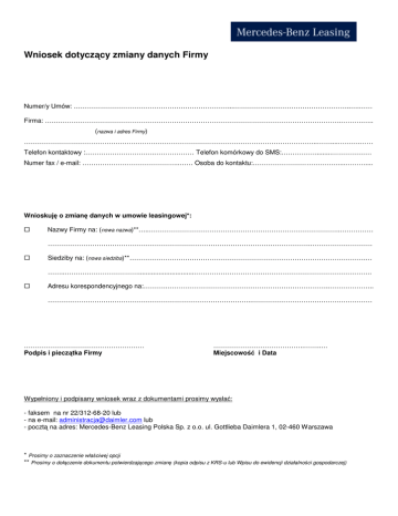Wniosek dotyczący zmiany danych Firmy Numer/y Umów: ……………………………………………………………...……………………………………………..….…… Firma: …………………………………………………………………………………………………………………….……….….. (nazwa i adres Firmy) …………………………………………………………………………………………………………………...……....……….…… Telefon kontaktowy :………………………….……………… Telefon komórkowy do SMS:…………….........……………… Numer fax / e-mail: ……………………………………..…… Osoba do kontaktu:…………………………………...……….... Wnioskuję o zmianę danych w umowie leasingowej*: Nazwy Firmy na: (nowa nazwa)**…..…………………………………………………………………………..…………… ……………………………………………………………………………………………………….………………………. Siedziby na: (nowa siedziba)**…………………………………………………………………………………………….… ……..……………………………...............................……………………………………………………………………. Adresu korespondencyjnego na:……….………………………………………………………………..……………….. ………………………………………………………………………………..……………………………………………… ……………………………………………… Podpis i pieczątka Firmy …………………………………..……..… Miejscowość i Data Wypełniony i podpisany wniosek wraz z dokumentami prosimy wysłać: - faksem na nr 22/312-68-20 lub - na e-mail: [email protected] lub - pocztą na adres: Mercedes-Benz Leasing Polska Sp. z o.o. ul. Gottlieba Daimlera 1, 02-460 Warszawa * Prosimy o zaznaczenie właściwej opcji ** Prosimy o dołączenie dokumentu potwierdzającego zmianę (kopia odpisu z KRS-u lub Wpisu do ewidencji działalności gospodarczej)
