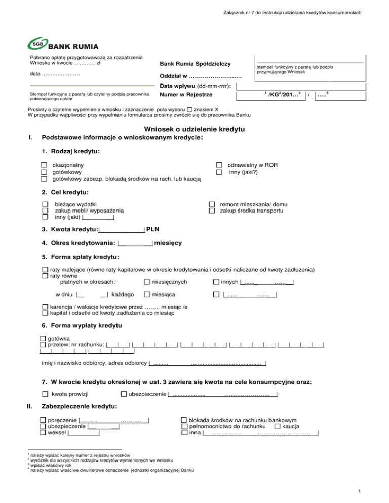 Załącznik nr 7 do Instrukcji udzielania kredytów konsumenckich Pobrano opłatę przygotowawczą za rozpatrzenia Wniosku w kwocie ………… zł Bank Rumia Spółdzielczy data …………………. Oddział w ……………………… stempel funkcyjny z parafą lub podpis przyjmującego Wniosek Data wpływu (dd-mm-rrrr): Stempel funkcyjne z parafą lub czytelny podpis pracownika pobierającego opłatę 1 Numer w Rejestrze 2 3 /KG /201… / ….. 4 Prosimy o czytelne wypełnienie wniosku i zaznaczenie pola wyboru znakiem X W przypadku wątpliwości przy wypełnianiu formularza prosimy zwrócić się do pracownika Banku Wniosek o udzielenie kredytu I. Podstawowe informacje o wnioskowanym kredycie: 1. Rodzaj kredytu: okazjonalny gotówkowy gotówkowy zabezp. blokadą środków na rach. lub kaucją odnawialny w ROR inny (jaki?) 2. Cel kredytu: bieżące wydatki zakup mebli/ wyposażenia inny (jaki) |__ __| 3. Kwota kredytu:|__ remont mieszkania/ domu zakup środka transportu _ 4. Okres kredytowania: |__ _| PLN __| miesięcy 5. Forma spłaty kredytu: raty malejące (równe raty kapitałowe w okresie kredytowania i odsetki naliczane od kwoty zadłużenia) raty równe płatnych w okresach: miesięcznych innych |_......_ ……__| w dniu |__ __| każdego miesiąca |_......_ ……__| karencja / wakacje kredytowe przez …….. miesiąc /e kapitał i odsetki od kwoty zadłużenia co miesiąc 6. Forma wypłaty kredytu gotówka przelew; nr rachunku: |_ _|_ _| |_ _|_ _|_ _|_ _| |_ _|_ _|_ _|_ _| |_ _|_ _|_ _|_ _| |_ _|_ _|_ _|_ _| |_ _|_ _|_ _|_ _| |_ _|_ _|_ _|_ _| imię i nazwisko odbiorcy, adres odbiorcy |_........._ _..........................................._| 7. W kwocie kredytu określonej w ust. 3 zawiera się kwota na cele konsumpcyjne oraz: kwota prowizji II. ubezpieczenie |_...................._ …………………..__| Zabezpieczenie kredytu: poręczenie |………__ ubezpieczenie |__ weksel |__ __| ………..__| __| blokada środków na rachunku bankowym pełnomocnictwo do rachunku kaucja inna |__................... ………………………__| 1 należy wpisać kolejny numer z rejestru wniosków wyróżnik dla wszystkich rodzajów kredytów wymienionych we wniosku wpisać właściwy rok 4 należy wpisać właściwe dwuliterowe oznaczenie jednostki organizacyjnej Banku 2 3 1 Załącznik nr 7 do Instrukcji udzielania kredytów konsumenckich III. Inne informacje Kredytobiorca/cy Klient Banku Rumia Spółdzielczego Członek Banku Rumia Spółdzielczego Świadom(i) odpowiedzialności karnej, wynikającej m.in. z art. 297 § 1 ustawy z dn.6.06.1997 r. Kodeks karny (Dz. U. nr 88 poz. 553 z późn. zm.), oświadczam(y), że wszystkie informacje podane w niniejszym dokumencie są prawdziwe i zgodne ze stanem faktycznym. Imię/imiona i nazwisko kredytobiorcy/ów PESEL Miejscowość data Podpis podpis Kredytobiorcy/ów 2