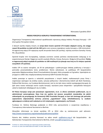 ul. Sapieżyńska 10a 00-215 Warszawa tel. 22 536 02 00 fax 22 536 02 20 [email protected] www.batory.org.pl Warszawa 3 grudnia 2014 INDEKS PERCEPCJI KORUPCJI TRANSPARENCY INTERNATIONAL Organizacja Transparency International opublikowała najnowszą edycję Indeksu Percepcji Korupcji – CPI (Corruption Perception Index). Z danych wynika między innymi, że wciąż dwie trzecie spośród 175 krajów objętych oceną, nie osiąga nawet 50 punktów na skali od 0 do 100 (gdzie zero oznacza największe ryzyko korupcji, a 100 minimalne). W tegorocznej edycji CPI najwyższy wynik otrzymała Dania (92 punkty), najniżej oceniono Somalię i Koreę Płn. (8 punktów). Spośród krajów Unii Europejskiej, najlepiej ocenione zostały państwa skandynawskie (włączają w to wspomnianą już Danię). Najgorsze wyniki uzyskały Włochy, Grecja, Rumunia i Bułgaria (43 punkty). Polska w tegorocznej edycji uzyskała 61 punktów na 100 możliwych (co plasuje nasz kraj na 31 miejscu spośród wszystkich 175 państw). Indeks CPI to ważne narzędzie, od 20 lat pobudzające i podtrzymujące debatę publiczną o korupcji i potrzebie przeciwdziałania temu problemowi. Warto odnotować, że publikacja CPI bezpośrednio poprzedza Międzynarodowy Dzień Przeciwdziałania Korupcji, który przypada na 9 grudnia. Upamiętnia on przyjęcie w 2003 roku międzynarodowej Konwencji OZN Przeciwko Korupcji. Indeks powstaje w oparciu o wskaźniki pozyskiwane z innych badań, realizowanych przez firmy i organizacje zajmujące się analizą ryzyka, sytuacji politycznej i ekonomicznej (takich jak Bank Światowy, Political Risk Services, czy Fundacja Bertelsmanna). Jest to nie tyle miara realnie występującej korupcji, ile (jak sama nazwa wskazuje) ocena ryzyka korupcji, wyrażana przez ekspertów i specjalistów biorących udział w badaniach składających się na Indeks. W Polsce korupcja wciąż jest poważnym zagrożeniem, m.in. w sferze zamówień publicznych, czy w administracji samorządowej. Nasz kraj nie spełnia też jeszcze wszystkich standardów do jakich zobowiązała się przystępując do Konwencji ONZ Przeciwko Korupcji, w tym tak istotnego jak potrzeba zapewnienia odpowiedniej ochrony prawnej „sygnalistom” (ang. whistleblowers), tj. osobom zgłaszającym w dobrej woli nadużycia w ich instytucjach, organizacjach, czy firmach. Fundacja im. Stefana Batorego podpisała w 2014 roku porozumienie o wzajemnej współpracy z Transaprency International Secretariat w Berlinie. Wszystkie informacje na temat wyników CPI w 2014 roku są zamieszczone pod adresem: http://www.transparency.org/whatwedo/publication/cpi2014 Pytania dot. Indeksu prosimy kierować na adres email: [email protected] lub bezpośrednio Sekretariatu Transparenty International w Berlinie, email: [email protected] . Fundacja im. Stefana Batorego jest organizacją pożytku publicznego Nr konta: 81 1030 1016 0000 0000 6145 0000 | Nr KRS: 0000 101194 do
