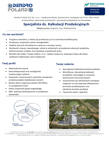 APLIKUJ DO 21.10.2016r Dendro Poland Ltd. Sp. z o.o. - międzynarodowa, dynamicznie rozwijająca się firma, lider wśród producentów materaców piankowych, poszukuje kandydatów na stanowisko: Specjalista ds. Kalkulacji Produkcyjnych Miejsce pracy: Rogoźno, woj. Wielkopolskie Co nas wyróżnia? Przyjazna atmosfera, o której się przekonasz już na rozmowie kwalifikacyjnej Atrakcyjny, przejrzysty system wynagrodzeń Stabilne warunki zatrudnienia w oparciu o umowę o pracę Możliwość rozwoju zawodowego: udział w szkoleniach, prowadzenie własnych projektów, dofinansowanie studiów, kurs językowy w godzinach pracy Benefity dla Ciebie i Twojej rodziny: m.in.: opieka medyczna, wakacyjne obozy dla dzieci, spotkania integracyjne, bony świąteczne Twój profil: Wykształcenie wyższe Komunikatywność oraz umiejętność analitycznego myślenia Znajomość nowoczesnych systemów zarządzania produkcją będzie dodatkowym atutem Bardzo dobra znajomość pakietu MS Office, w szczególności Excel Dobra znajomość języka angielskiego Mile widziane doświadczenie na podobnym stanowisku Twoje zadania: Sporządzanie kalkulacji kosztów produkcji Weryfikacja i aktualizacja kalkulacji produktów równolegle ze zmianami technicznymi lub procesowymi Uczestnictwo we wdrożeniach rozwiązań mających na celu poprawę efektywności procesów produkcyjnych oraz obniżenie kosztów produkcji Tworzenie analiz i raportów Na aplikacje czekamy do dn. 21.10.2016r.. pod adresem: [email protected] lub Dendro Poland Ltd. Sp. z o.o. Dział Personalny, ul. Magazynowa 4, 64- 610 Rogoźno. Prosimy dołączyć oświadczenie: „Wyrażam zgodę na przetwarzanie moich danych osobowych zawartych w ofercie pracy dla potrzeb rekrutacji przez Dendro Poland Ltd. sp. z o.o., zgodnie z Ustawą z dnia 29.08.1997 r. o ochronie danych osobowych ( Dz. U. nr 133, poz. 833)”.