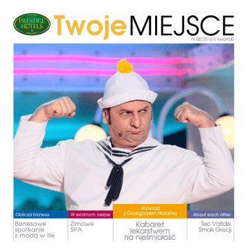nr 08/2013 (I kwartał) Oblicza biznesu W siódmym niebie Biznesowe spotkanie z modą w tle Zimowe SPA Wywiad z Grzegorzem Halamą Kabaret lekarstwem na nieśmiałość About each other Teo Vafidis: Smak Grecji Drodzy Spis treści Czytelnicy! Wywiad Kabaret lekarstwem na nieśmiałość Nowy rok zawsze kojarzy nam się ze zmianami. Robimy mniej lub bardziej szczegółowe plany, w których zakładamy osiągnięcie pewnych celów. Fundacja Polish Prestige Hotels & Resorts 2013 rok traktuje podobnie jak Państwo – jako nowe otwarcie, czas, który warto poświęcić na rozwój, na zmiany na lepsze. Naszym celem będzie nie tylko ugruntowanie swojej pozycji na rynku usług hotelarskich, ale, co niezwykle istotne, ciągły rozwój i powiększanie własnego portfolio obiektów. Chcemy stale podnosić jakość obsługi w obiektach zrzeszonych w PPH & R. Dążymy do tego, aby nasza oferta była jeszcze bardziej różnorodna. Chcemy również, aby „Twoje Miejsce” rozwijało się jako tytuł, aby mogli Państwo znaleźć w nim jeszcze więcej ciekawych informacji czy rozrywki. W 8. numerze naszego magazynu polecamy wywiad z Grzegorzem Halamą, który opowiada o swojej pracy, o tym, w jaki sposób rozśmiesza innych oraz skąd czerpie pomysły na kreowane postaci. Warto również poczytać o narciarstwie biegowym, które między innymi dzięki sukcesom Justyny Kowalczyk zdobywa coraz większą popularność. A po nartach proponujemy zabiegi relaksujące i regenerujące, przygotowane przez naszych specjalistów z gabinetów SPA specjalnie pod kątem pory zimowej. Z kolei w dziale „About each other” przybliżamy sylwetkę Teo Vafidisa – greckiego kucharza, biznesmena i miłośnika smaku, który mieszka w Polsce na stałe. Wyjaśnia, dlaczego wybrał Polskę, co mu się u nas podoba i dlaczego kuchnie grecka i polska są sobie bliskie. Wątek kulinarny również, jak zwykle, gości w dziale „Od kuchni”, gdzie nasi szefowie kuchni przygotowali smakowite i niebanalne przepisy. Życzę ciekawej lektury rozmowa z Grzegorzem Halamą Oblicza biznesu Biznesowe spotkanie z modą w tle W siódmym niebie Zimowe SPA About each other Smak Grecji Od kuchni Przepisy szefów kuchni Krzysztof Jędrocha Redaktor Naczelny Aktywnie jawna , D. Wajs spółka22, tel. 12 257 01 51 06 Group W. Ślaga Feniks Media 30-222 Kraków, fax: 12 263 Wydawca: how , 1D inach ul. Na Wierzc Redakcja: czelny: Krzysztof Jędrocha s Redaktor na wadzący: Michał Durba Redaktor pro ta Witkowska a Jancik, Korekta: Jolan egorz Chmielewski, Grażyn ta Pałac Współpraca: Grz-Miraś, Paweł Kawałek, Bea Aneta Szymczyk Studio DTP: dia: Jerzy Gorczyca stopka redakc yjna 04 l Kierownik stu ch Kleszcz, Krzysztof Kusiak @feniksmedia.p Graficy: Wojcie 62, marek.czaja tel. 12 263 06 a: Marek Czaja, lam rek i g tin Marke żu: niksmedia.pl kcji i kolporta produkcja@fe Dział produ hlowski, e-mail: Krzysztof Chac 698 Kraków; blowicka 63, 30sobie prawo z o.o., ul. Wró . Zastrzegamy zwracamy. Druk: ALNUS Sp. Shutterstock.com ki ionych nie liote bib z ałów niezamów wolone są wyłącznie no zdjęcia teri sta Ma . orzy łów wyk tytu doz zmiany eń. Miejsce“ W magazynie cji tekstów oraz ć reklam i ogłosz & Resorts Twoje skracania i adiustaynu „Polish Prestige Hotels akcja nie odpowiada za treśli ich treść lub forma Przedruki z magazmną zgodą wydawcy. Rednia ogłoszenia i reklamy, jeże (art. 36 pkt 4 Prawa pise cy cze aw nią iesz zed wyd z ić zam za upr terem pisma ora prawo odmów Wydawca ma linią programową lub charak ka Godlewska Kur są sprzeczne z ce: Katarzyna Foto na okład prasowego). Śladami Justyny Strefa gości Zdany egzamin 08 14 16 18 20 22 03 Kabaret lekarstwem na nieśmiałość 04 Foto: Andrzej Głuc Wywiad O tym, skąd wziął się pomysł na Pana Józka czy Śpiewającą Bakterię, o początkach kariery na scenie i jak to się dzieje, że rozśmiesza ludzi, rozmawiamy z Grzegorzem Halamą. Mieszka Pan w Zielonej Górze, nazywanej zagłębiem kabaretowym. Co tworzy ten specyficzny klimat, że kabarety w Zielonej pojawiały się zawsze, jak grzyby po deszczu? Jak to było z Panem? Fakt, iż pojawiło się tyle kabaretów, można zawdzięczać liderowi nieistniejącego już kabaretu Potem – Władysławowi Sikorze. Działalność kabaretu Potem ściśle wiązała się z klubem studenckim „Gęba” w Zielonej Górze. A jako że pojawiali się tam studenci, Władek chętnie organizował warsztaty i inicjował nowe grupy kabaretowe. Jeśli chodzi o mnie, do Zielonej Góry trafiłem już jako kabareciarz z pewnym doświadczeniem. Urodziłem się w Świdwinie, w byłym województwie koszalińskim. W technikum zacząłem przygodę z gitarą i poezją śpiewaną. Ze znajomymi tworzyłem zespół Bańka-Band pod kierownictwem artystycznym Haliny Bańkowskiej. Następnie z kolegą z tego zespołu – Krzyśkiem Palą – stworzy- liśmy zespół OBSESJA. Trudno ocenić rodzaj muzyki, jaki tworzyliśmy – to był krok między poezją śpiewana, rockiem a teatrem. Do kabaretu zaprosił mnie kolega. I to były pierwsze doświadczenia z kabaretem. Wtedy była moja pierwsza PAKA – festiwal kabaretowy – gdzie widziałem premiery „Bajek” kabaretu Potem i pierwszych poczynań zespołu Raz Dwa Trzy. Wkrótce przeprowadziłem się do Krakowa, gdzie trafiłem do Grupy Rafała Kmity. Ostatecznie poznałem niewiarygodnie charyzmatycznego Damiana Rogala, zacząłem z nim pracować, ale postanowiłem się sprawdzić w kabarecie jako wykonawca solowy, zainspirowany działaniami Damiana. Zdobywałem nagrody na festiwalach kabaretowych i ostatecznie, zakochany nieprzytomnie w Asi z Potemów, przeprowadziłem się do Zielonej Góry. Tam pracowałem z całym kabaretowym środowiskiem, będąc współautorem tekstów (między innymi kabaretów: Potem, Jurki, Ciach, Szum i innych eksperymentalnych formacji), tworząc filmy w ramach Wytwórni A YOY, zdobywając nowe doświadczenia. Występowałem zarówno solowo, jak i tworz