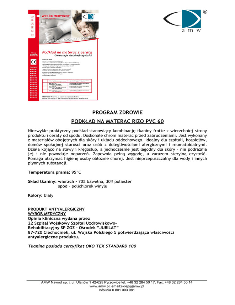 PROGRAM ZDROWIE PODKŁAD NA MATERAC RIZO PVC 60 Niezwykle praktyczny podkład stanowiący kombinację tkaniny frotte z wierzchniej strony produktu i ceraty od spodu. Doskonale chroni materac przed zabrudzeniami. Jest wykonany z materiałów obojętnych dla skóry i układu oddechowego. Idealny dla szpitali, hospicjów, domów spokojnej starości oraz osób z dolegliwościami alergicznymi i reumatoidalnymi. Działa kojąco na stawy i kręgosłup, a jednocześnie jest łagodny dla skóry – nie podrażnia jej i nie powoduje odparzeń. Zapewnia pełną wygodę, a zarazem sterylną czystość. Pomaga utrzymać higienę osoby obłożnie chorej. Jest nieprzepuszczalny dla wody i innych płynnych substancji. Temperatura prania: 95°C Skład tkaniny: wierzch - 70% bawełna, 30% poliester spód – polichlorek winylu Kolory: biały PRODUKT ANTYALERGICZNY WYRÓB MEDYCZNY Opinia kliniczna wydana przez 22 Szpital Wojskowy Szpital UzdrowiskowoRehabilitacyjny SP ZOZ – Ośrodek ”JUBILAT” 87-720 Ciechocinek, ul. Wojska Polskiego 5 potwierdzająca właściwości antyalergiczne produktu. Tkanina posiada certyfikat OKO TEX STANDARD 100 AMW Nawrot sp. j. ul. Ułanów 1 42-625 Pyrzowice tel. +48 32 284 50 17, Fax. +48 32 284 50 14 www.amw.pl; email:[email protected] Infolinia 0 801 003 081