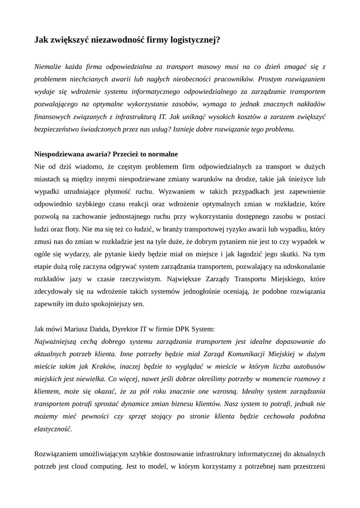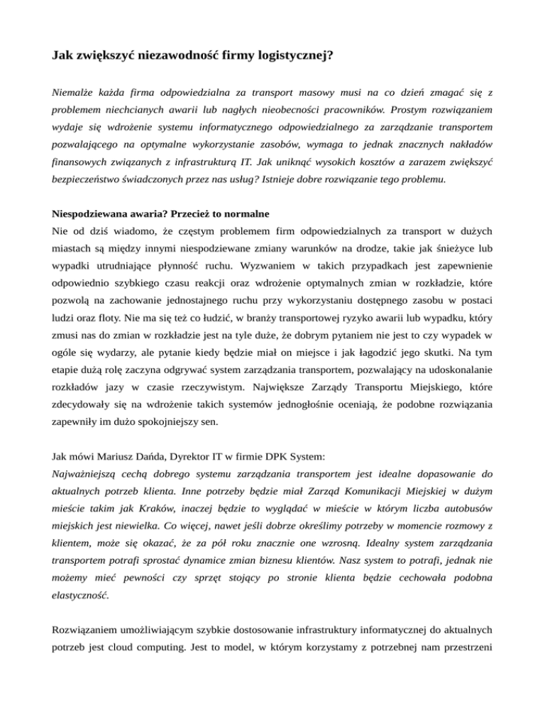 Jak zwiększyć niezawodność firmy logistycznej? Niemalże każda firma odpowiedzialna za transport masowy musi na co dzień zmagać się z problemem niechcianych awarii lub nagłych nieobecności pracowników. Prostym rozwiązaniem wydaje się wdrożenie systemu informatycznego odpowiedzialnego za zarządzanie transportem pozwalającego na optymalne wykorzystanie zasobów, wymaga to jednak znacznych nakładów finansowych związanych z infrastrukturą IT. Jak uniknąć wysokich kosztów a zarazem zwiększyć bezpieczeństwo świadczonych przez nas usług? Istnieje dobre rozwiązanie tego problemu. Niespodziewana awaria? Przecież to normalne Nie od dziś wiadomo, że częstym problemem firm odpowiedzialnych za transport w dużych miastach są między innymi niespodziewane zmiany warunków na drodze, takie jak śnieżyce lub wypadki utrudniające płynność ruchu. Wyzwaniem w takich przypadkach jest zapewnienie odpowiednio szybkiego czasu reakcji oraz wdrożenie optymalnych zmian w rozkładzie, które pozwolą na zachowanie jednostajnego ruchu przy wykorzystaniu dostępnego zasobu w postaci ludzi oraz floty. Nie ma się też co łudzić, w branży transportowej ryzyko awarii lub wypadku, który zmusi nas do zmian w rozkładzie jest na tyle duże, że dobrym pytaniem nie jest to czy wypadek w ogóle się wydarzy, ale pytanie kiedy będzie miał on miejsce i jak łagodzić jego skutki. Na tym etapie dużą rolę zaczyna odgrywać system zarządzania transportem, pozwalający na udoskonalanie rozkładów jazy w czasie rzeczywistym. Największe Zarządy Transportu Miejskiego, które zdecydowały się na wdrożenie takich systemów jednogłośnie oceniają, że podobne rozwiązania zapewniły im dużo spokojniejszy sen. Jak mówi Mariusz Dańda, Dyrektor IT w firmie DPK System: Najważniejszą cechą dobrego systemu zarządzania transportem jest idealne dopasowanie do aktualnych potrzeb klienta. Inne potrzeby będzie miał Zarząd Komunikacji Miejskiej w dużym mieście takim jak Kraków, inaczej będzie to wyglądać w mieście w którym liczba autobusów miejskich jest niewielka. Co więcej, nawet jeśli dobrze określimy potrzeby w momencie rozmowy z klientem, może się okazać, że za pół roku znacznie one wzrosną. Idealny system zarządzania transportem potrafi sprostać dynamice zmian biznesu klientów. Nasz system to potrafi, jednak nie możemy mieć pewności czy sprzęt stojący po stronie klienta będzie cechowała podobna elastyczność. Rozwiązaniem umożliwiającym szybkie dostosowanie infrastruktury informatycznej do aktualnych potrzeb jest cloud computing. Jest to model, w którym korzystamy z potrzebnej nam przestrzeni dyskowej, jednak fizyczne serwery znajdują się w zupełnie innym miejscu – możemy dowolnie zwiększać lub zmniejszać ich ilość bez potrzeby inwestycji w nowy sprzęt. W poszukiwaniu elastyczności bez ryzyka – cloud computing Logika podpowiada, że kiedy zależy nam na bezawaryjności powinniśmy się skupić na minimalizowaniu czynników zwiększających stopień potencjalnego ryzyka. W praktyce, biorąc pod uwagę branżę transportową, stwierdzenie to nie jest jednak tak proste do zrealizowania, bo o ile istnieją pewne elementy na które mamy wpływ, to czynników które są od nas niezależne jest zdecydowanie więcej. Mowa tu o wszystkich radykalnych zamianach pogody, takich jak śnieżyce czy nagłe załamania pogody oraz o czynnikach ludzkich, których korowód rozpoczynają wypadki drogowe a zamykają niespodziewane spóźnienia do pracy, nagłe choroby i tym podobne. Z pogodą raczej nie wygramy jednak zdecydowanie możemy popracować nad tym, by system optymalnie zarządzał czasem pracy pracowników oraz by on sam nie uległ nagłej awarii. Dzięki implementacji systemu transportowego na tak zwanej chmurze firmy są w stanie zyskać niezawodność i elastyczność, która wcześniej była niemożliwa do uzyskania, to co kiedyś wymagało od nas kilku tygodni teraz może być zrealizowane jeszcze tego samego dnia. Przykładowo dodanie nowych fizycznych serwerów dedykowanych w tradycyjnych modelach może trwać nawet 2 tygodnie, podczas gdy zwiększenie zasobów w modelu cloudowym nie powinno zająć więcej niż 30 minut. Powodem dla którego zaczęliśmy się zastanawiać nad tym, by wdrażać nasz system na tzw. chmurze było właśnie dążenie do większej elastyczności i zwiększenia dostępności naszego systemu. Kiedyś, gdy tworzyliśmy parametry środowiska informatycznego, na którym powinien działać Transportowy System Informatyczny, nigdy nie mieliśmy 100 % pewności, że zachowa on ciągłość swojego działania z przyczyn zupełnie od nas niezależnych. Zazwyczaj firmy, nawet te o bardzo stabilnej pozycji rynkowej, nie dysponują wystarczająco wydajnym sprzętem a koszty inwestycji w nową infrastrukturę informatyczną są stosunkowo wysokie. Dlatego dobrym rozwiązaniem okazała się moc obliczeniowa dostarczana nam przez najnowocześniejsze data center w Polce. Chmura udostępniana przez Polcom pozwala nam na skalowanie środowiska informatycznego i dokładnie dodatkowych elementów według potrzeb naszych klientów. Daje nam to pewność tego, że niezależnie od tego jak będą się one zmieniać, nasz system będzie mógł się do tego szybko przystosować i działać wydajnie, to z kolei jest dla nas gwarancją satysfakcji naszych klientów – mówi Mariusz Dańda. Z głową w chmurach – co to zmienia? W przypadku DPK, obsługującego tak strategicznych przewoźników jak Przewozy Regionalne czy przedsiębiorstwa komunikacji miejskiej, takie podejście okazało się kluczowe. Dzięki oferowaniu klientom rozwiązań opartych o cloud computing całość systemu zyskała niezawodność i elastyczność: Kiedy współpracuje się z takimi klientami jak komunikacja miejska w dużej aglomeracji czy spółki kolejowe jak np. Przewozy Regionalne to trzeba sobie zdawać sprawę z tego, że bezawaryjność jest
