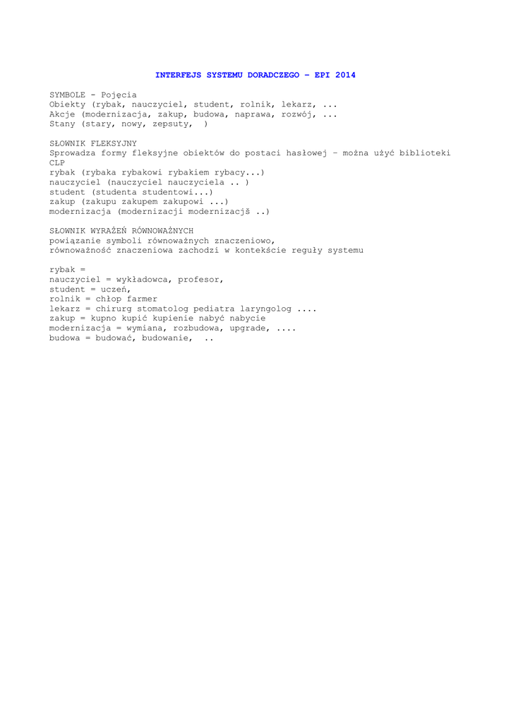 INTERFEJS SYSTEMU DORADCZEGO – EPI 2014 SYMBOLE - Pojęcia Obiekty (rybak, nauczyciel, student, rolnik, lekarz, ... Akcje (modernizacja, zakup, budowa, naprawa, rozwój, ... Stany (stary, nowy, zepsuty, ) SŁOWNIK FLEKSYJNY Sprowadza formy fleksyjne obiektów do postaci hasłowej – można użyć biblioteki CLP rybak (rybaka rybakowi rybakiem rybacy...) nauczyciel (nauczyciel nauczyciela .. ) student (studenta studentowi...) zakup (zakupu zakupem zakupowi ...) modernizacja (modernizacji modernizacjš ..) SŁOWNIK WYRAŻEŃ RÓWNOWAŻNYCH powiązanie symboli równoważnych znaczeniowo, równoważność znaczeniowa zachodzi w kontekście reguły systemu rybak = nauczyciel = wykładowca, profesor, student = uczeń, rolnik = chłop farmer lekarz = chirurg stomatolog pediatra laryngolog .... zakup = kupno kupić kupienie nabyć nabycie modernizacja = wymiana, rozbudowa, upgrade, .... budowa = budować, budowanie, .. STRUKTURY (reguły systemu doradczego) JEŻELI JEŻELI JEŻELI JEŻELI JEŻELI JEŻELI JEŻELI JEŻELI JEŻELI rybak TO złomowanie statku rybak TO naprawa statku rybak TO zmiana zawodu rolnik TO budowa stodoły rolnik TO zakup nowego traktora rolnik TO zmiana zawodu lekarz TO modernizacja gabinetu lekarz TO zakup komputera lekarz TO szkolenie ALGORYTM NA WEJŚCIU zapytanie użytkownika: Np. Jestem rybakiem czy mogę założyć uniwersytet A. IDENTYFIKACJA SYMBOLI Za pomocą słowników 1. słownik fleksyjny 2. słownik symboli 3. słownik symboli równoważnych Wynik: == rybak założyć uniwersytet B. DOPASOWANIE LISTY WYRAZÓW ZIDENTYFIKOWANYCH W PYTANIU DO REGUŁY Jeżeli rybak TO złomowanie statków Jeżeli rybak TO naprawa statków Jeżeli rybak TO zmiana zawodu C. OCENA DOPASOWANIA I GENEROWANIE ODPOWIEDZI a. gdy dopasowana tylko lewa strona reguły odpowiedź według schematu: === NIE <lewa strona reguły> możliwe: <prawa strona reguły>, w której pojawi się <lewa strona>, np. rybak możliwe: złomowanie statków, naprawa statków b. gdy dopasowana tylko prawa strona reguły odpowiedź według schematu: === NIE: <lewa strona reguły> niemożliwe: <prawa strona reguły> np. rybak niemożliwe: złożyć uniwersytet c. gdy uda się dopasować lewą i prawą stronę reguły odpowiedź według schematu: === TAK: <lewa strona reguły> możliwe: <prawa strona reguły> np. rybak możliwe: złomowanie statków WYMAGANIA Symbole Obiekty - Sprawca Akcji - minimum 10 - Obiekt podlegajšcy akcji - minimum 10 Stany Każdemu obiektowi, który podlega akcji przysługują minimum 2 stany Akcje Każdy Obiekt Sprawca jest sprawcą minimum 3 akcji Interfejs użytkownika Interfejs www: 1. pytanie i odpowiedź 2. Podgląd słowników i reguł W. Lubaszewski